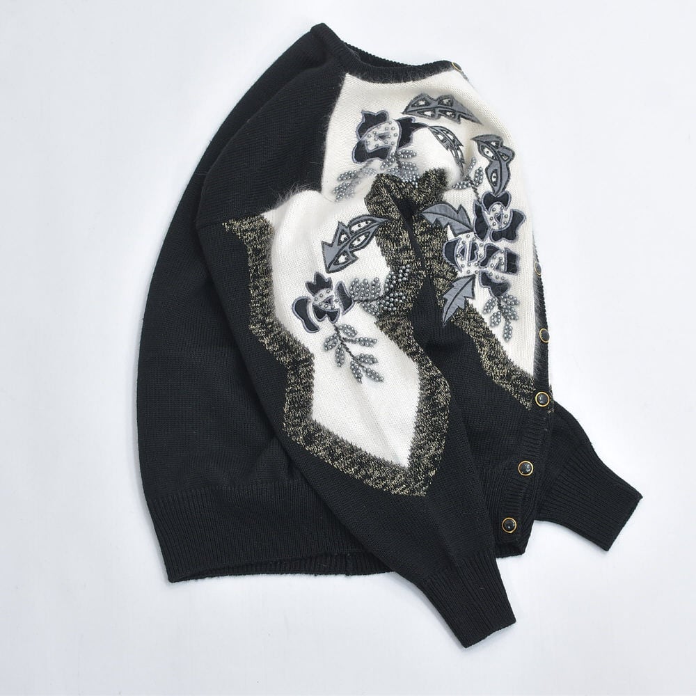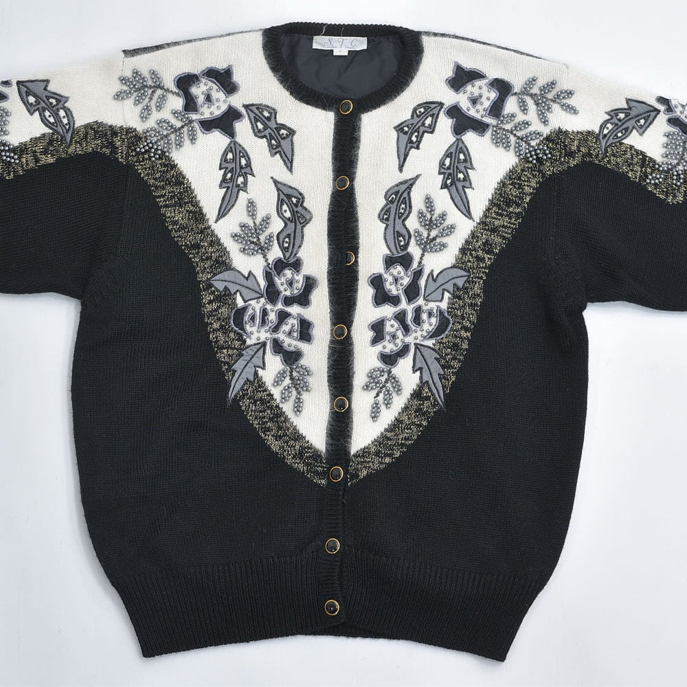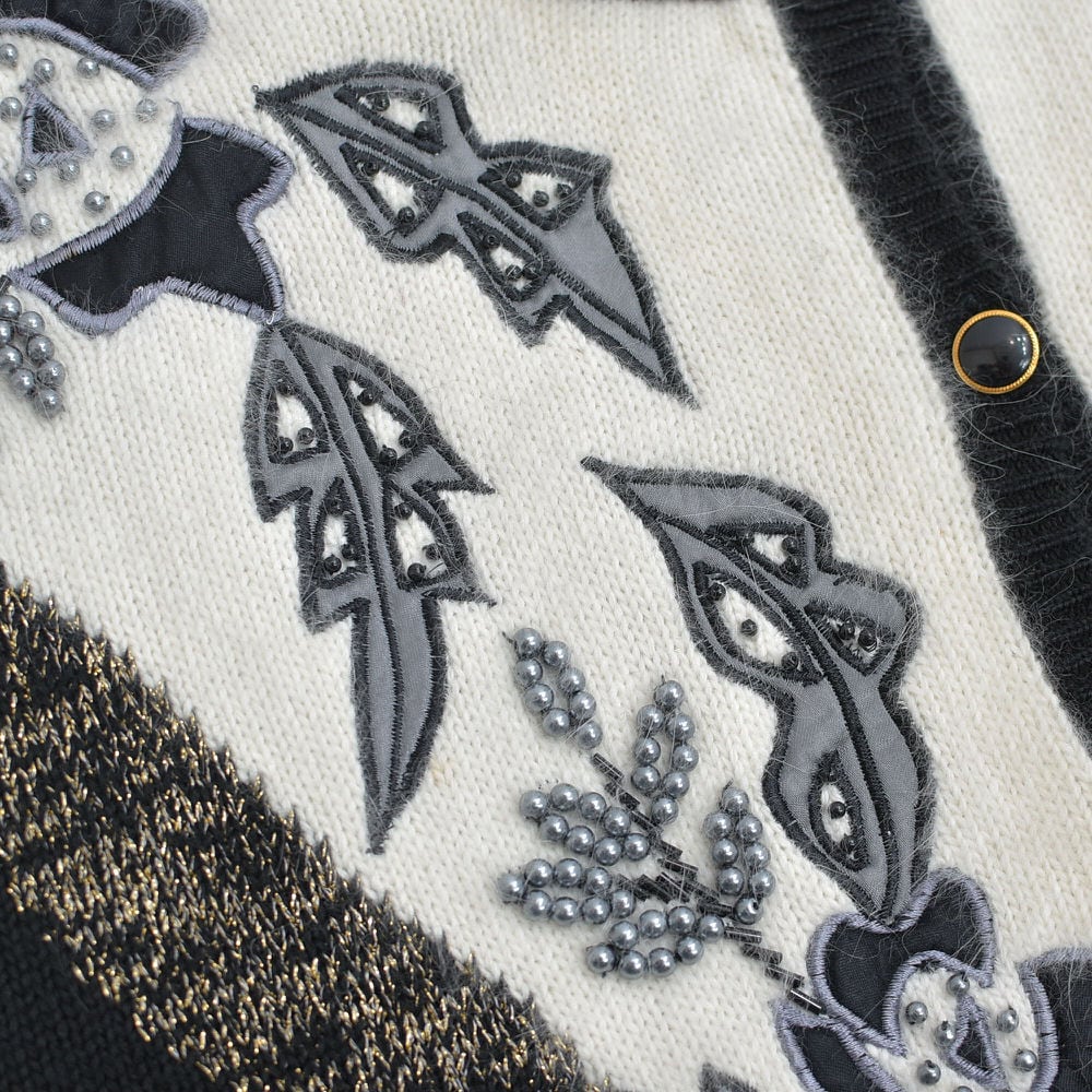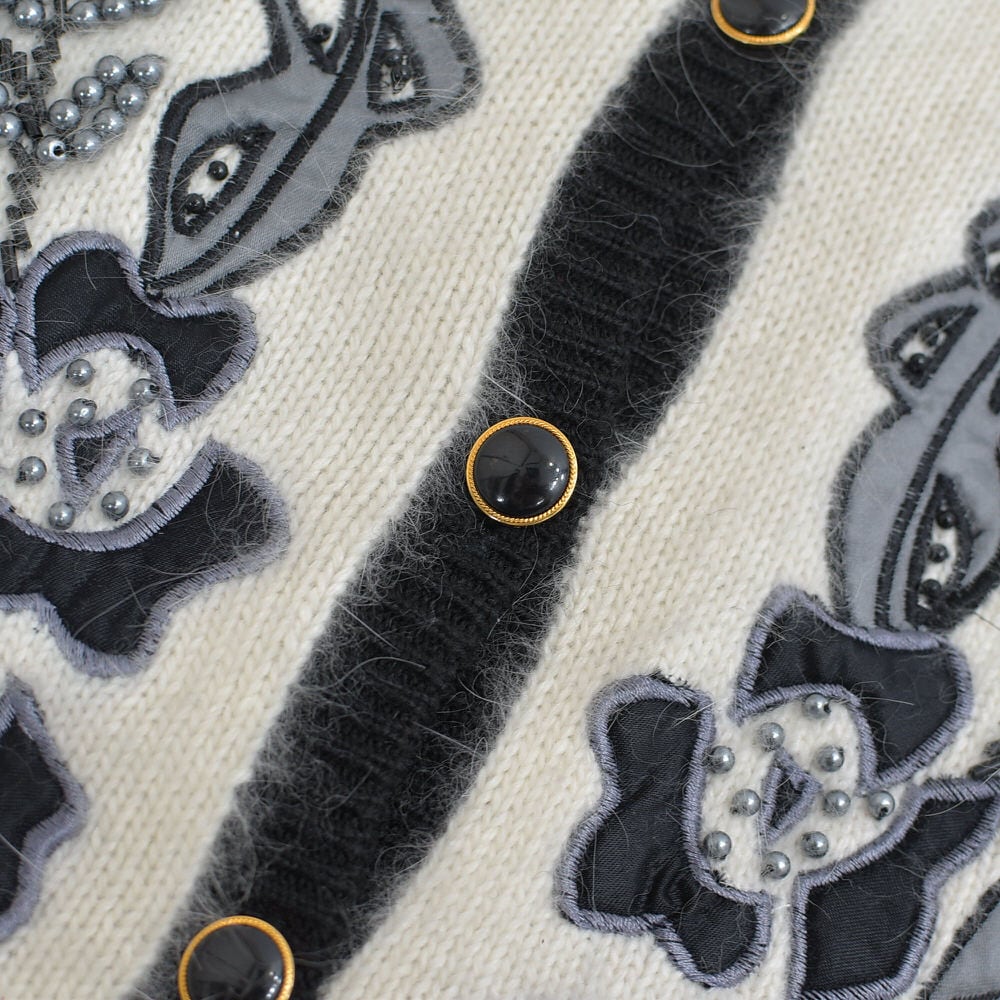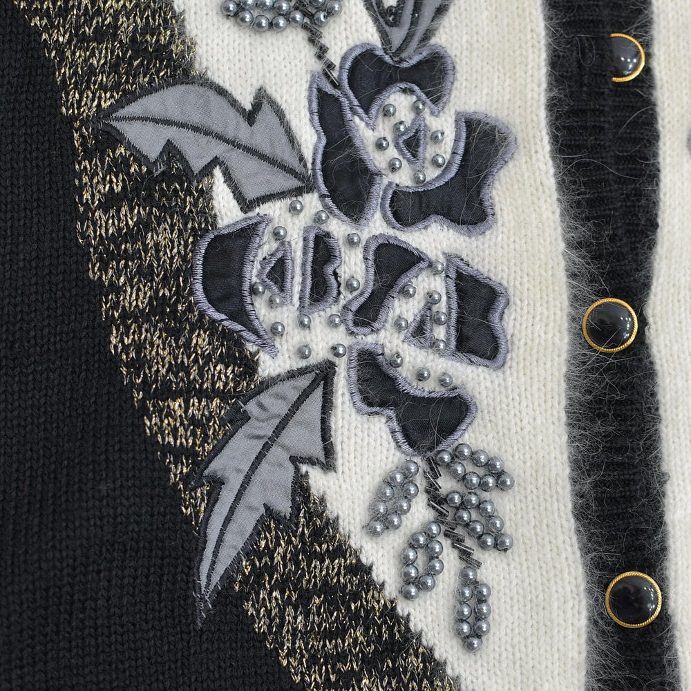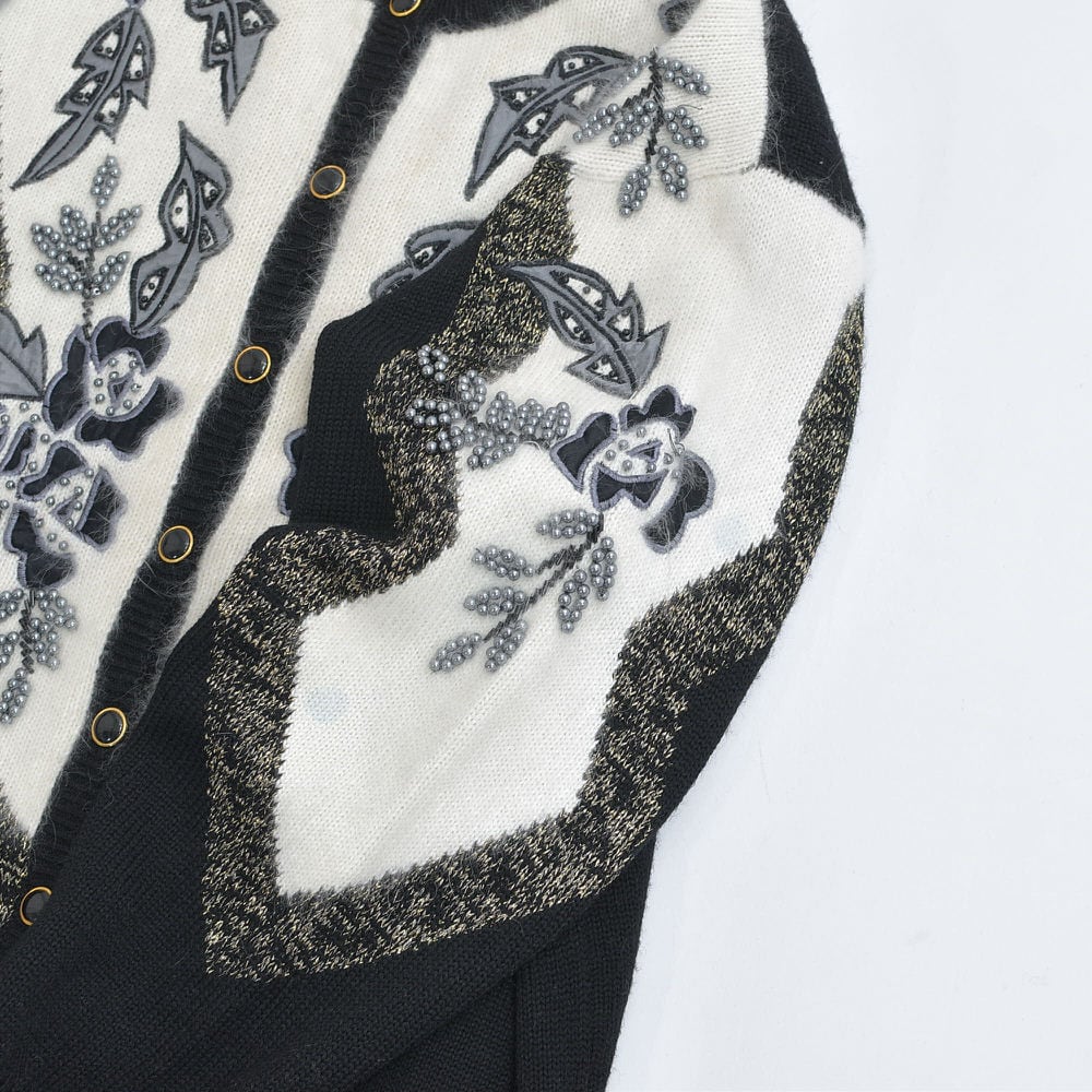 80〜90s S.T.C. デコレーション ビーズ パッチワーク 刺繍 デザイン バイカラー ニット カーディガン ブラック ホワイト アンゴラタッチ ヴィンテージ ビンテージ 古着 レディースL相当