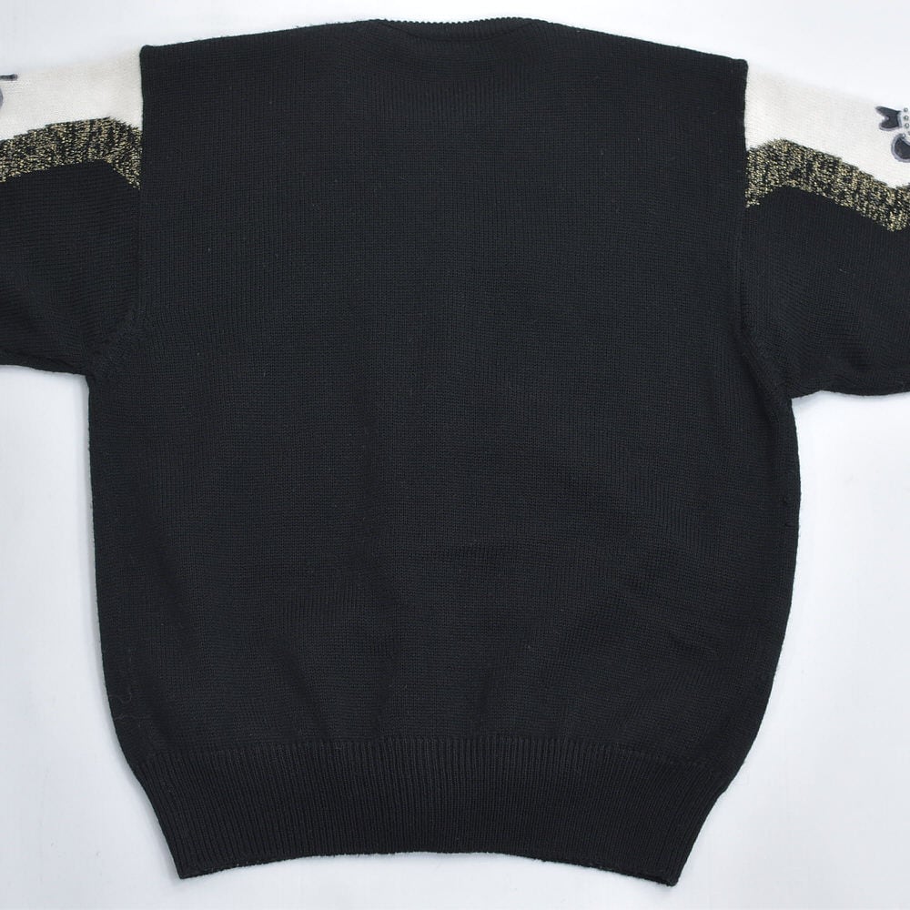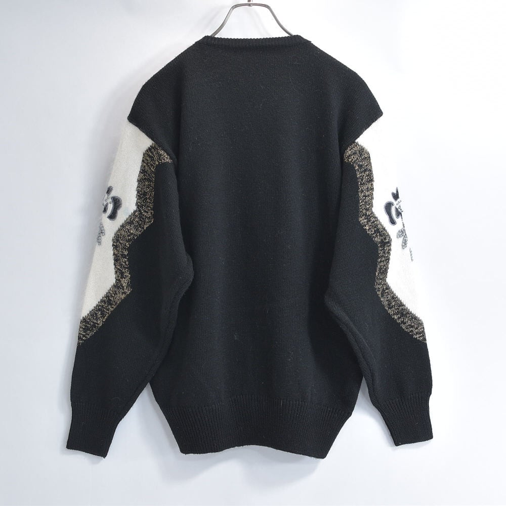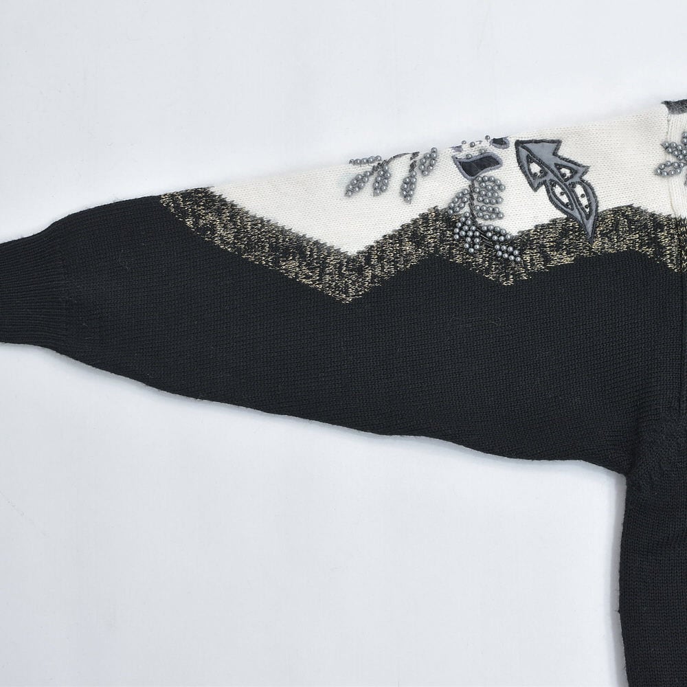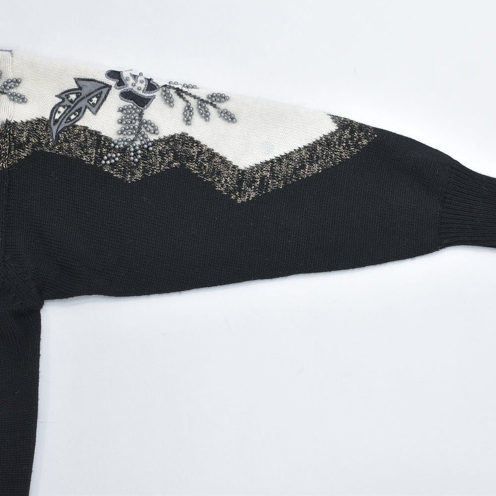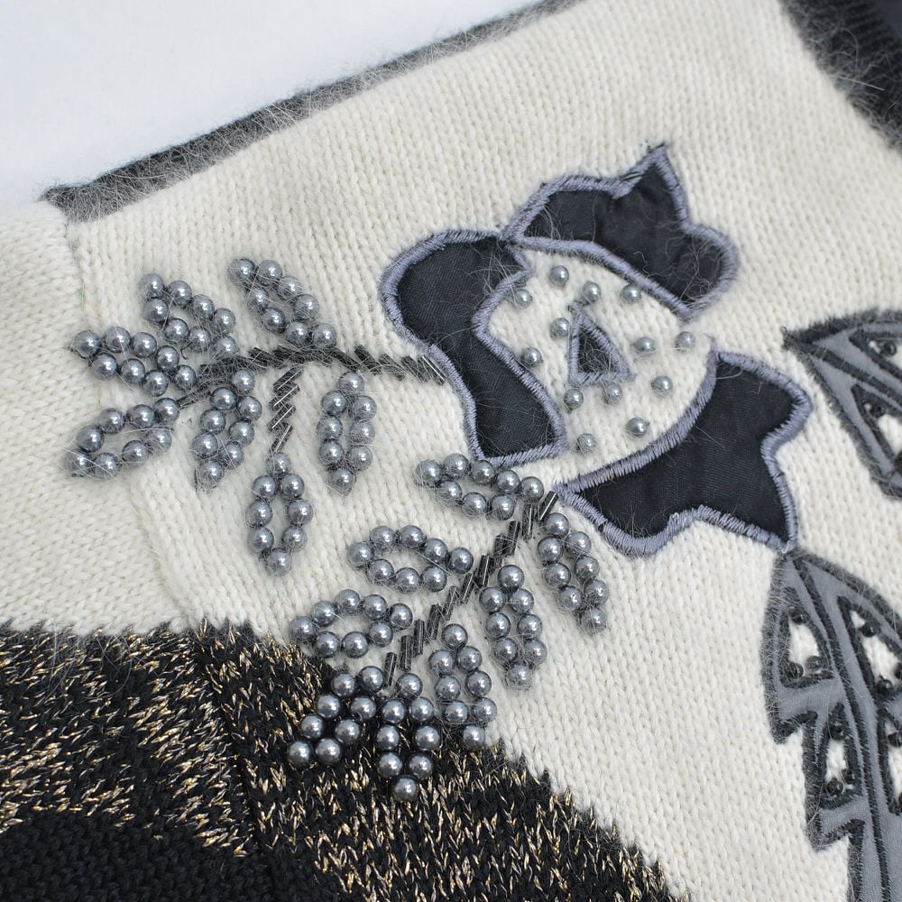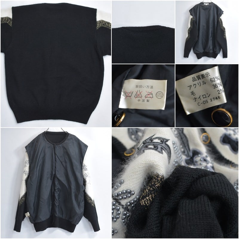 80〜90s S.T.C. デコレーション ビーズ パッチワーク 刺繍 デザイン バイカラー ニット カーディガン ブラック ホワイト アンゴラタッチ ヴィンテージ ビンテージ 古着 レディースL相当