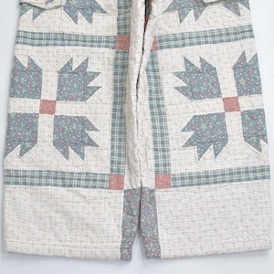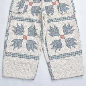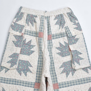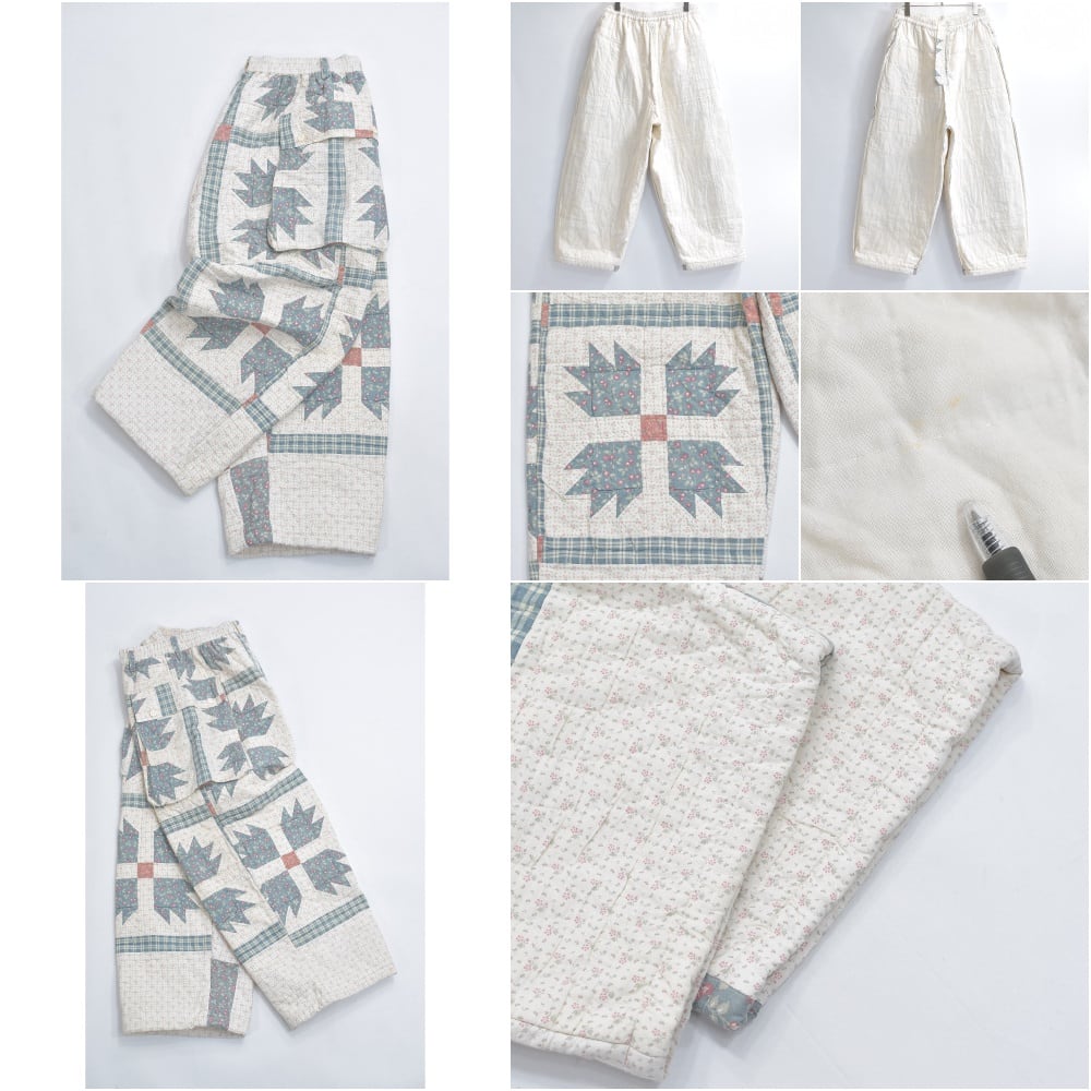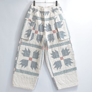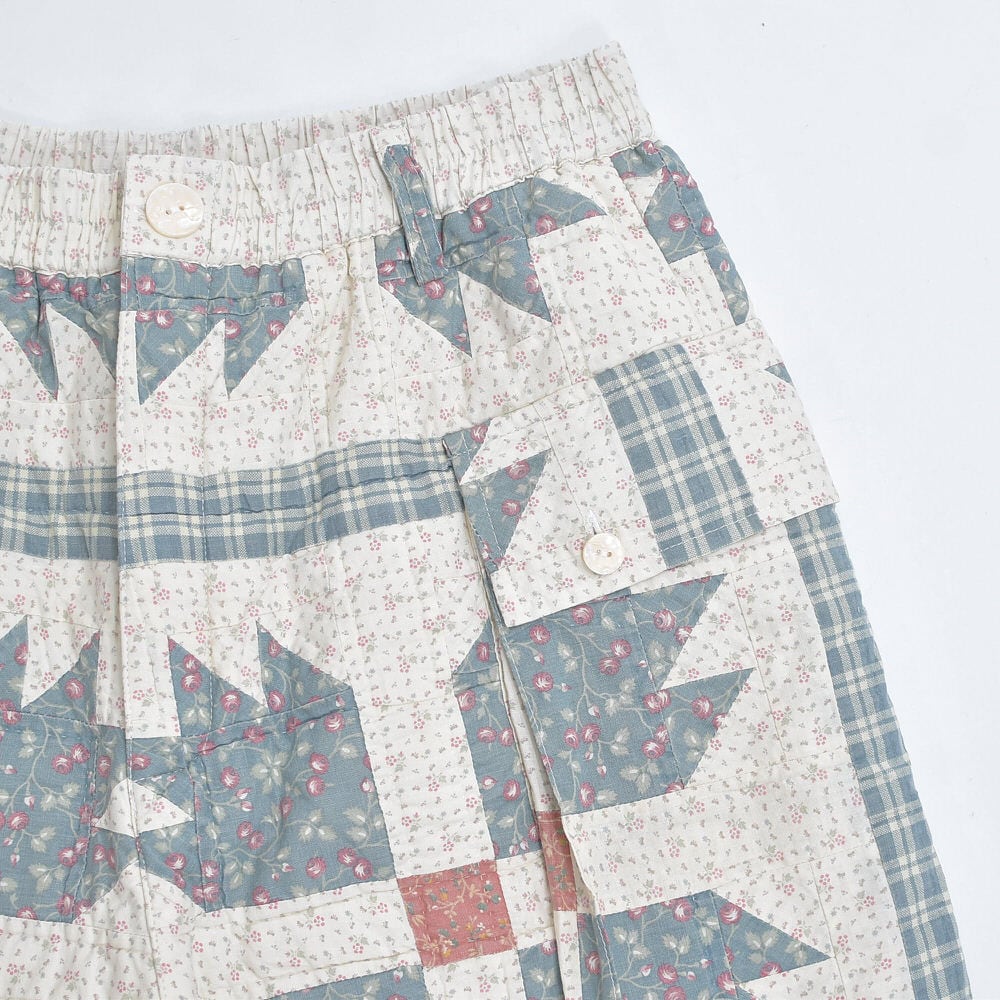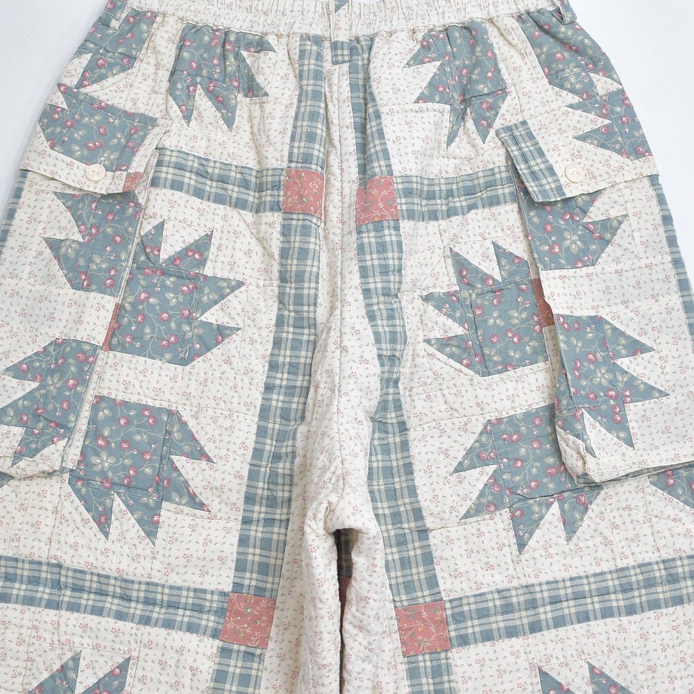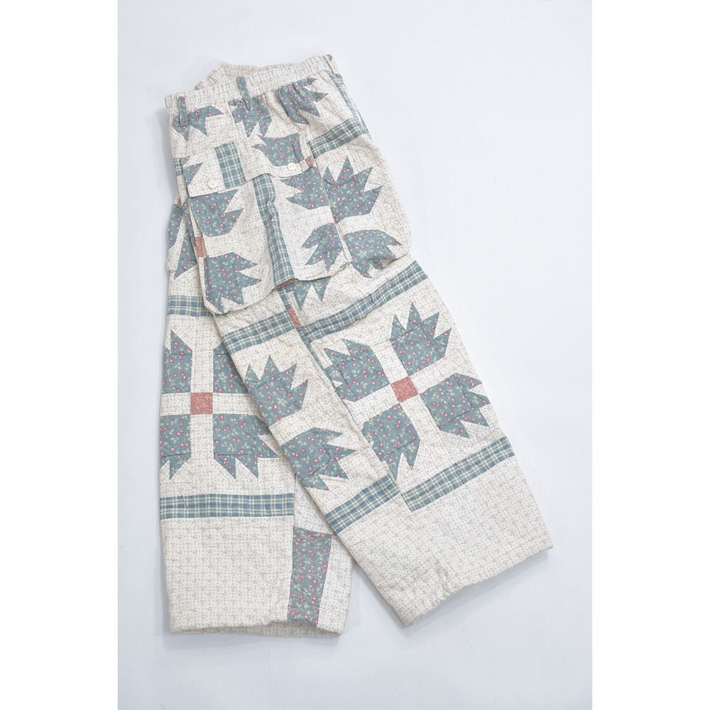 可愛らしいお花が描かれた生地や淡いチェックパターンの生地を使ったパッチワークキルトの生地を、カーゴポケット付きのボトムスに再構築したリメイクパンツ