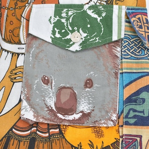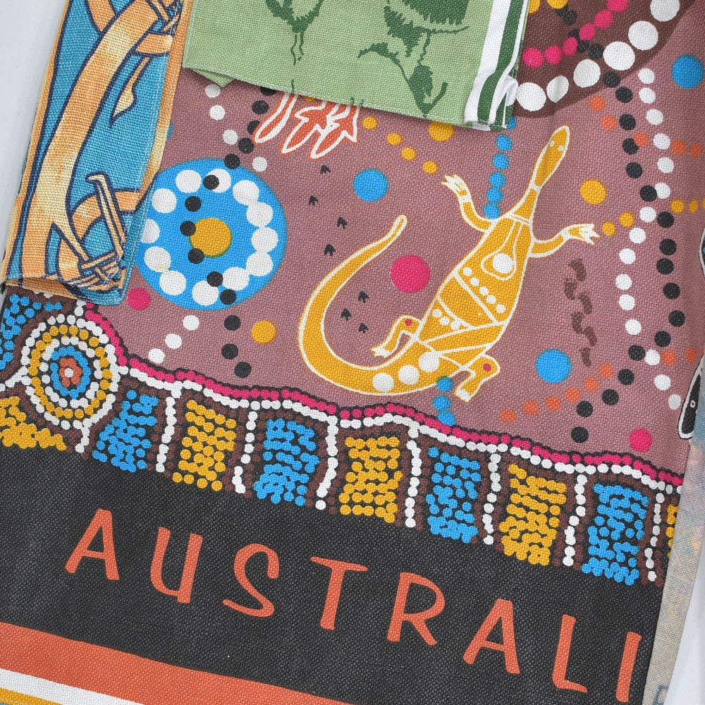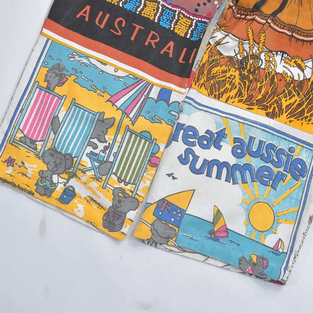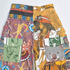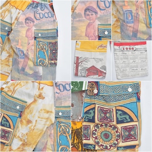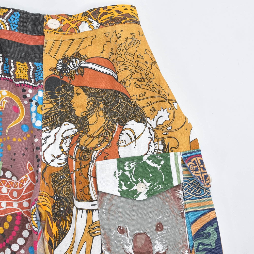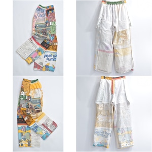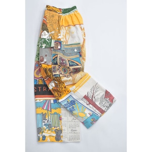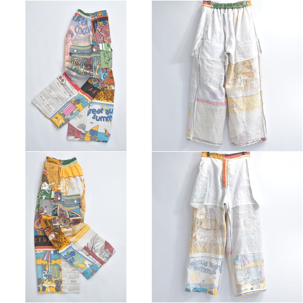 ティータオルやカレンダーの色んな生地を丁寧に繋ぎ合わせて一本のパンツに仕上げたリメイクパンツ