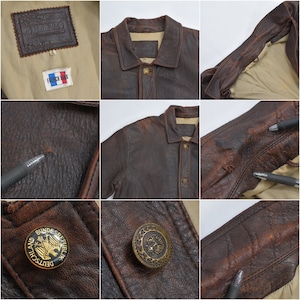 ・使用感や、全体的なエイジングによる退色、画像のように内襟や右デコルテ、ボタンホール、左二の腕付近、左脇、右脇腹付近などの剥がれによるキズのダメージや、袖口や縫い合わせ部分の擦れキズ、第一ボタンの付替リペア、裏地の全体的な色褪せ、など色々とあります