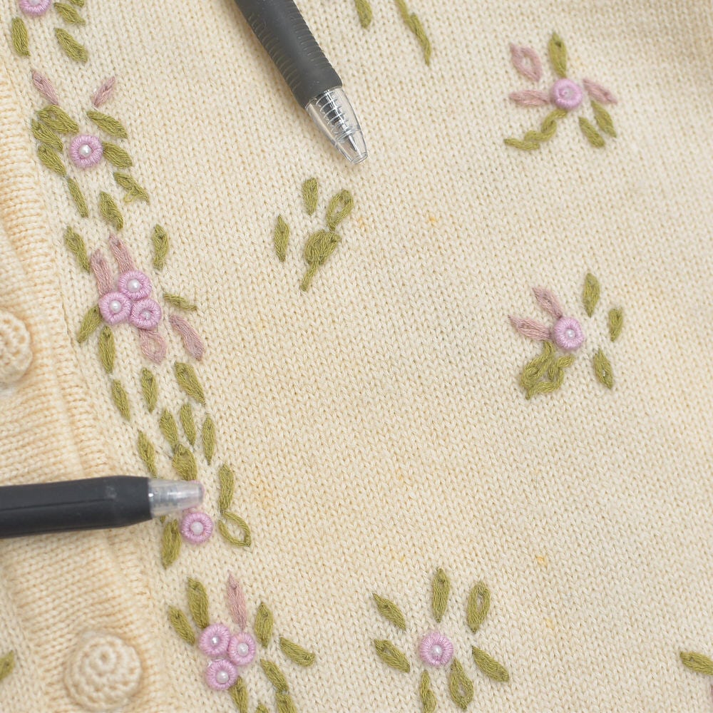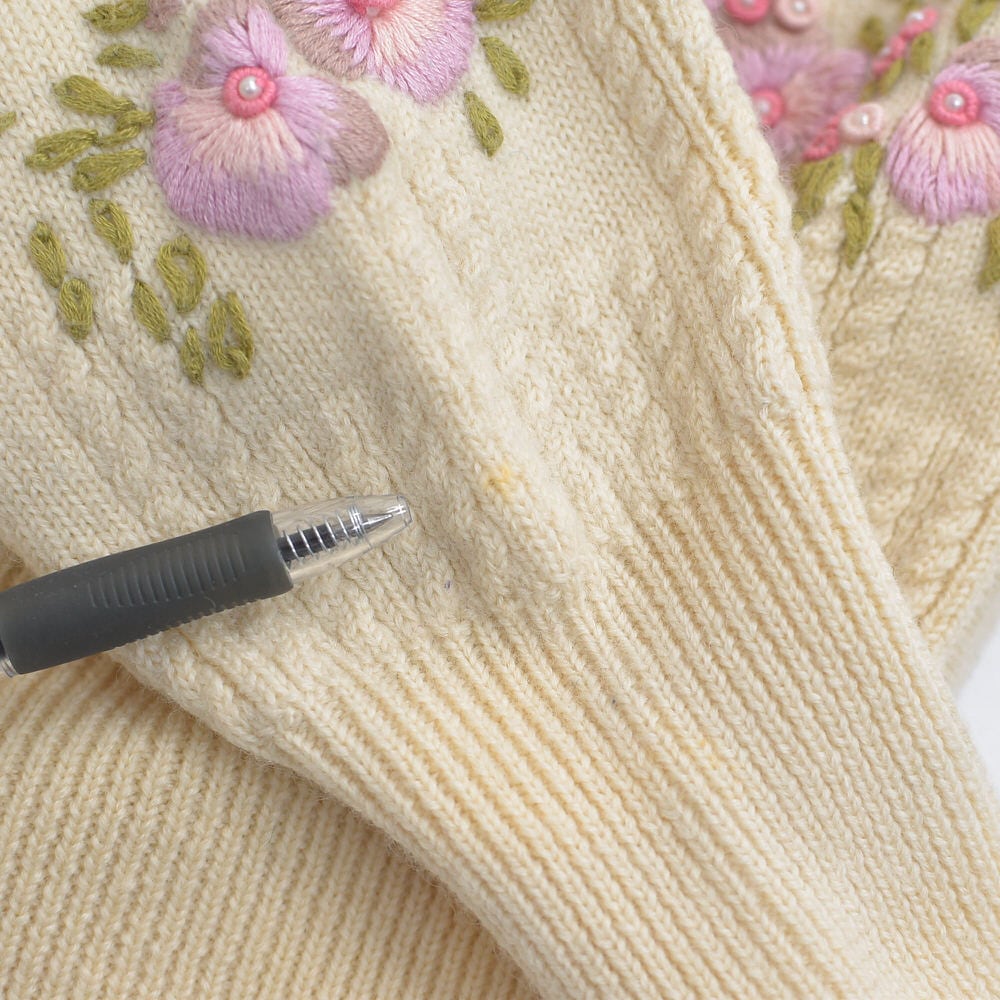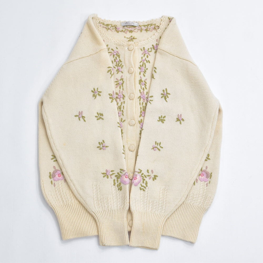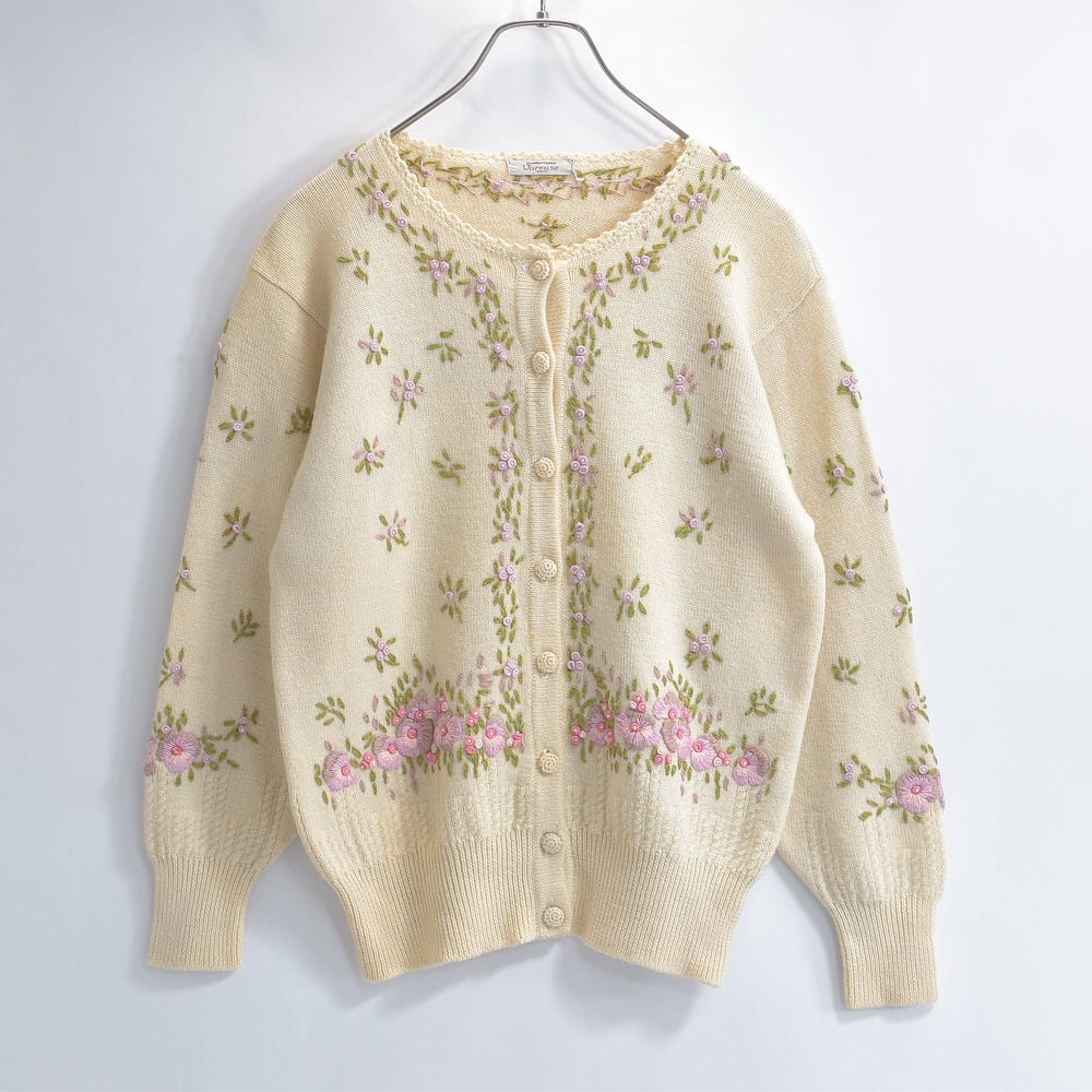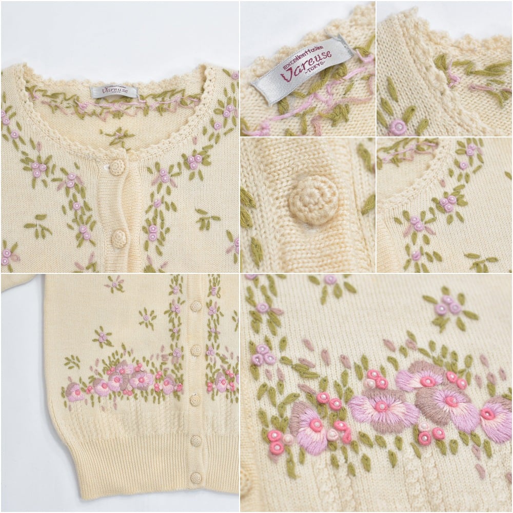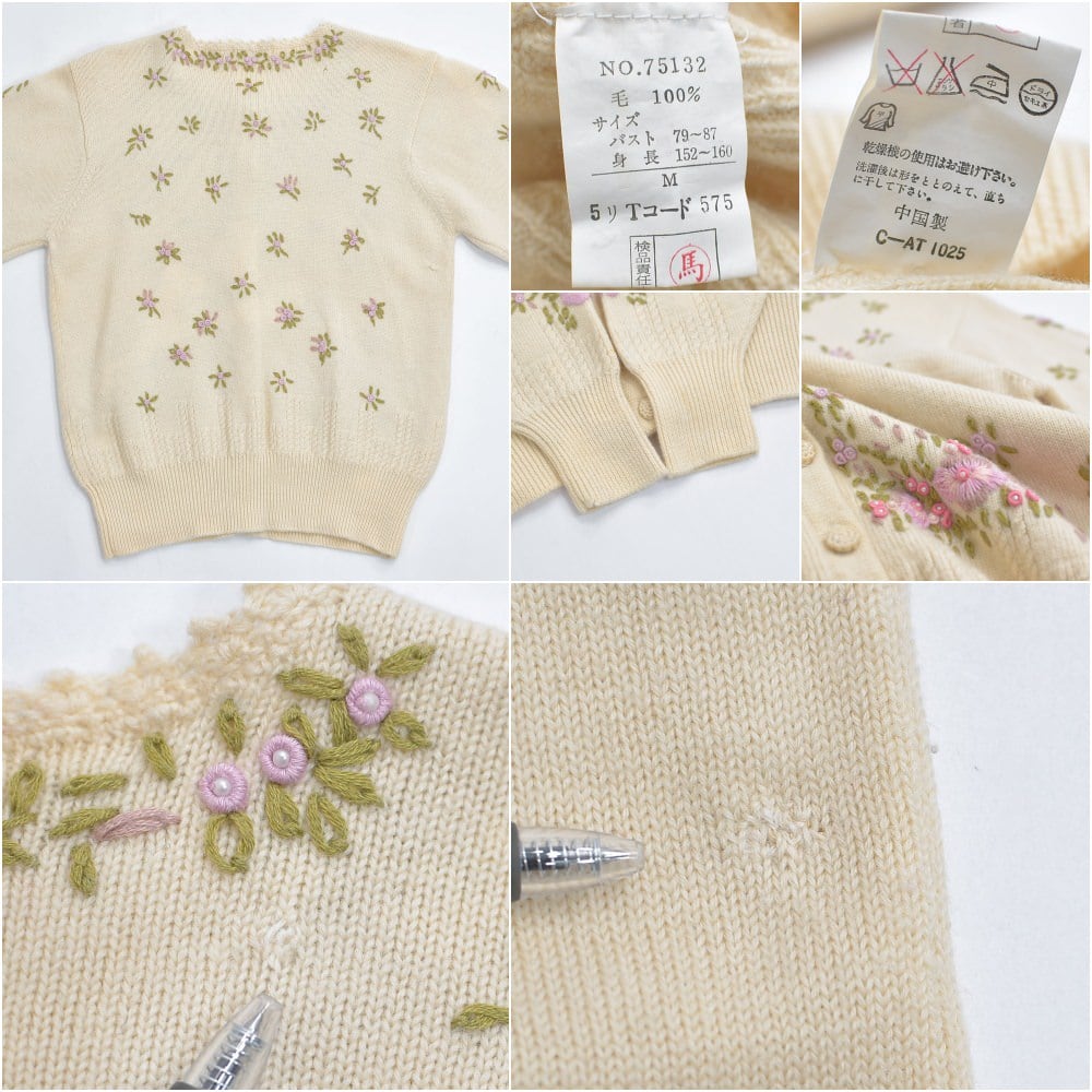 90~s Vareuse ヴァルーズ 花柄 ハンド刺繍 ビーズデコレーション レトロ デザイン ウール ニット カーディガン ジャパンヴィンテージ ビンテージ 古着 アイボリー レディースMサイズ