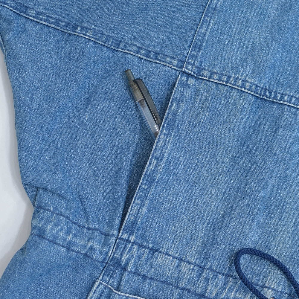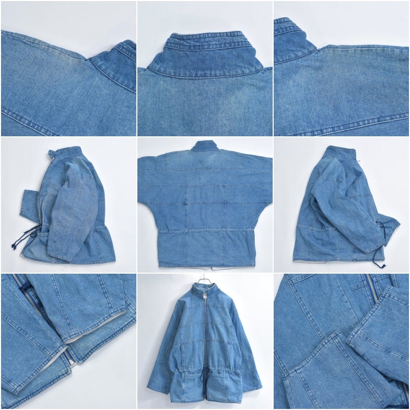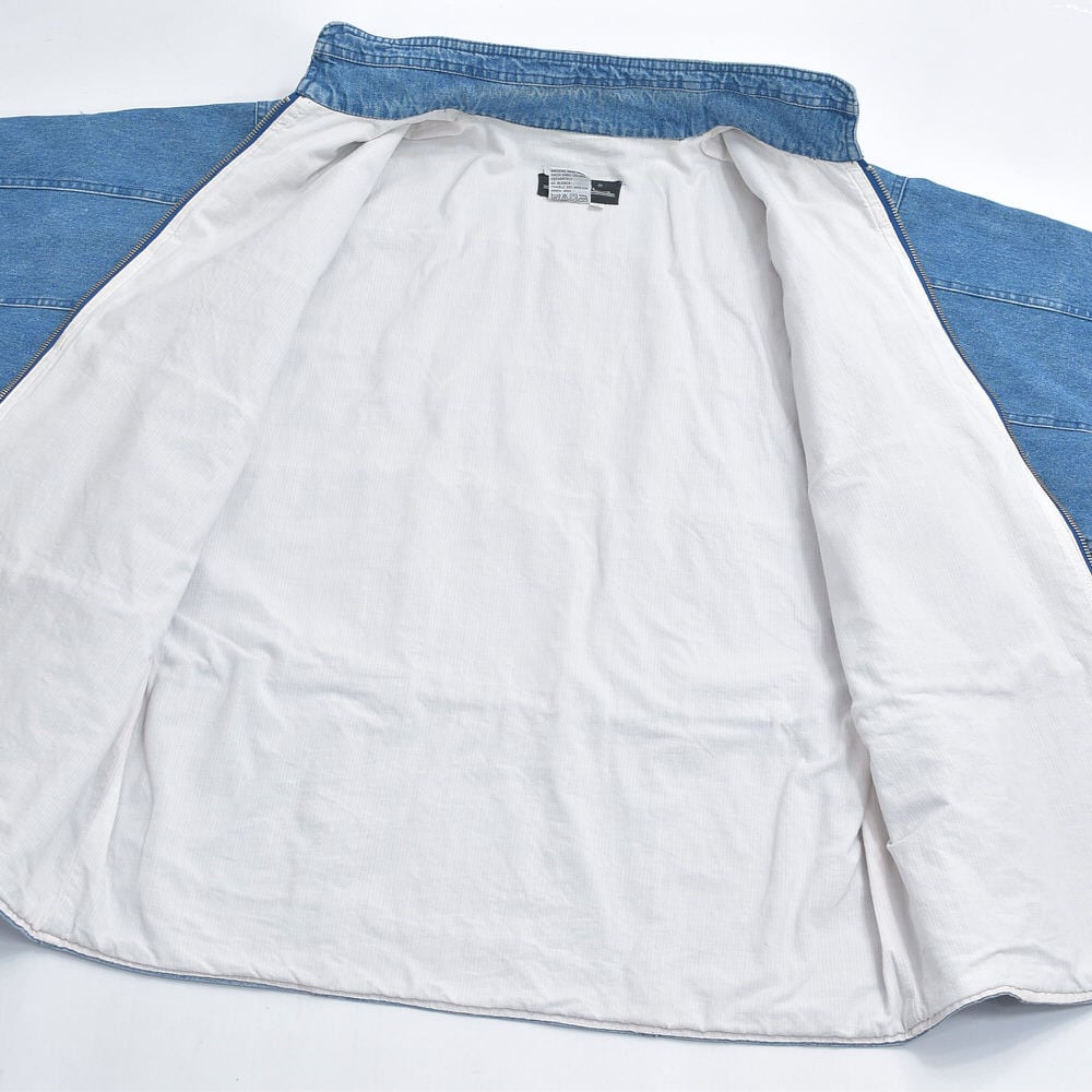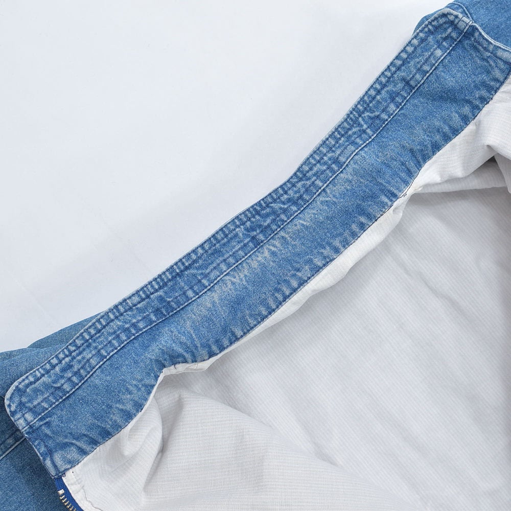 ・使用感や、全体的なデニム特有の色褪せ、画像のように内襟周りや右襟付け根付近の薄いシミや、裏地右肩付近のシミや右手首付近のパッチリペア跡などありますが、その他目立つ汚れ、ダメージは見当たらず、日常的に古着を着用されている方であれば、問題無く着用して頂けると思います