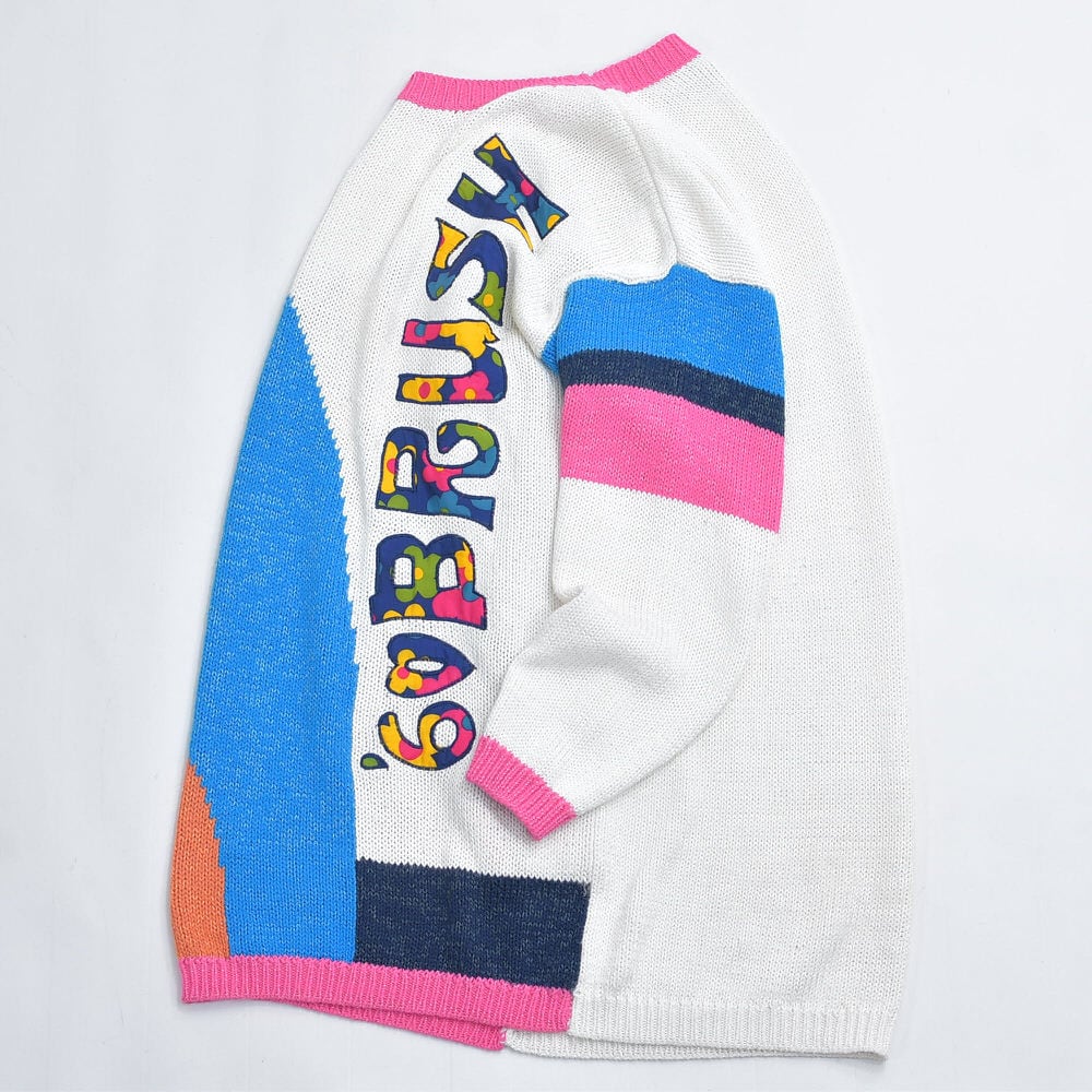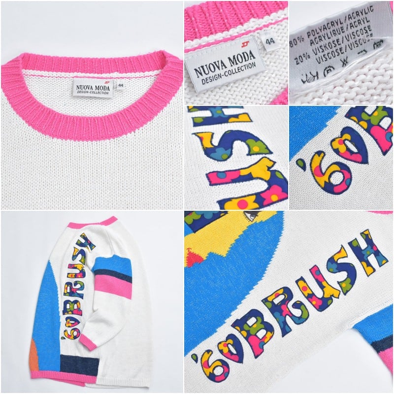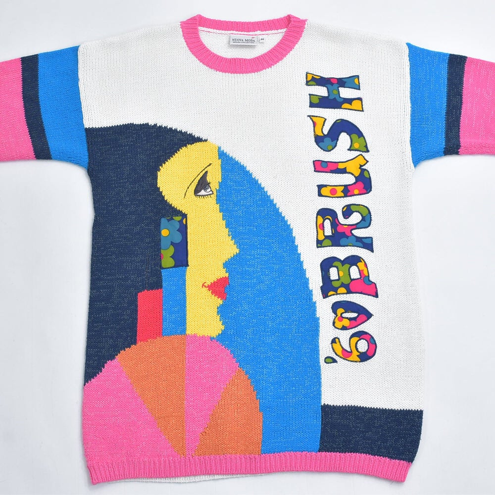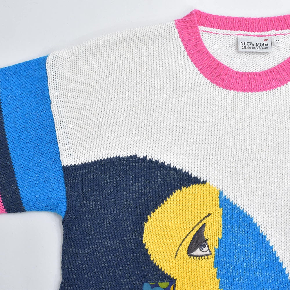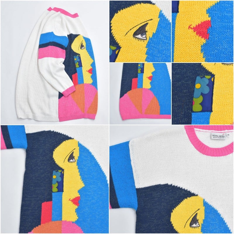 90s Used NUOVA MODA ヌォーヴァモーダ アートフェイス 切替 デザイン チュニック丈 ニットワンピース ヴィンテージ ビンテージ ヨーロッパ古着 レディースXLサイズ相当