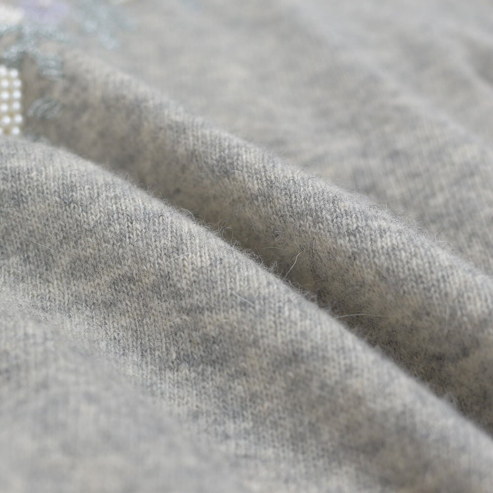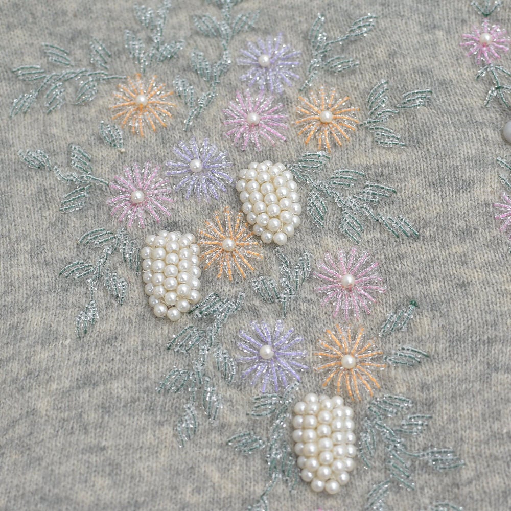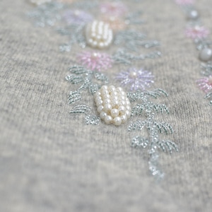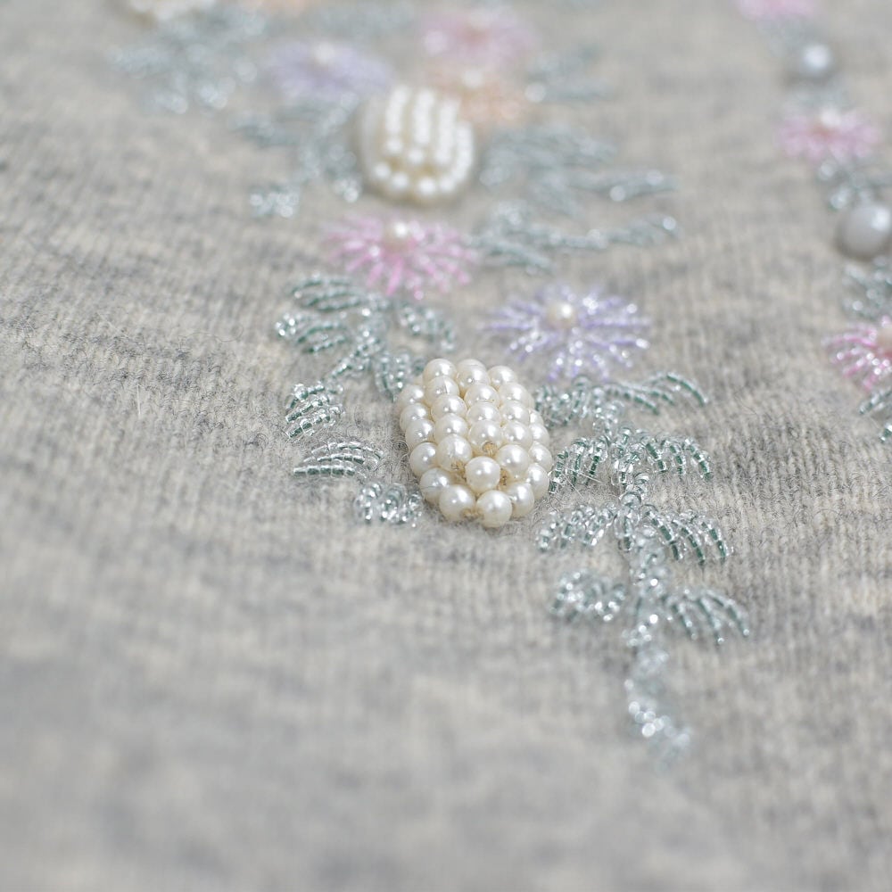 ライトグレーの柔らかなウール地に、一つひとつ丁寧に縫い付けられたパールとビーズの煌めき