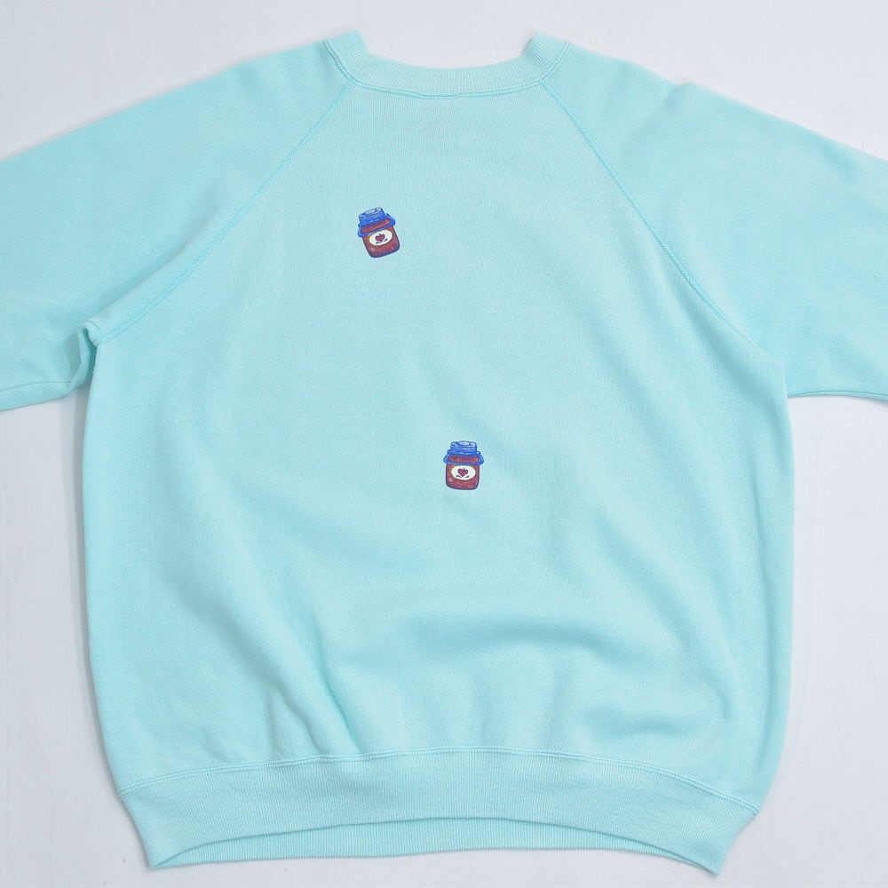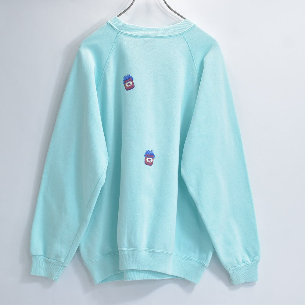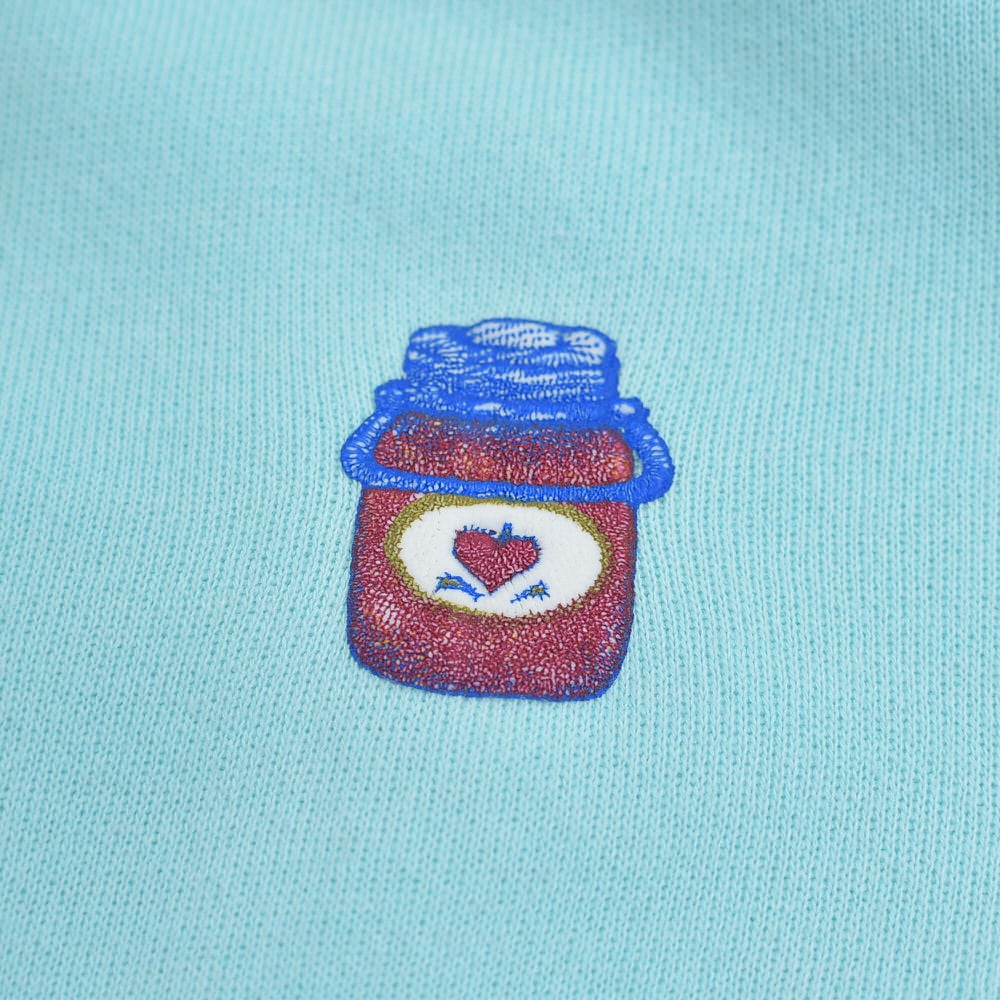 かつて刻まれたダメージを、愛らしいジャム瓶の発泡プリントで「隠す」のではなく「アートに変える」という、遊び心あふれるリペアが施されています