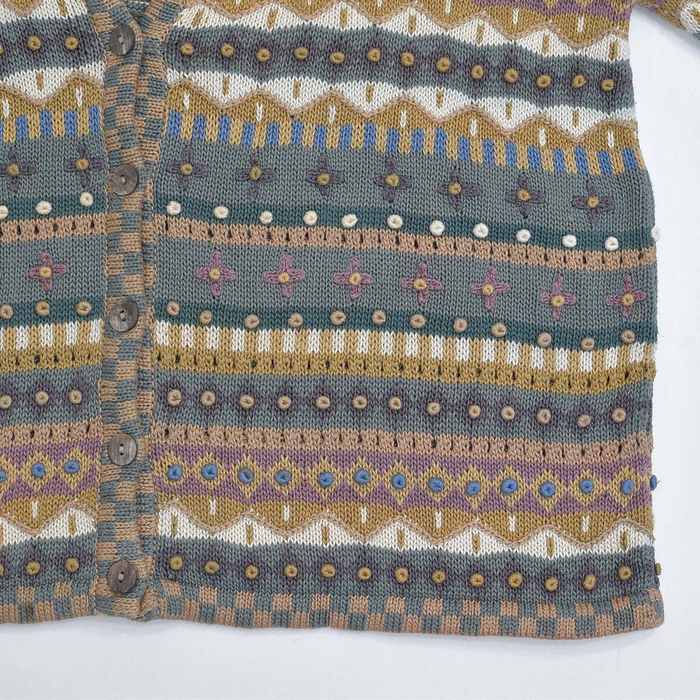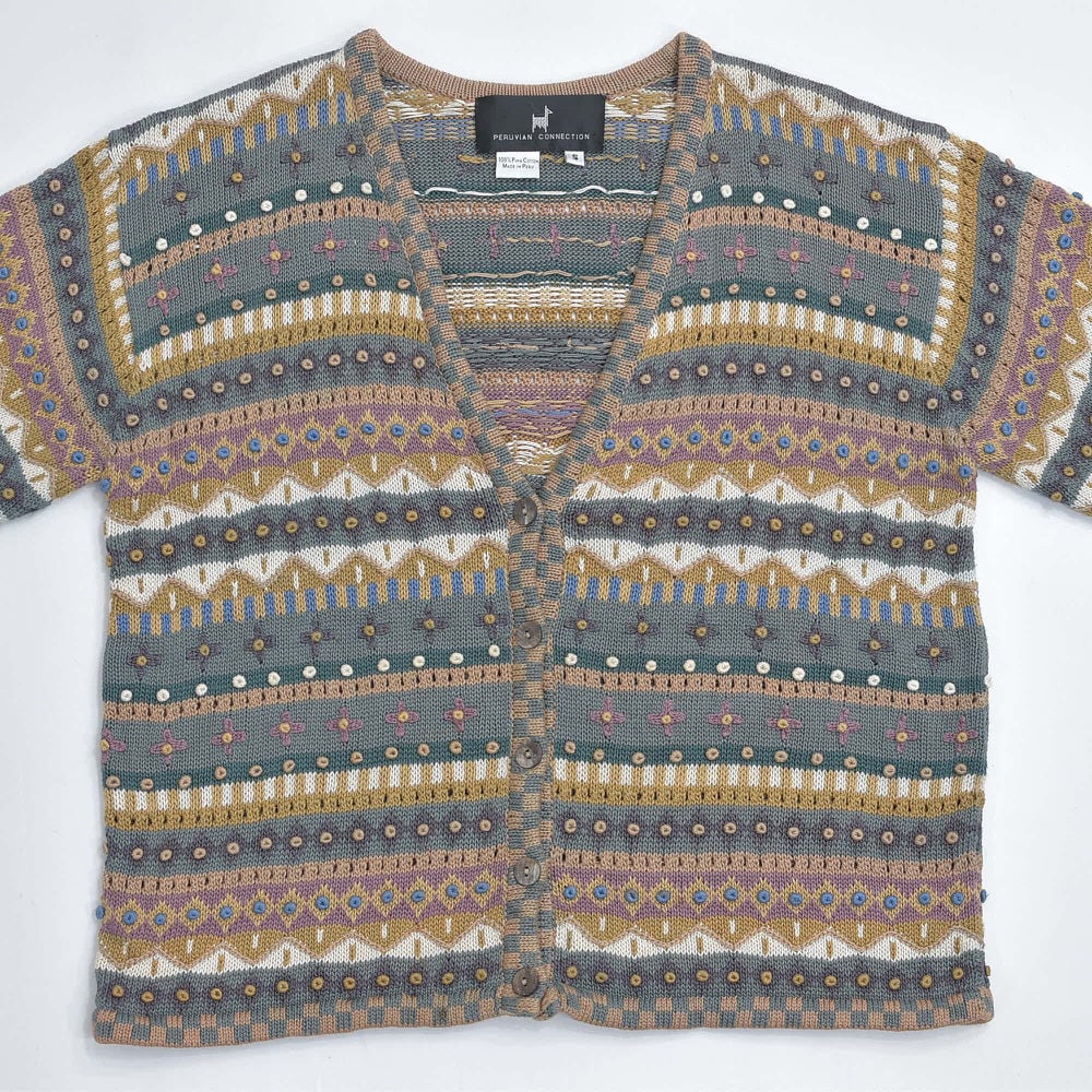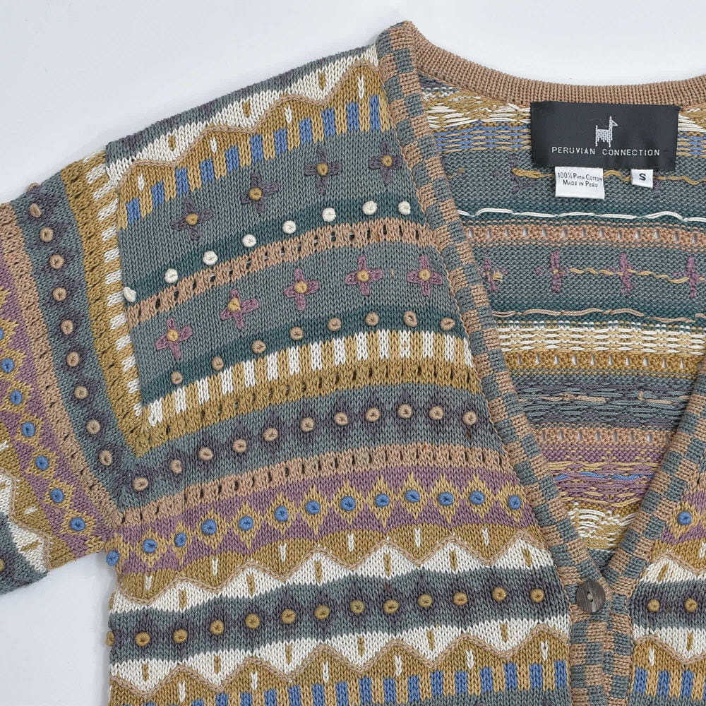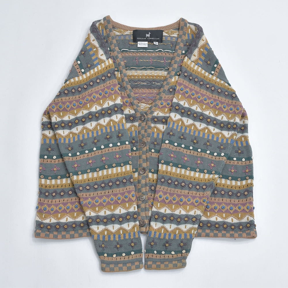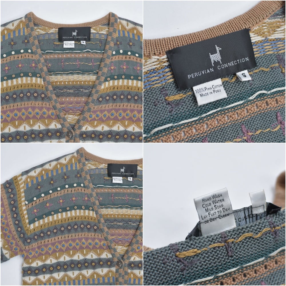 90s PERUVIAN CONNECTION ペルービアンコネクション ピマコットン 幾何学模様 花 モチーフ デザイン ジャガード ニット カーディガン ヴィンテージ ビンテージ USA アメリカ古着 レディースM~相当