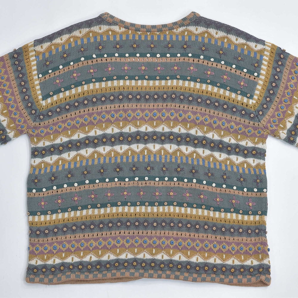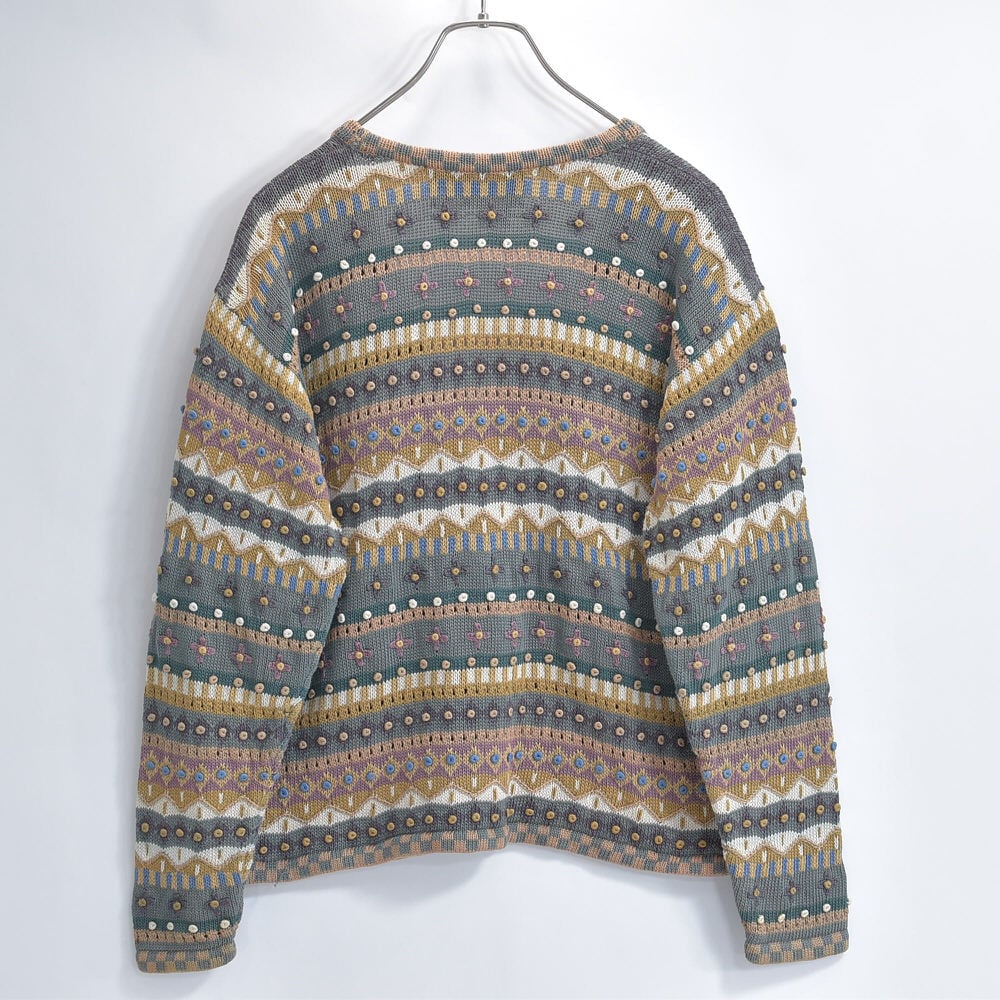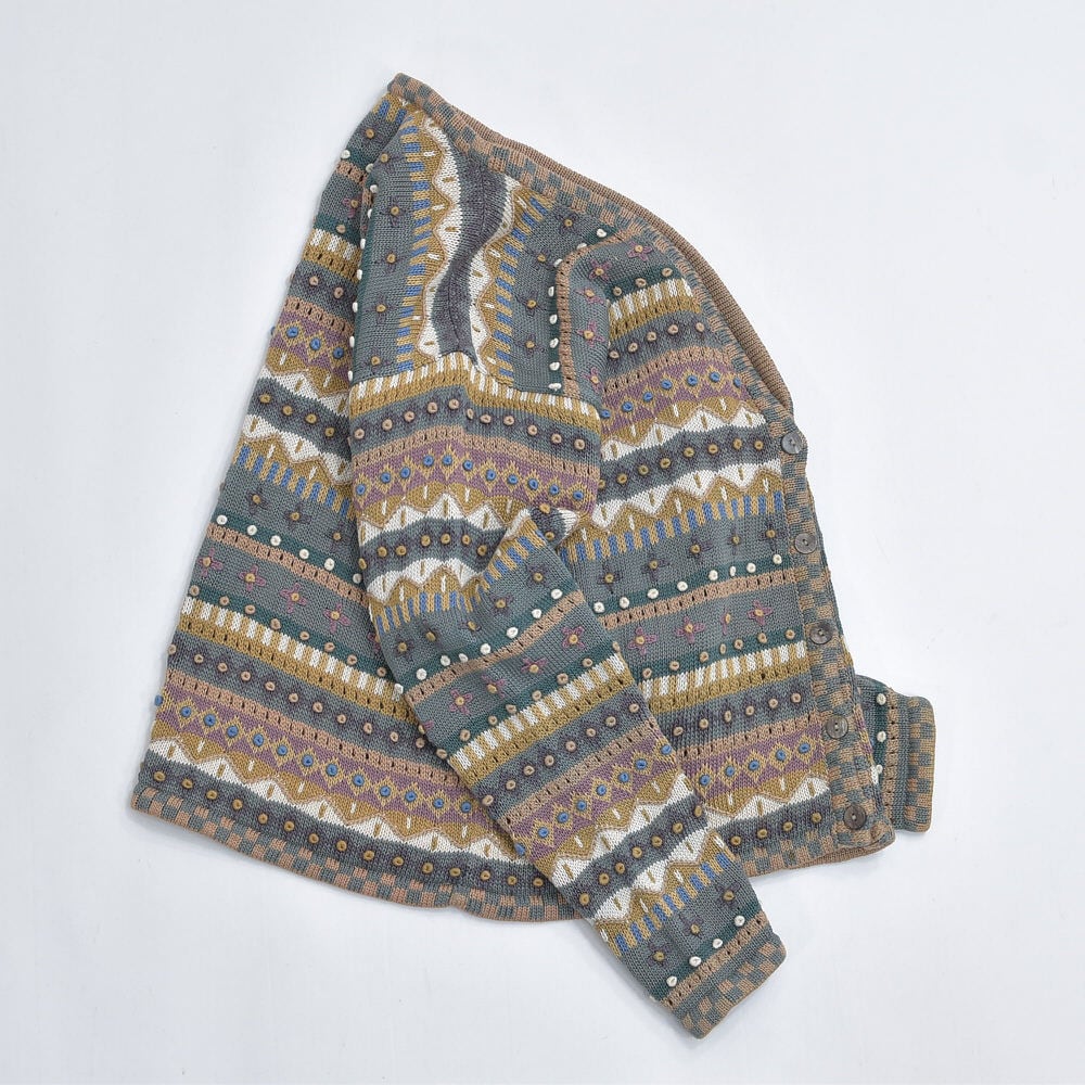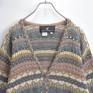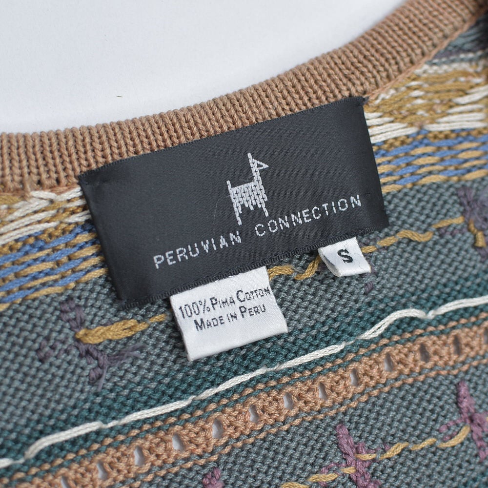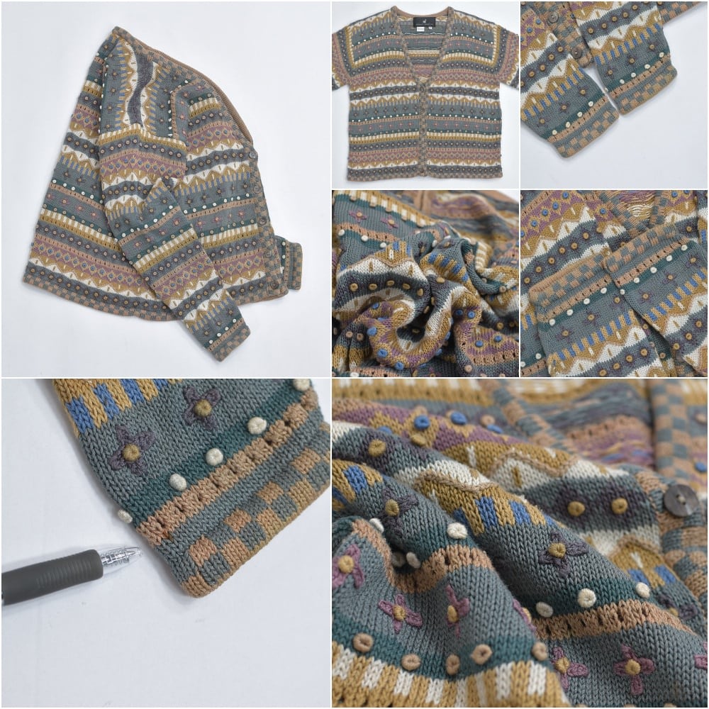 90s PERUVIAN CONNECTION ペルービアンコネクション ピマコットン 幾何学模様 花 モチーフ デザイン ジャガード ニット カーディガン ヴィンテージ ビンテージ USA アメリカ古着 レディースM~相当