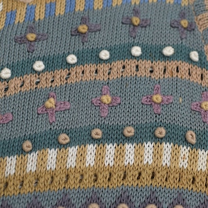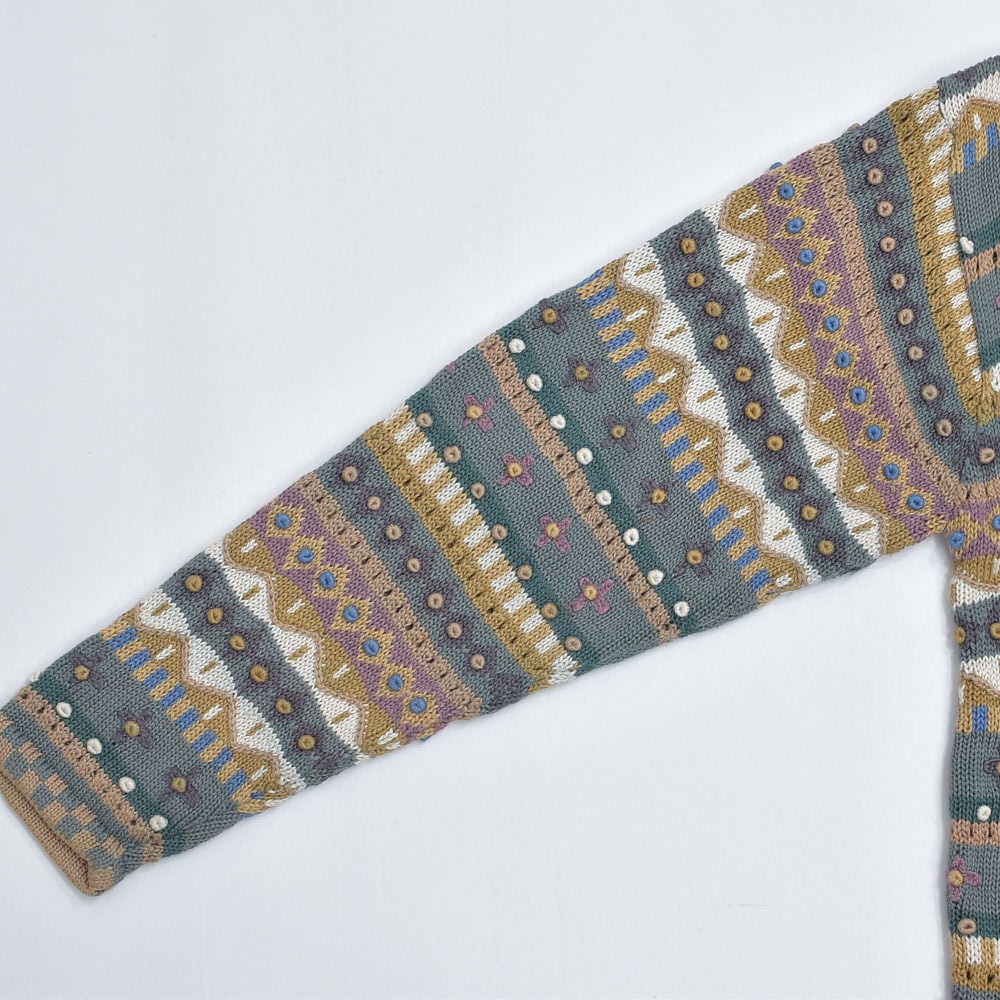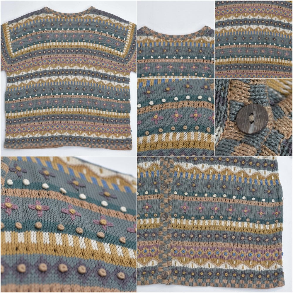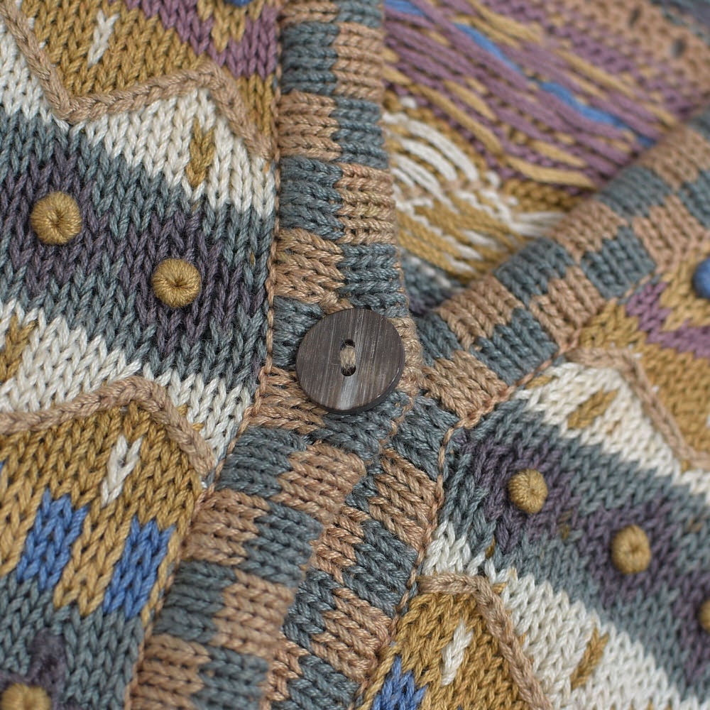 90s PERUVIAN CONNECTION ペルービアンコネクション ピマコットン 幾何学模様 花 モチーフ デザイン ジャガード ニット カーディガン ヴィンテージ ビンテージ USA アメリカ古着 レディースM〜相当