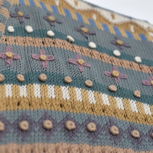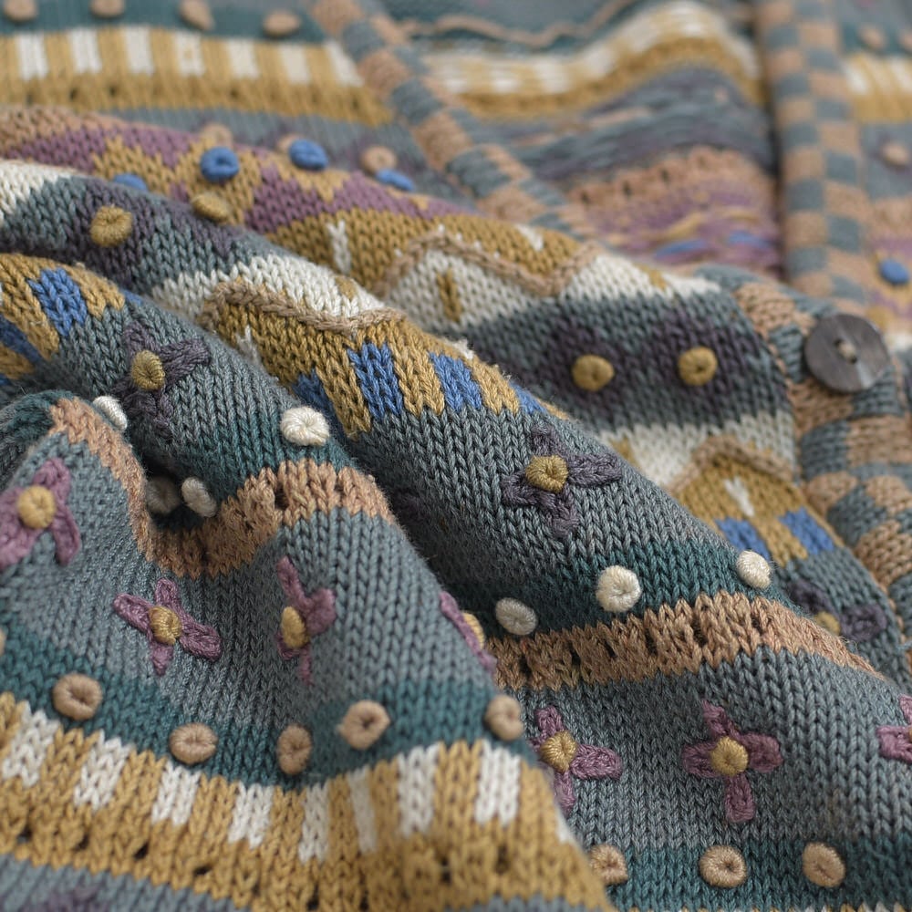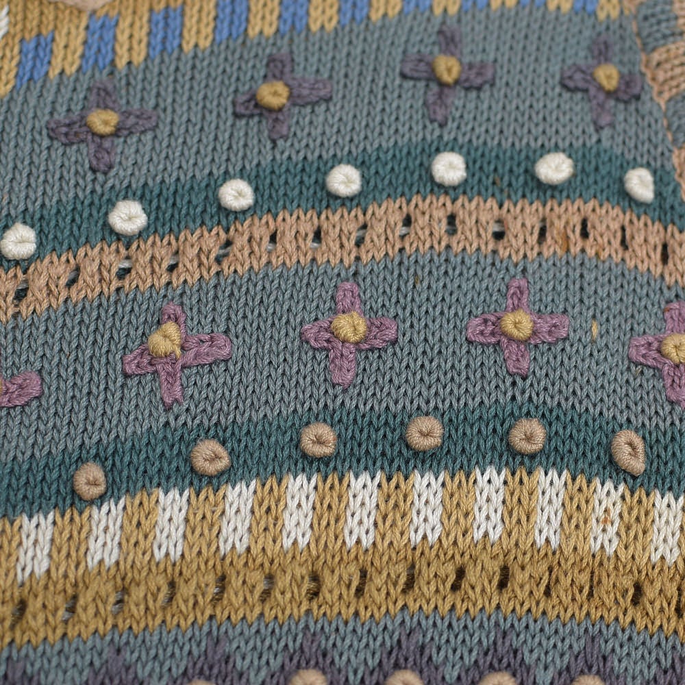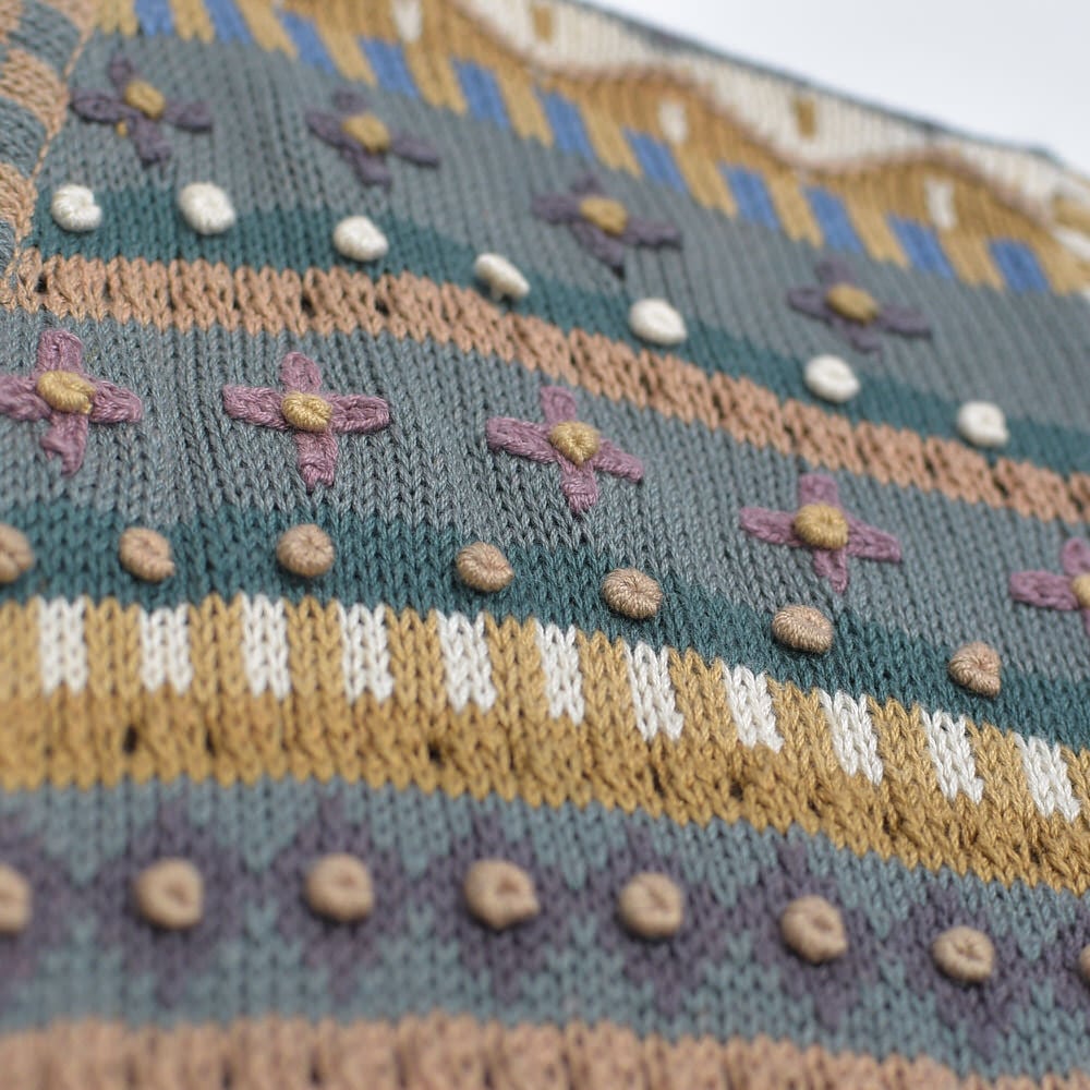 そこへ職人の温もりを感じさせる立体的な刺繍やポップコーン編みが加わり、静かな気品の中にも確かな個性が宿っています