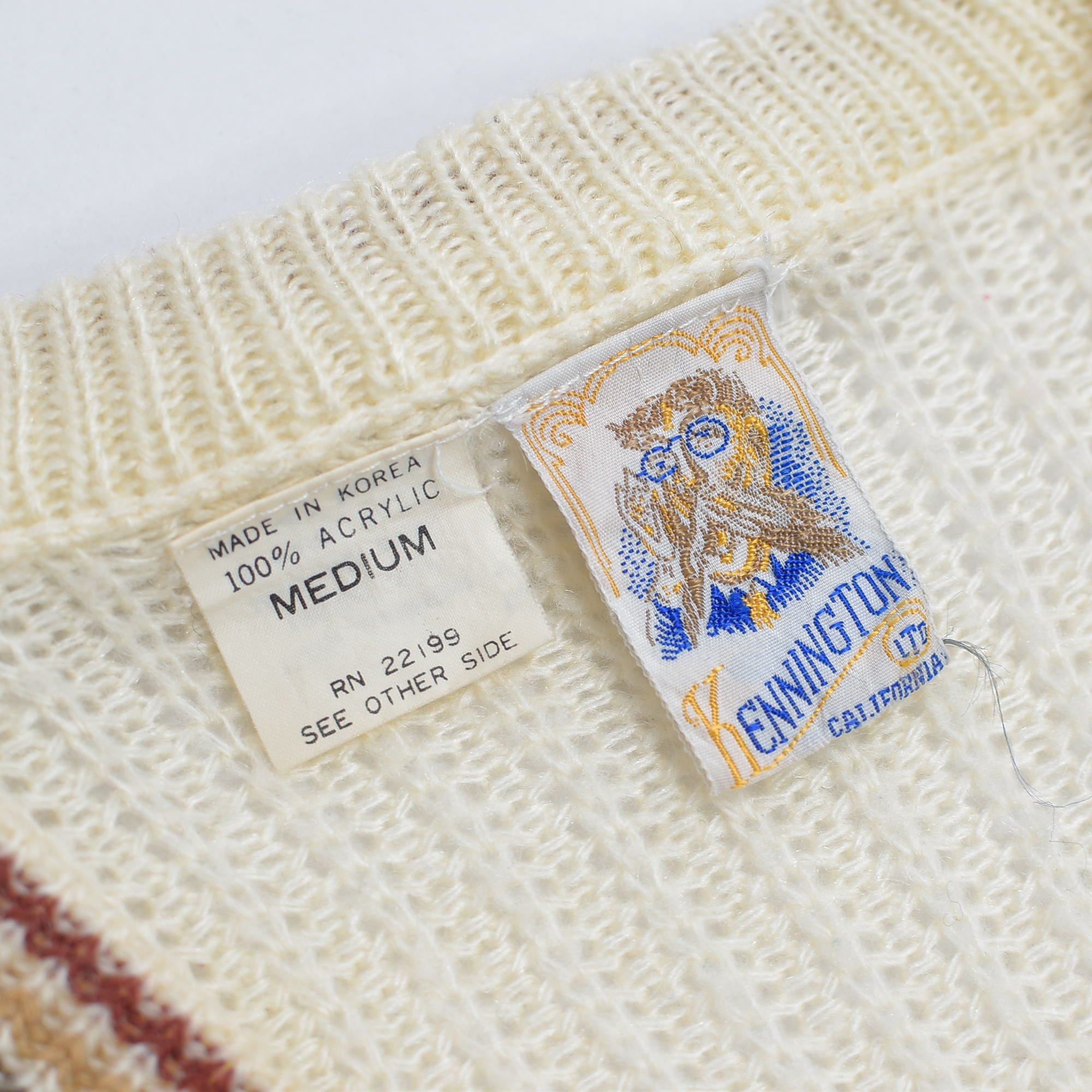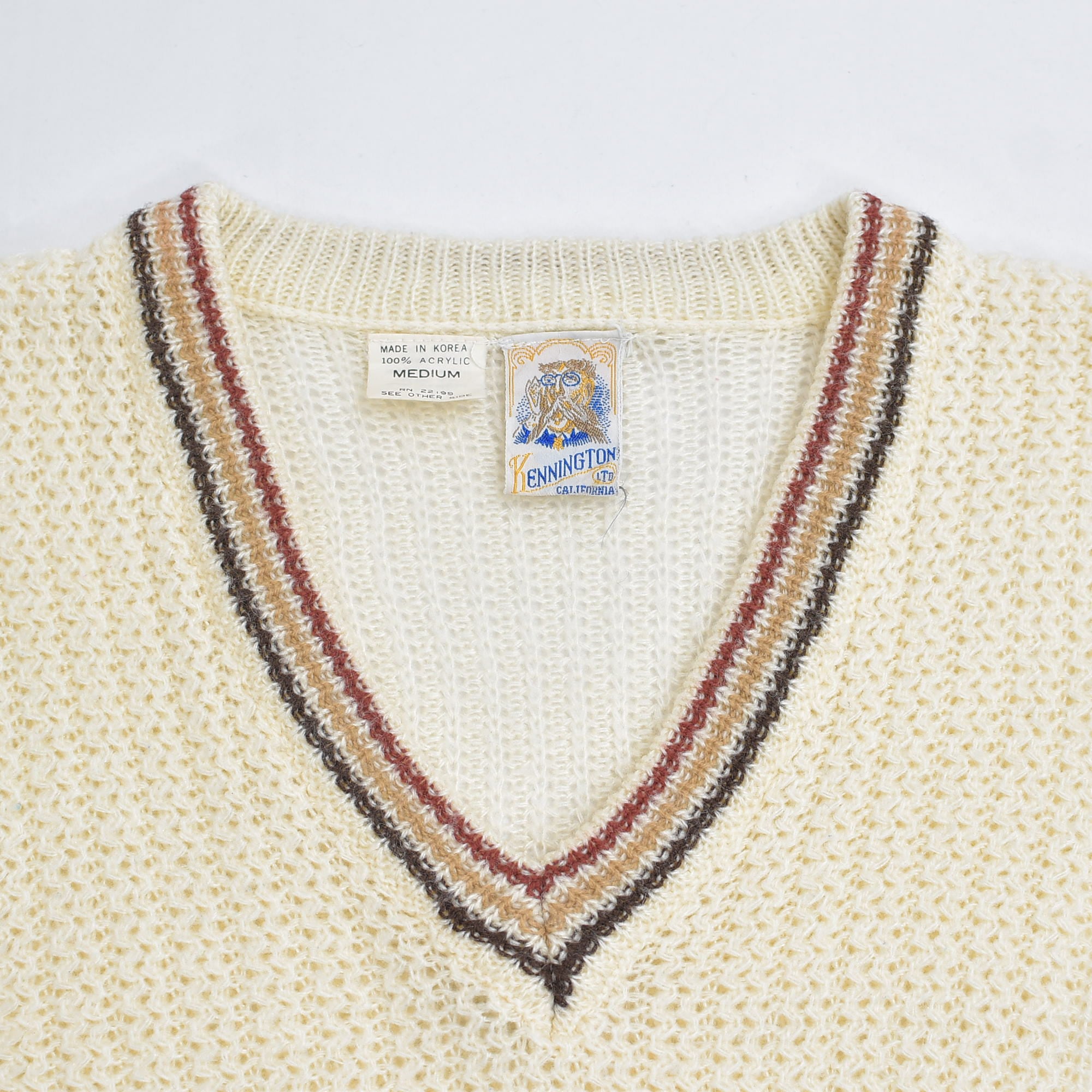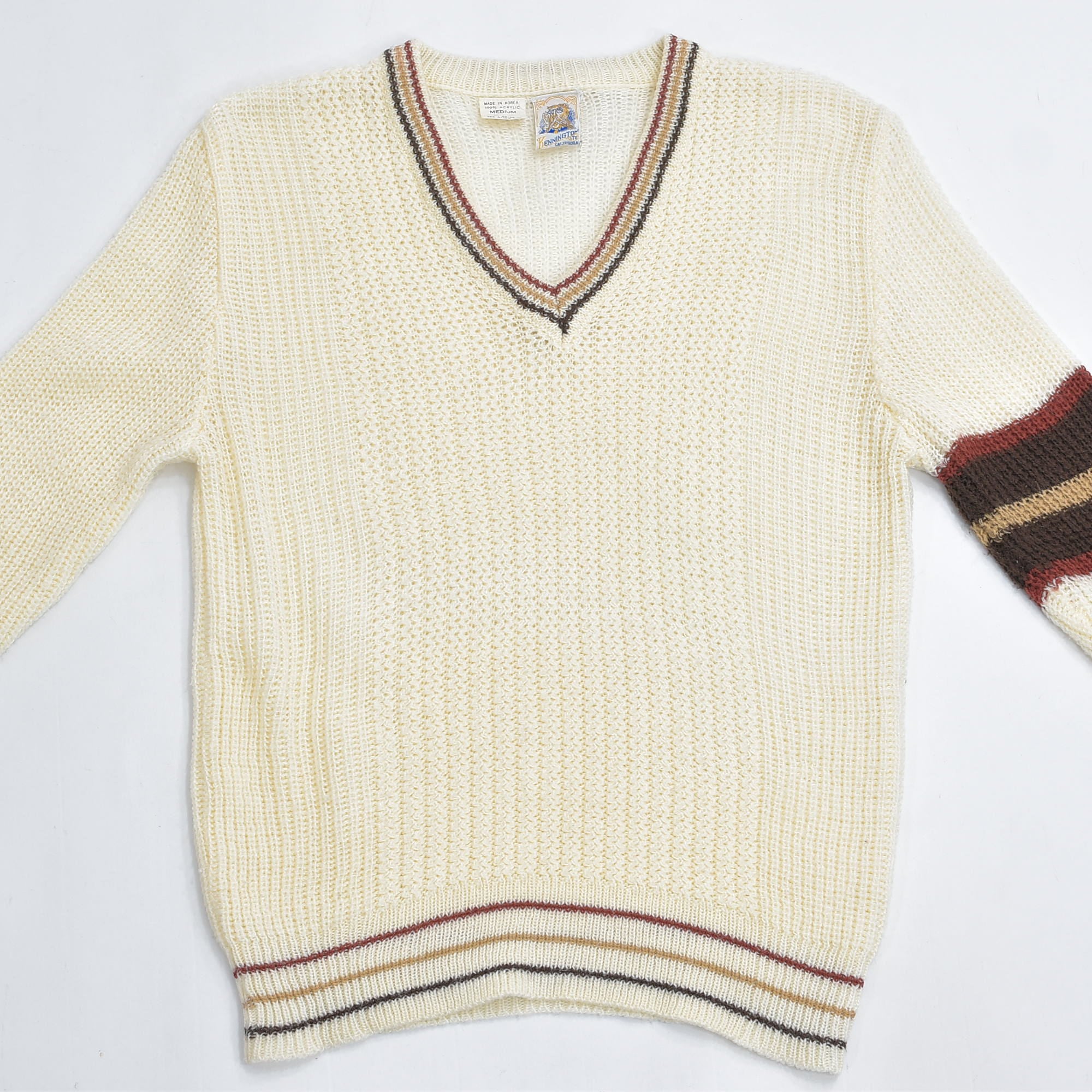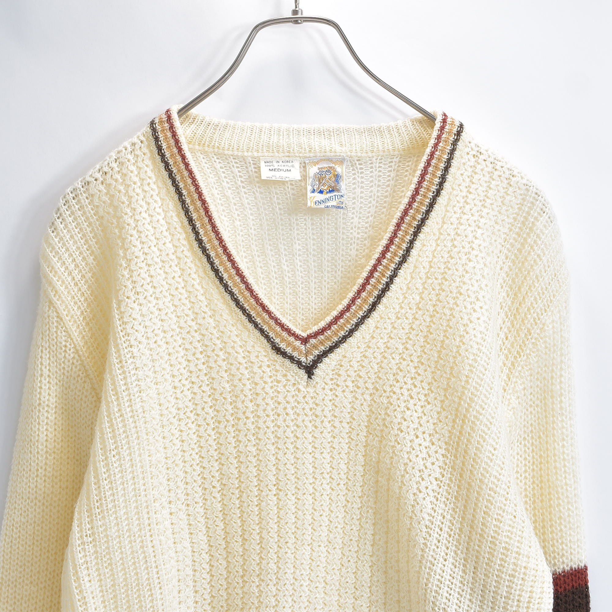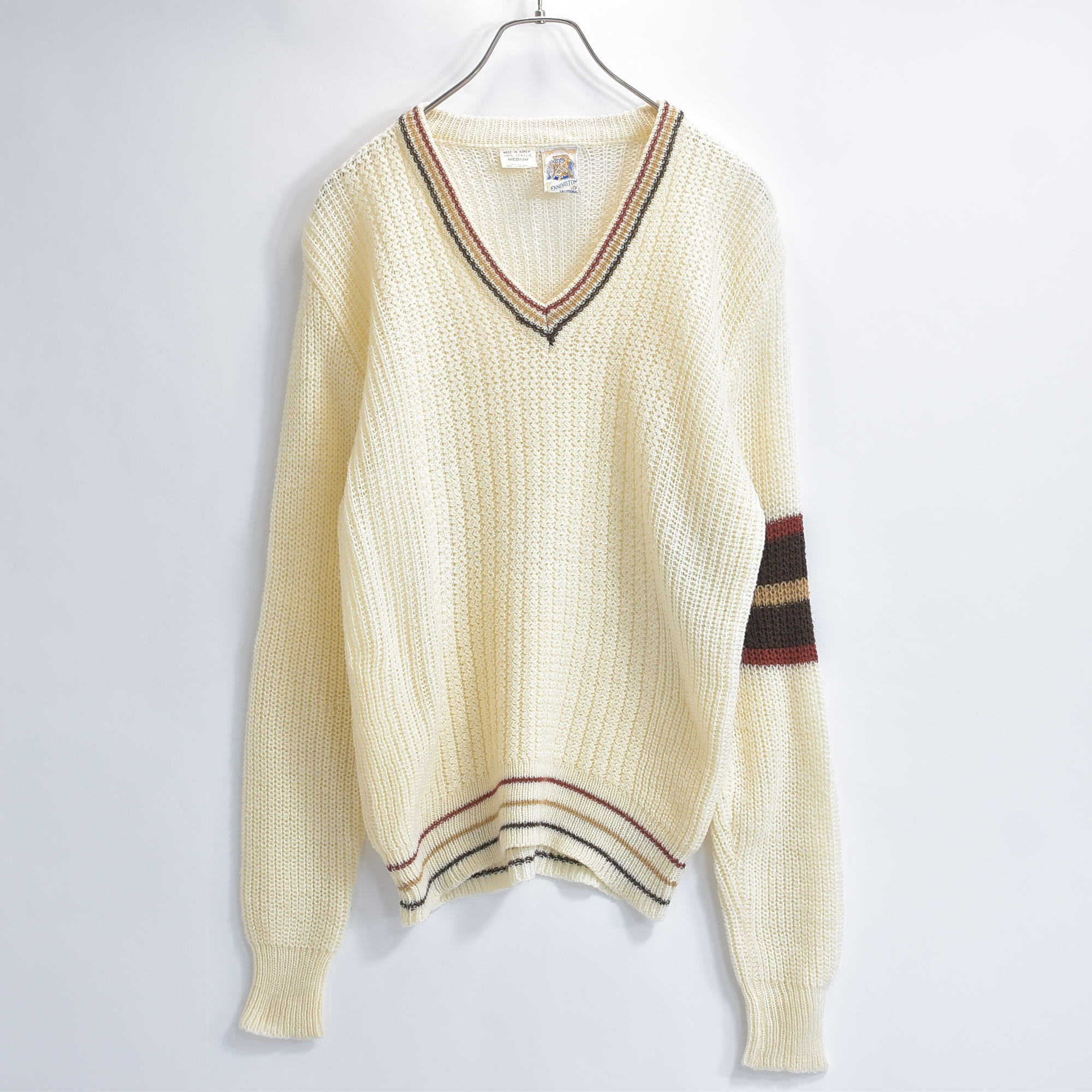 70〜80s KENNINGTON ケニントン Vネック アシンメトリー マルチライン デザイン チルデンセーター ニット ヴィンテージ ビンテージ USA アメリカ古着 メンズMサイズ