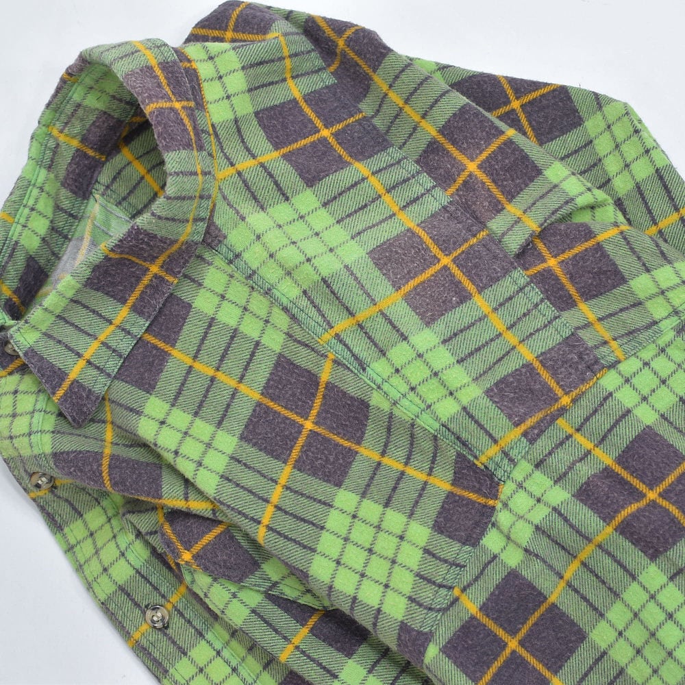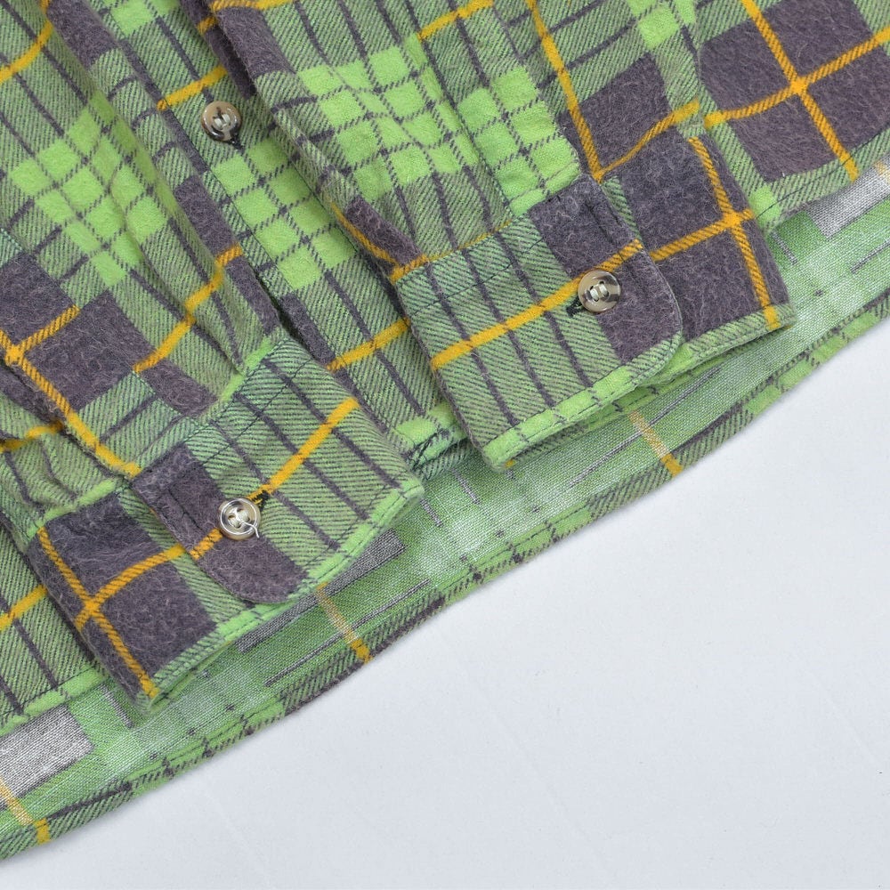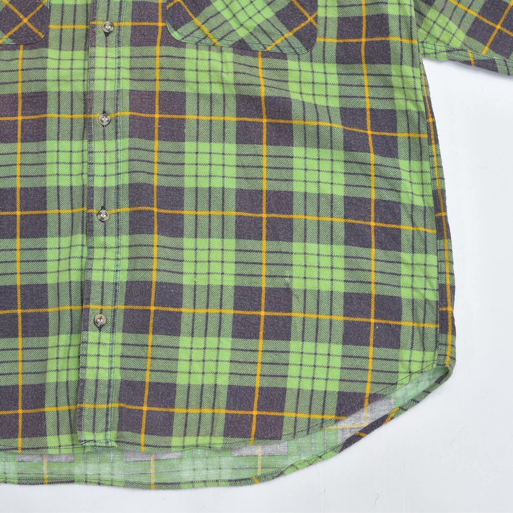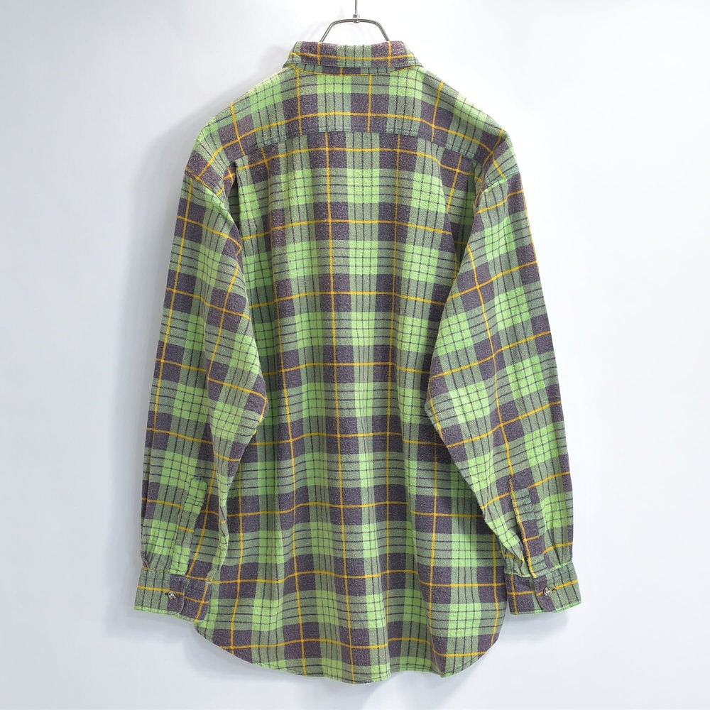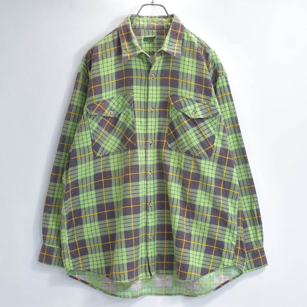 80s Print flannel checkプリントチェック フランネルシャツ 総柄 ワーク 格子柄 長袖シャツ グリーン ヴィンテージ ビンテージ 古着 メンズL〜相当