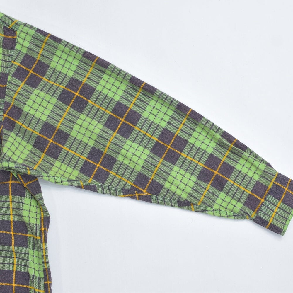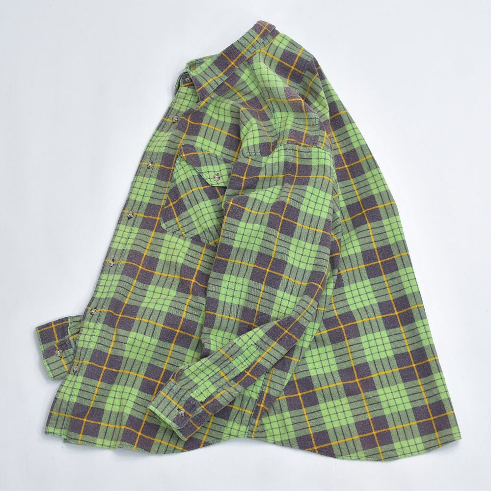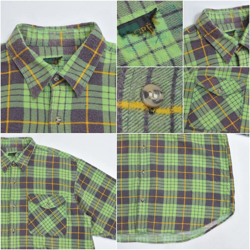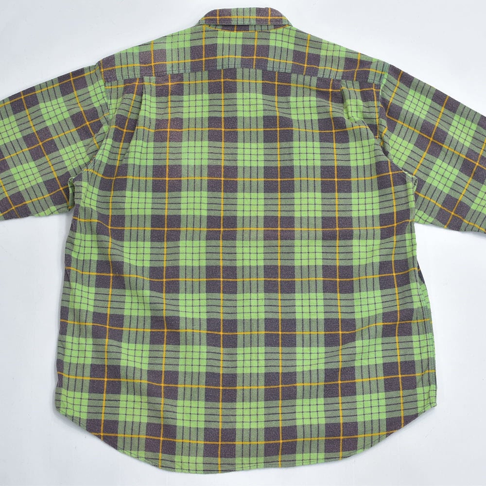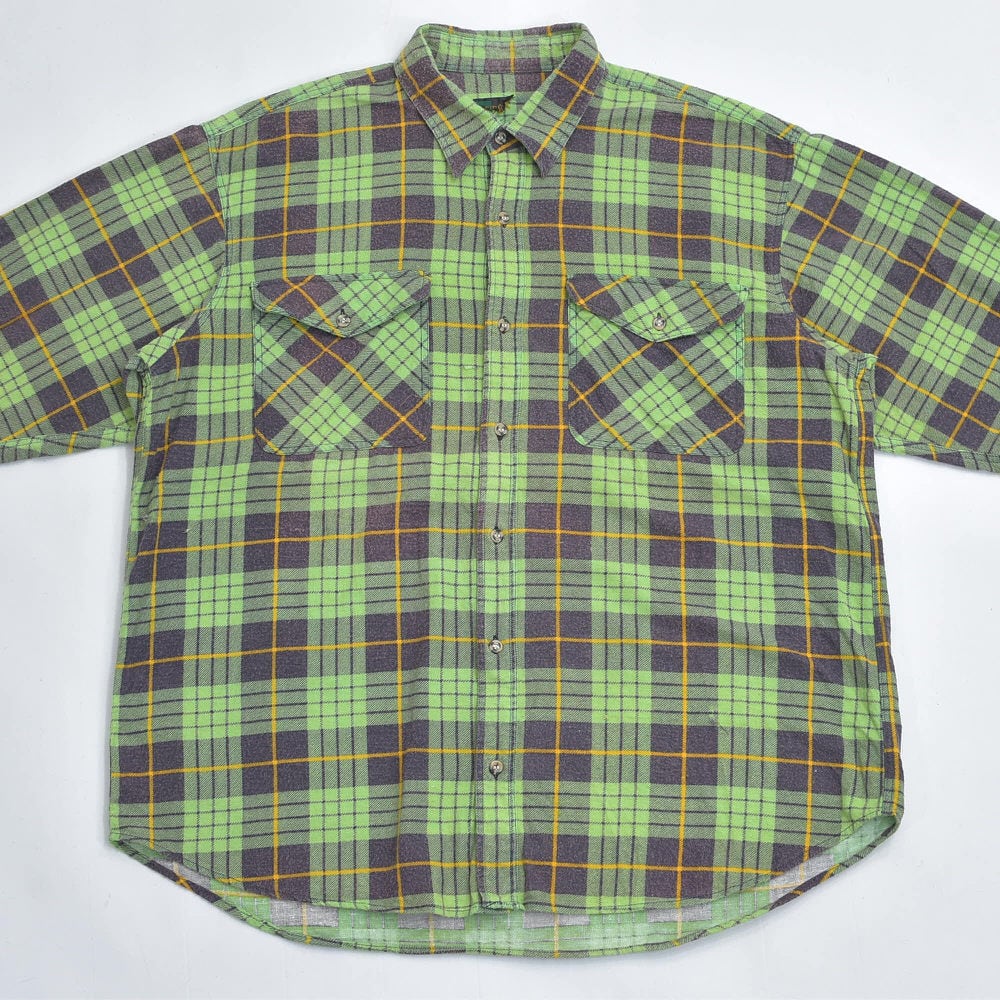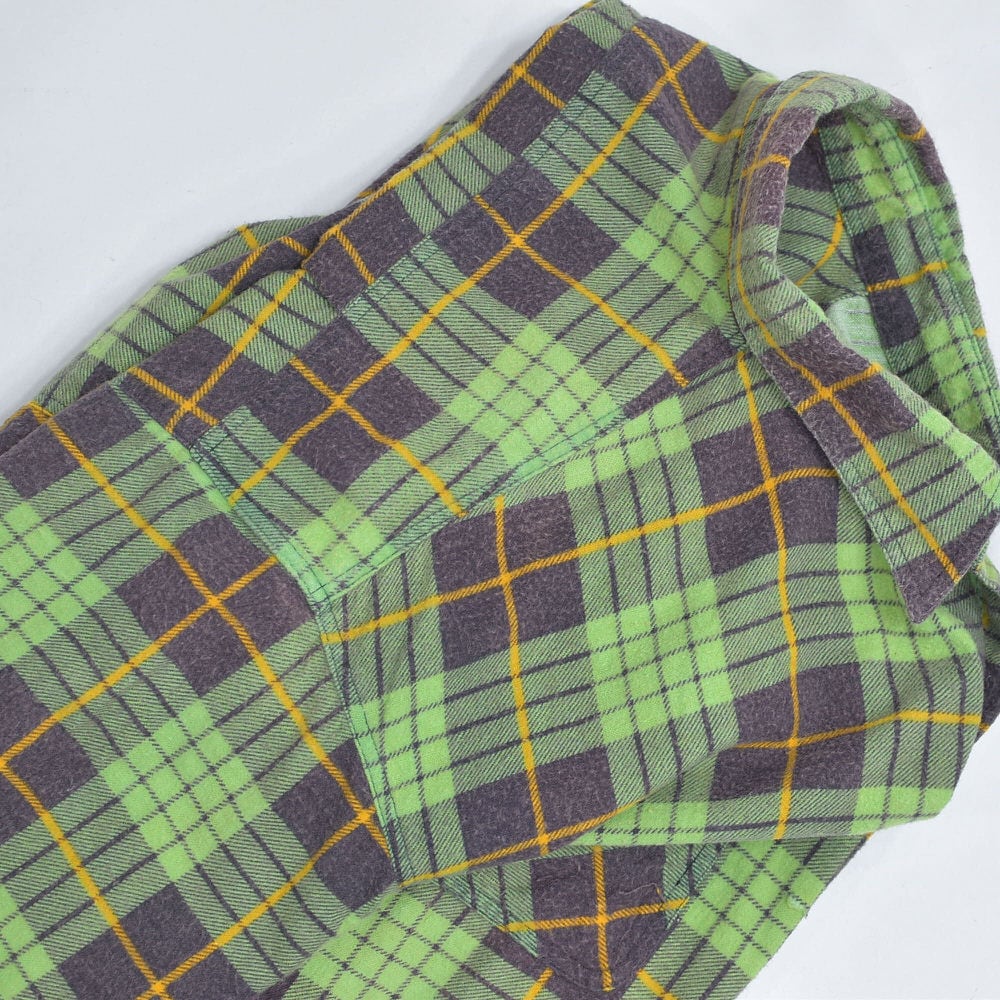 80s Print flannel checkプリントチェック フランネルシャツ 総柄 ワーク 格子柄 長袖シャツ グリーン ヴィンテージ ビンテージ 古着 メンズL〜相当