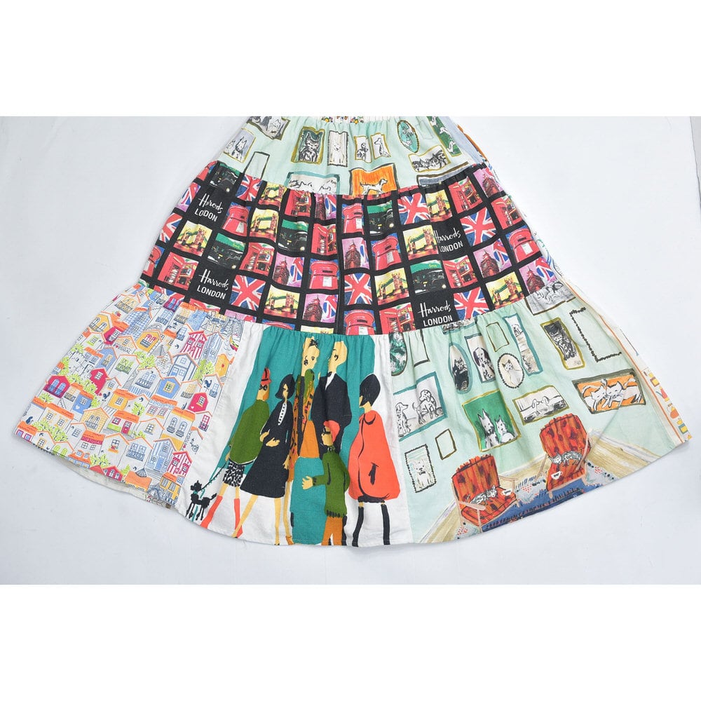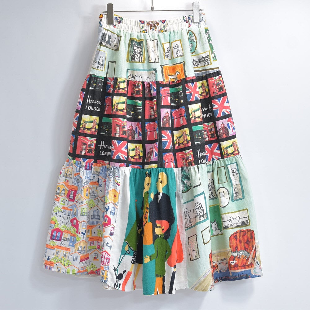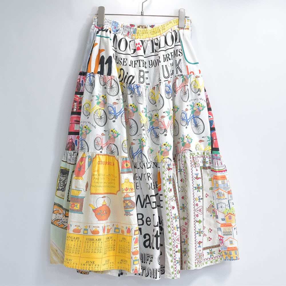 Remake リメイク ヴィンテージ テキスタイル パッチワーク デザイン ティアードスカート 裏地付き パッチワーク 再構築 ツギハギ レディースW64〜100cm