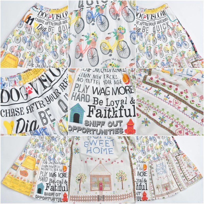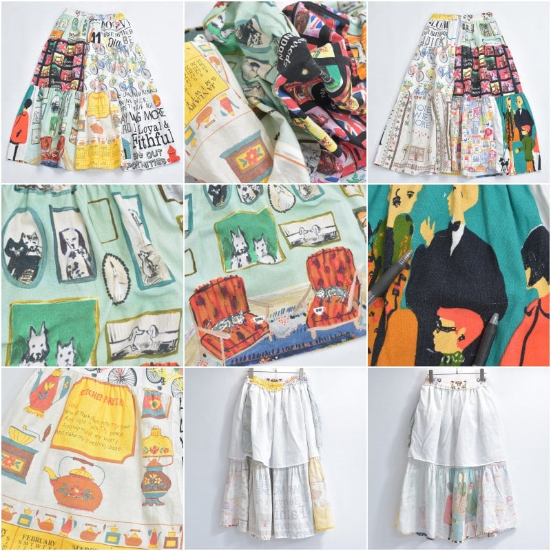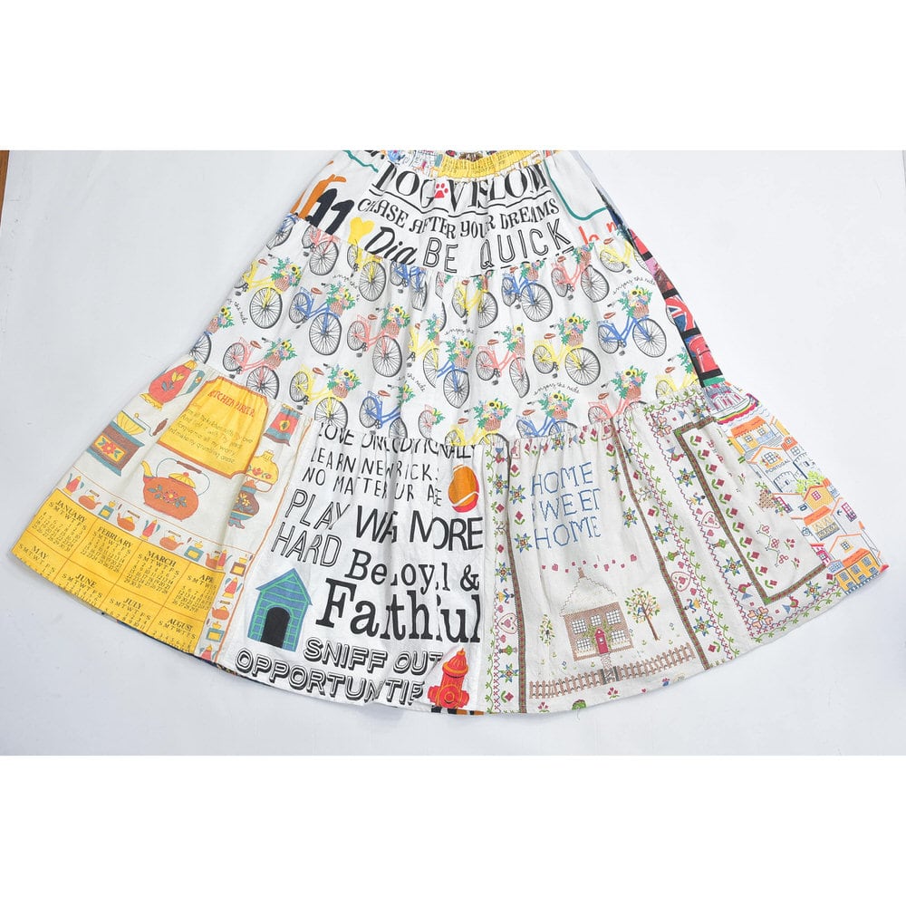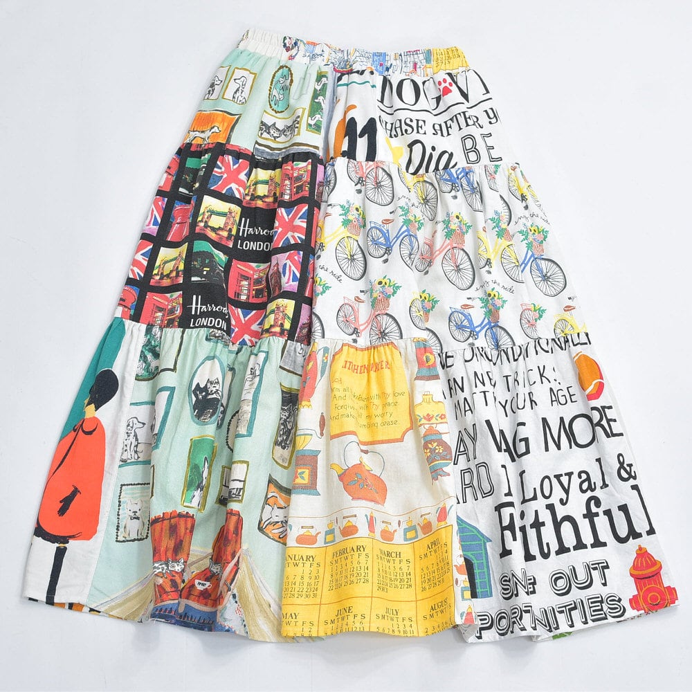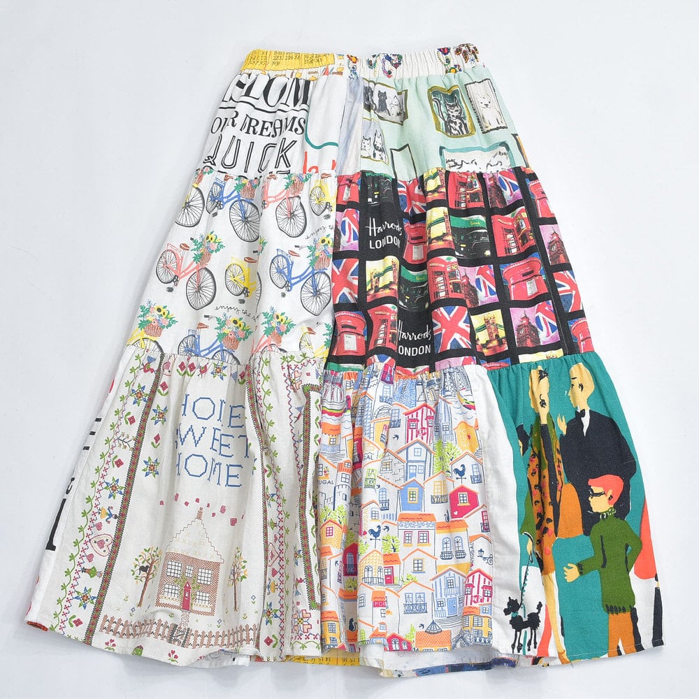 Remake リメイク ヴィンテージ テキスタイル パッチワーク デザイン ティアードスカート 裏地付き パッチワーク 再構築 ツギハギ レディースW64~100cm
