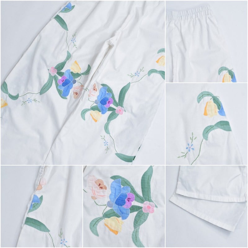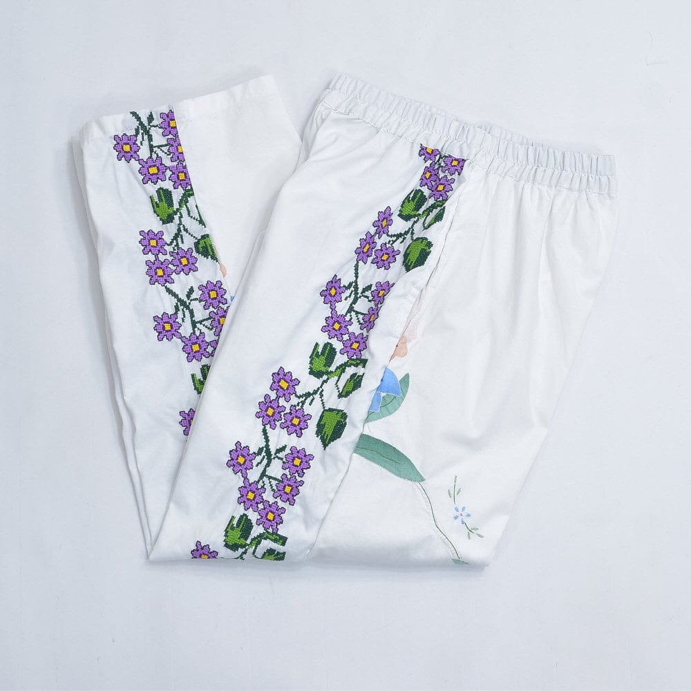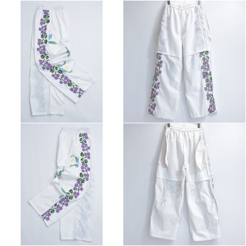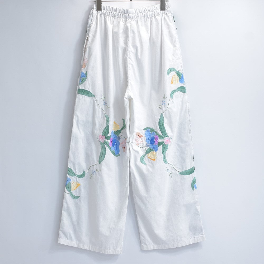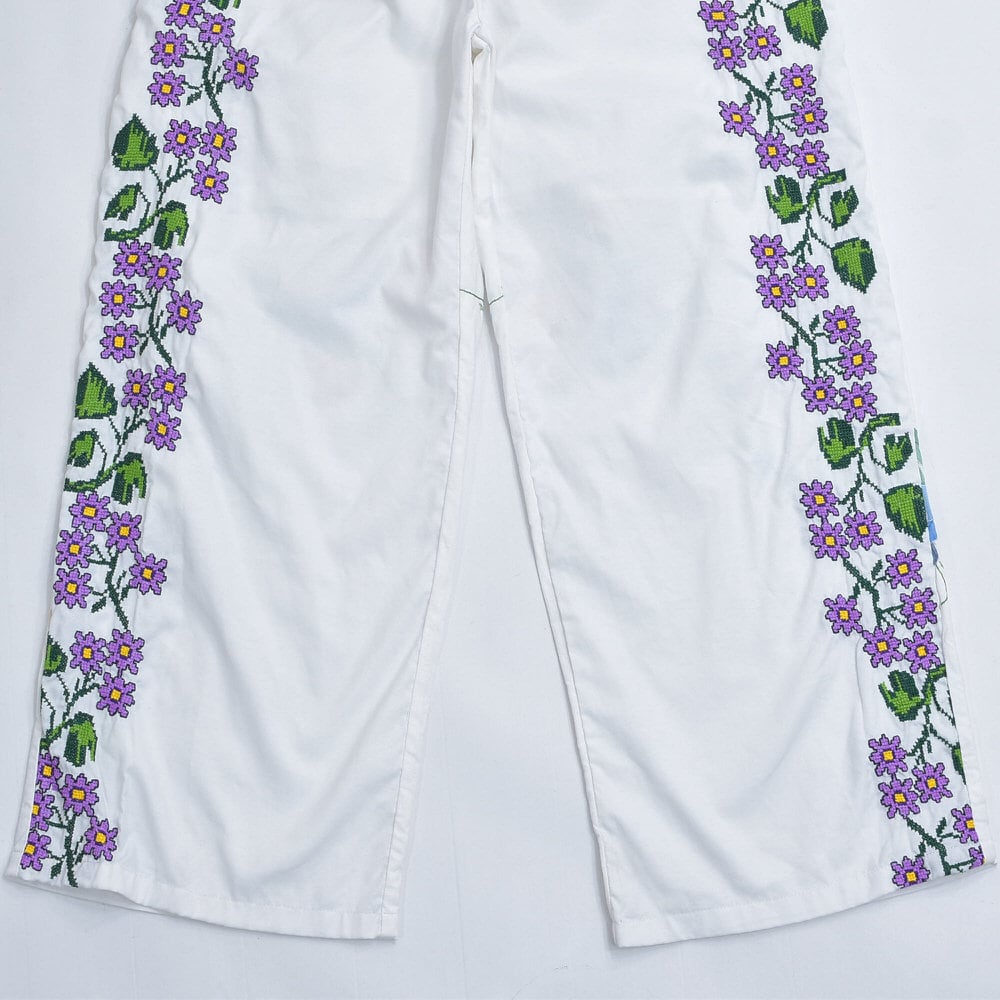 Remakeリメイク 再構築 パッチワーク&フラワー 刺繍 デザイン ルーズシルエット イージーパンツ ホワイト クロスステッチ ユニセックスデザイン 裏地付き W66〜96cm