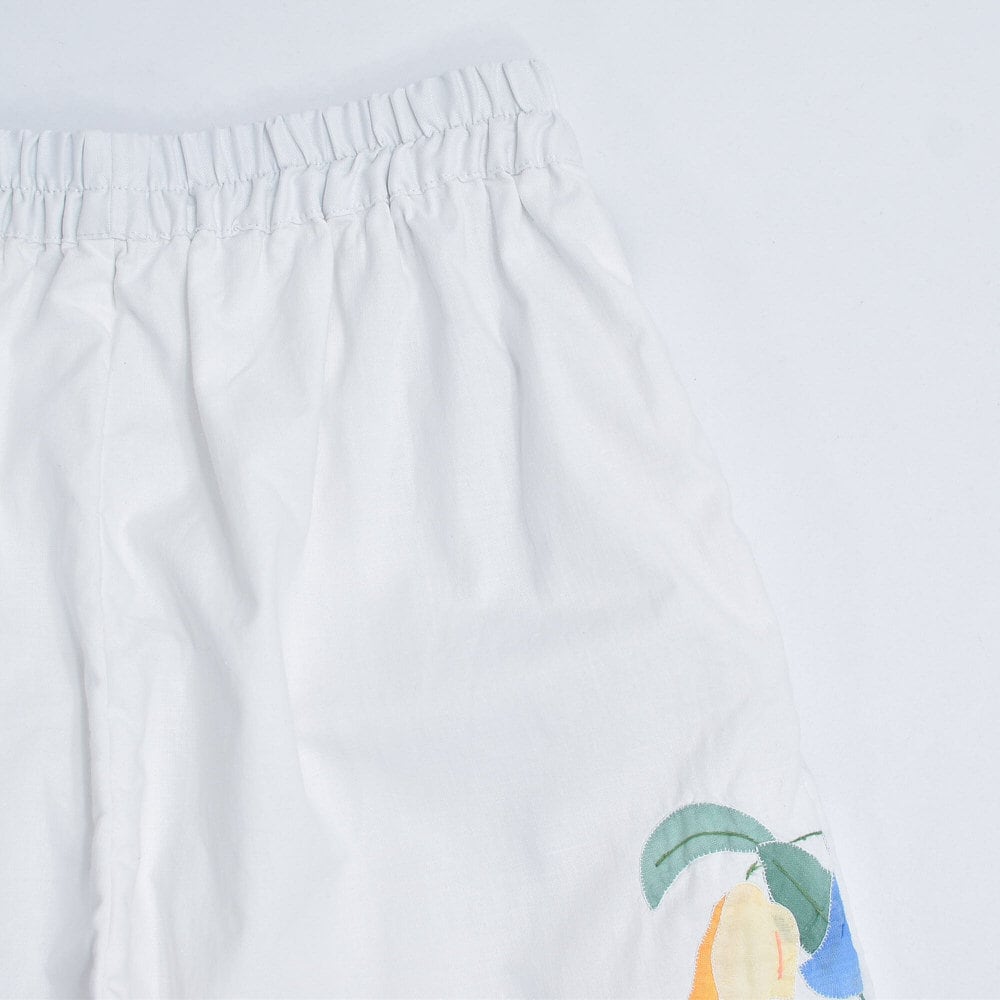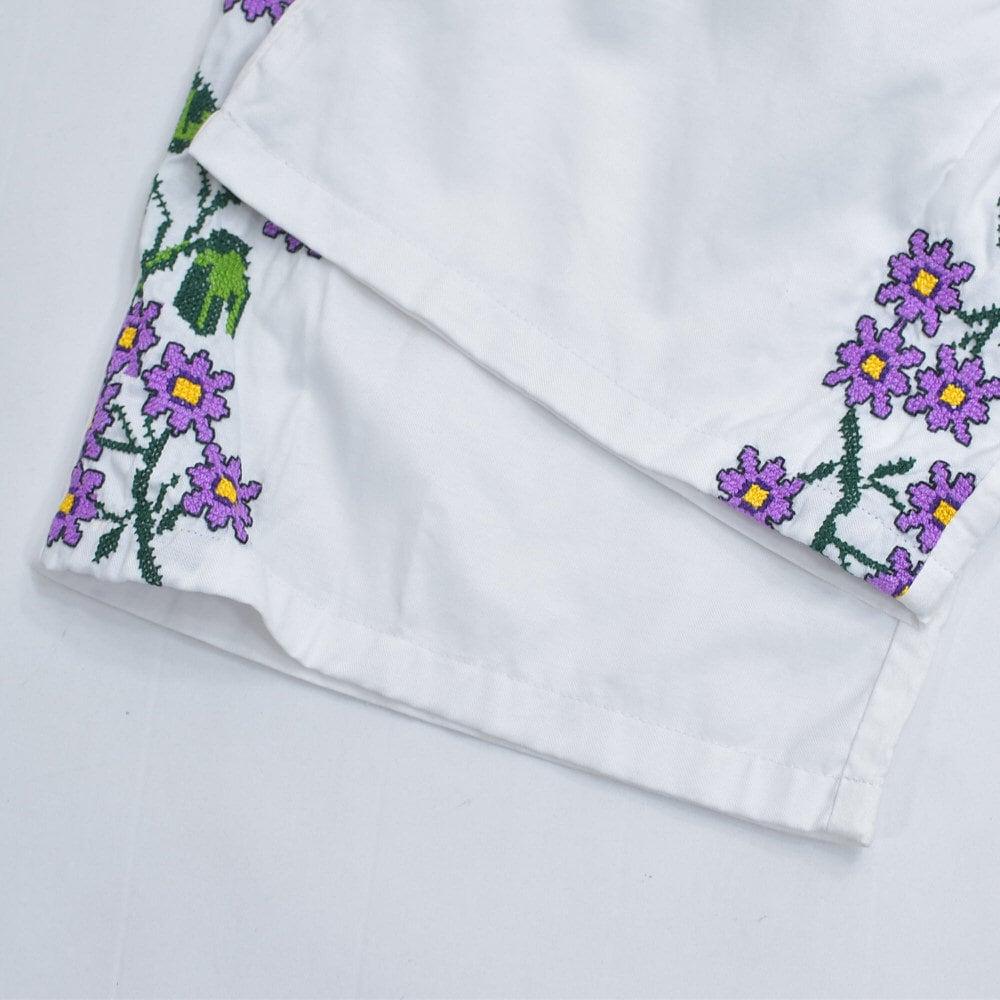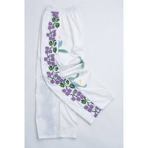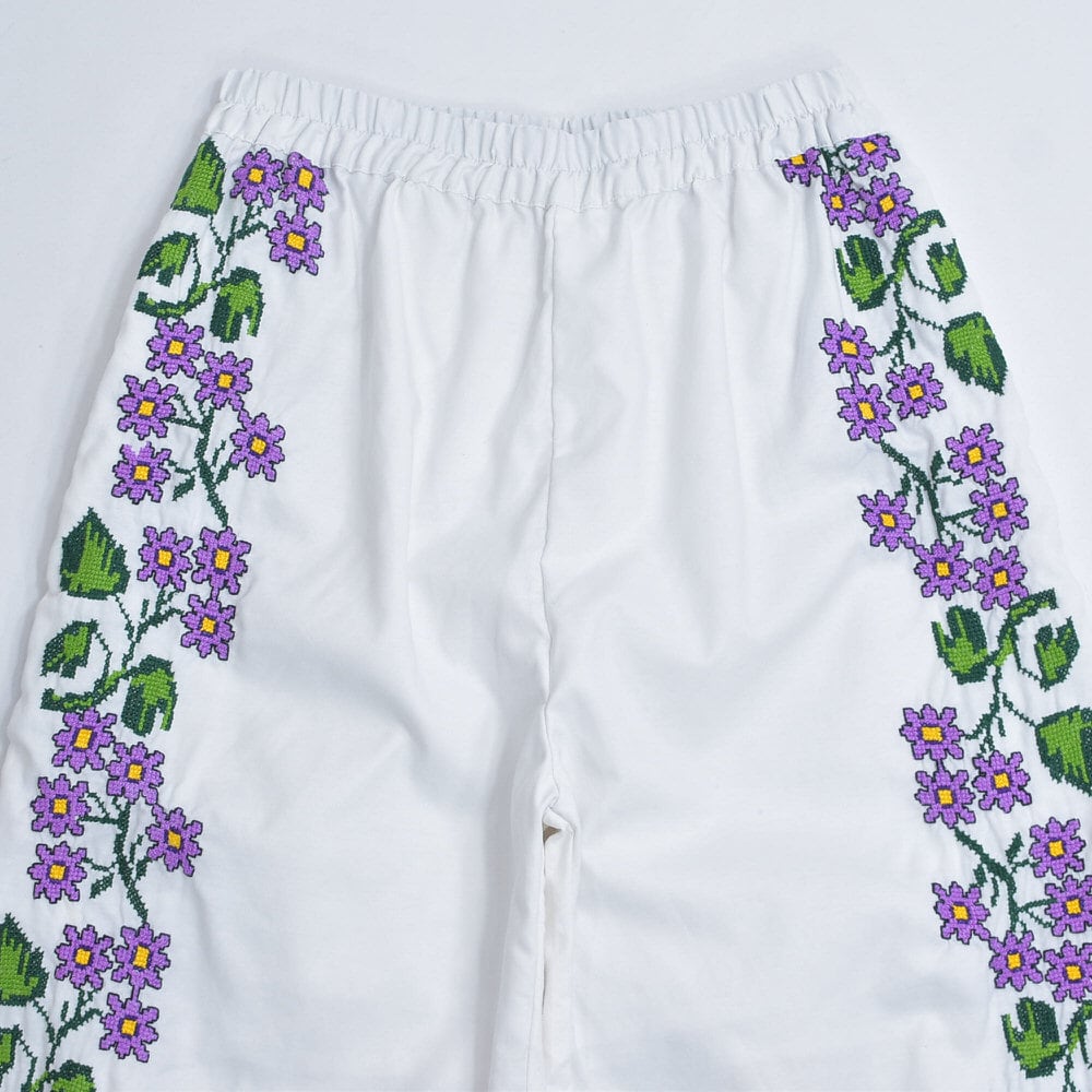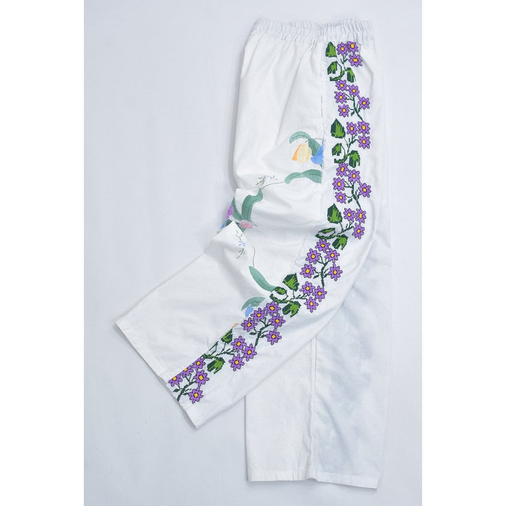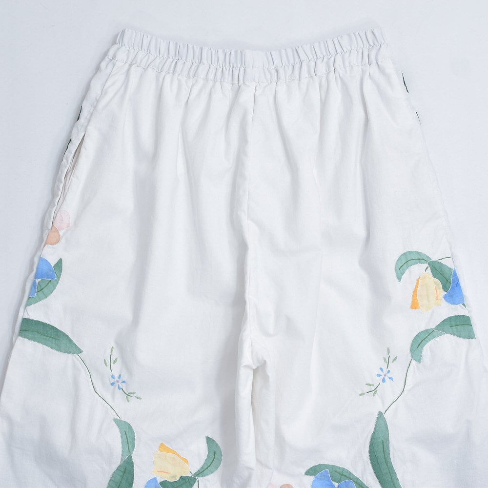 Remakeリメイク 再構築 パッチワーク&フラワー 刺繍 デザイン ルーズシルエット イージーパンツ ホワイト クロスステッチ ユニセックスデザイン 裏地付き W66〜96cm
