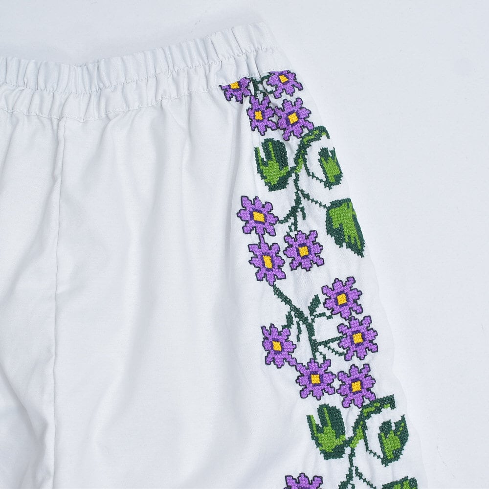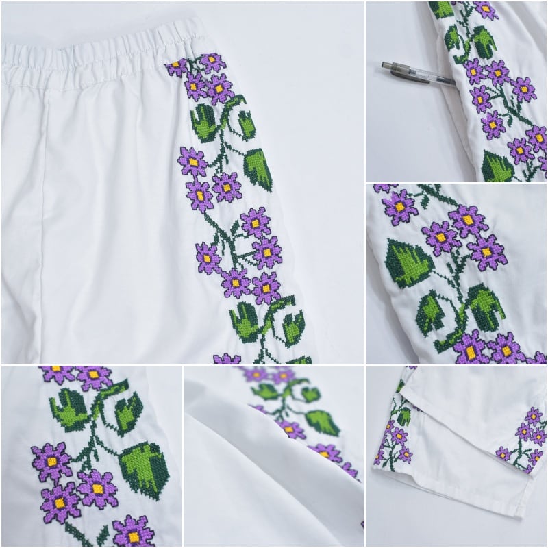 Remakeリメイク 再構築 パッチワーク&フラワー 刺繍 デザイン ルーズシルエット イージーパンツ ホワイト クロスステッチ ユニセックスデザイン 裏地付き W66~96cm