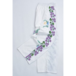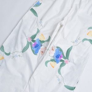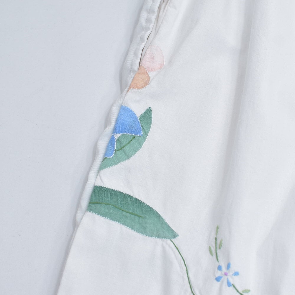 可愛らしいお花が描かれた刺繍クロスの生地をボトムスに再構築したパッチワークのリメイクパンツ
