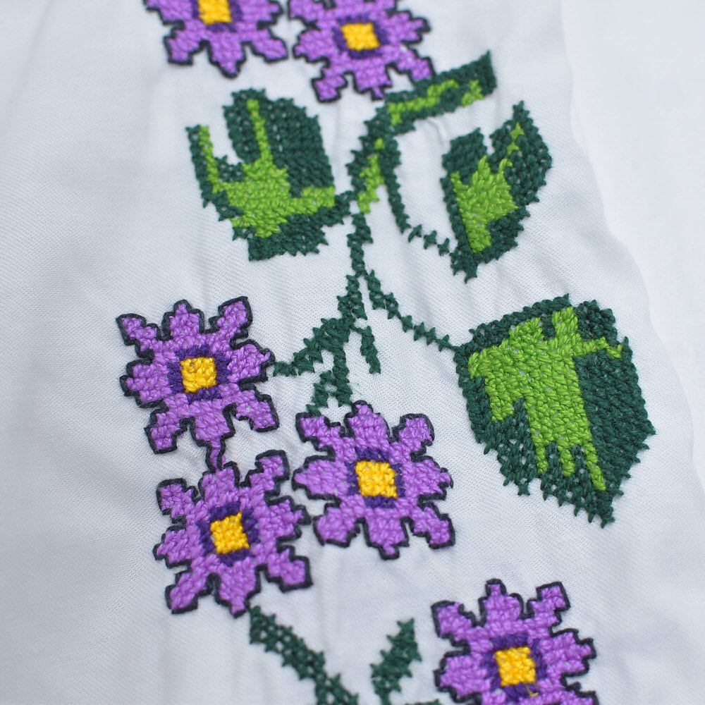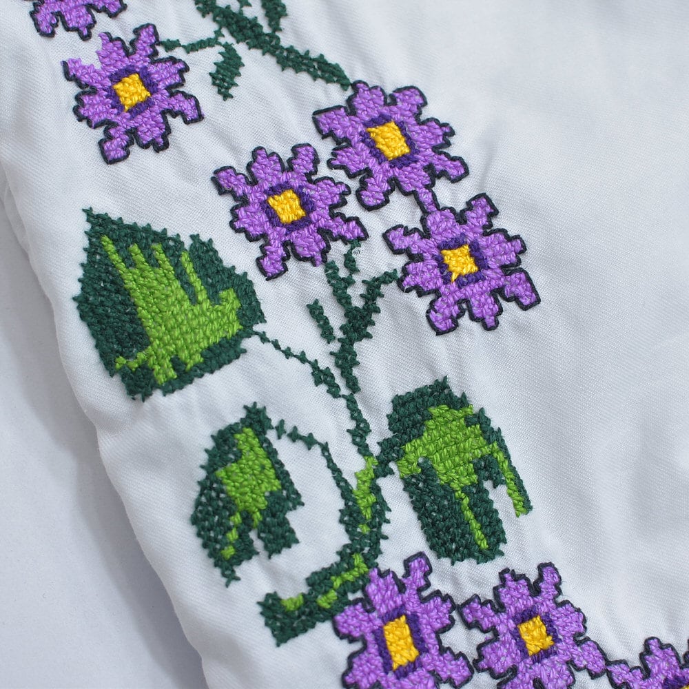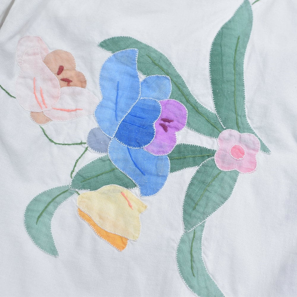 柔らかな風合いを感じるのコットン生地に、ほっこりと優しい気持ちになれるお花のクロスステッチやアップリケの素敵な佇まい
