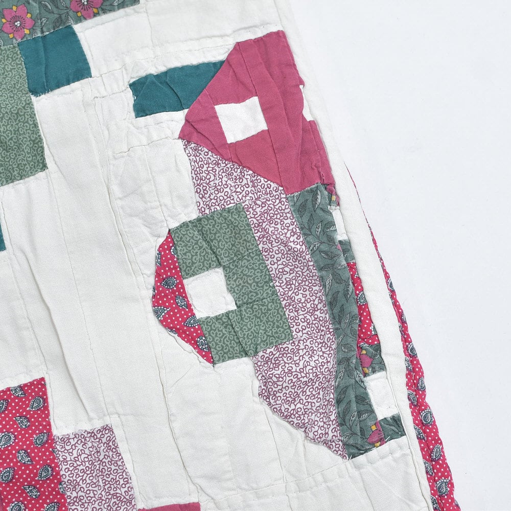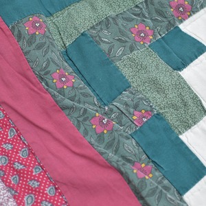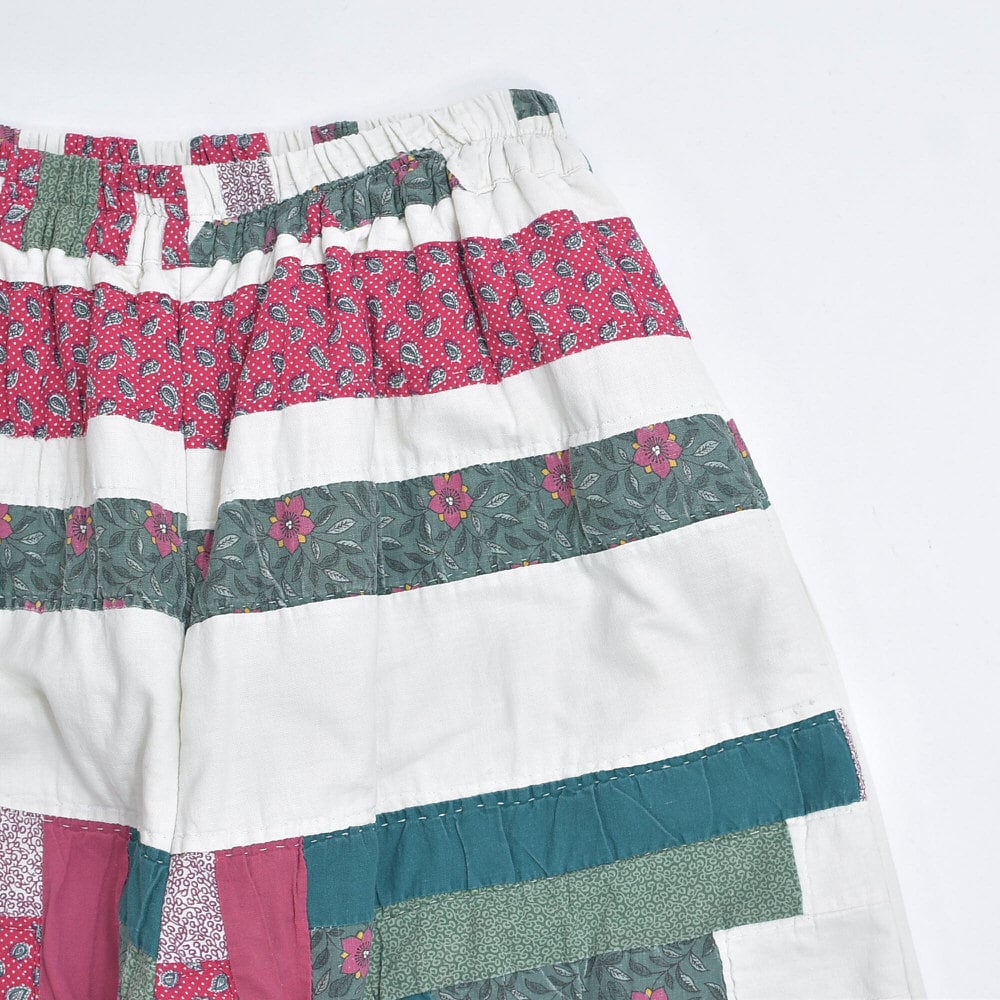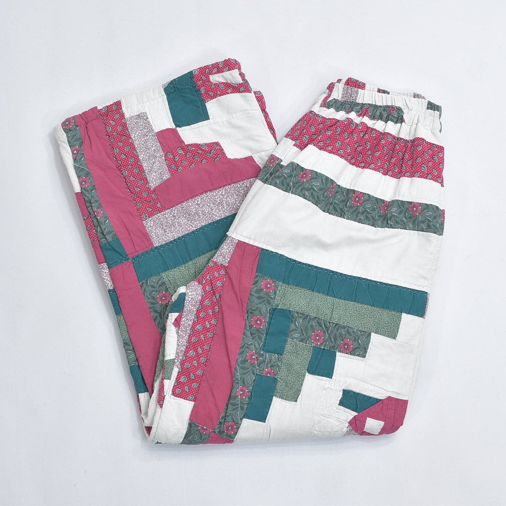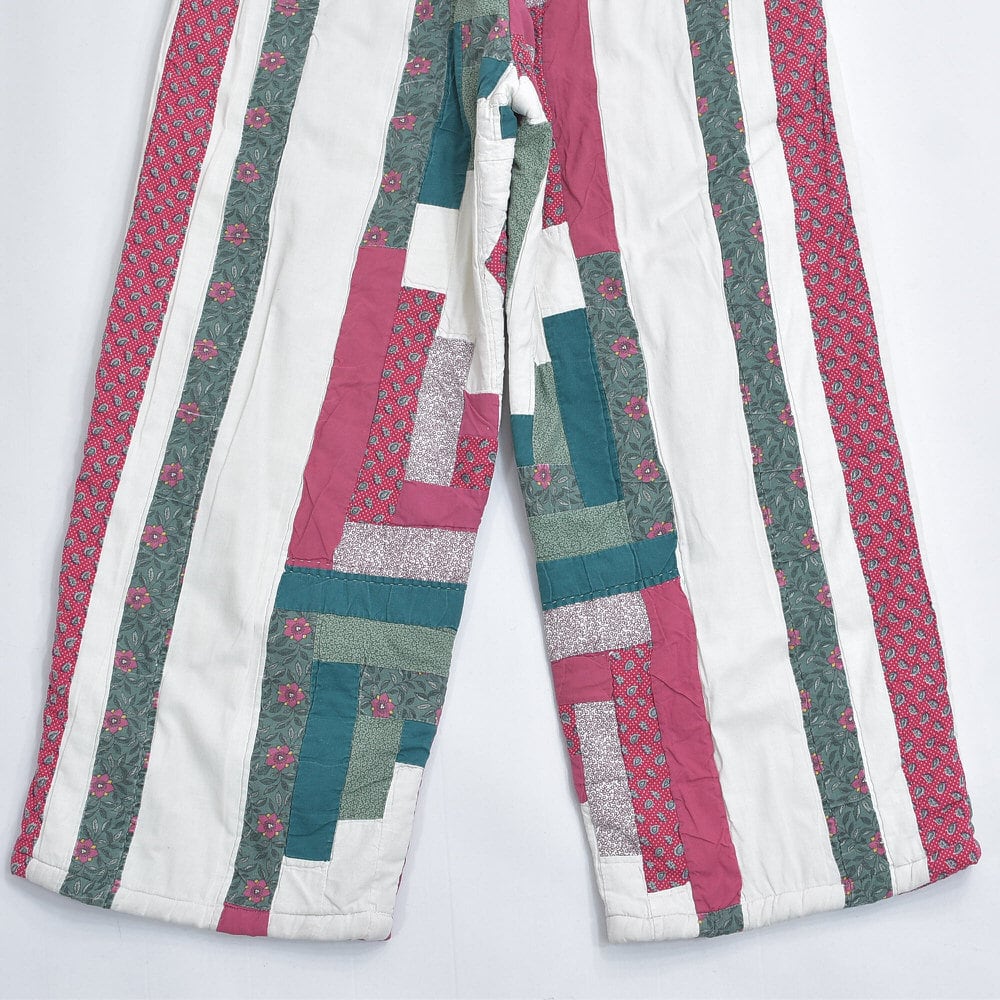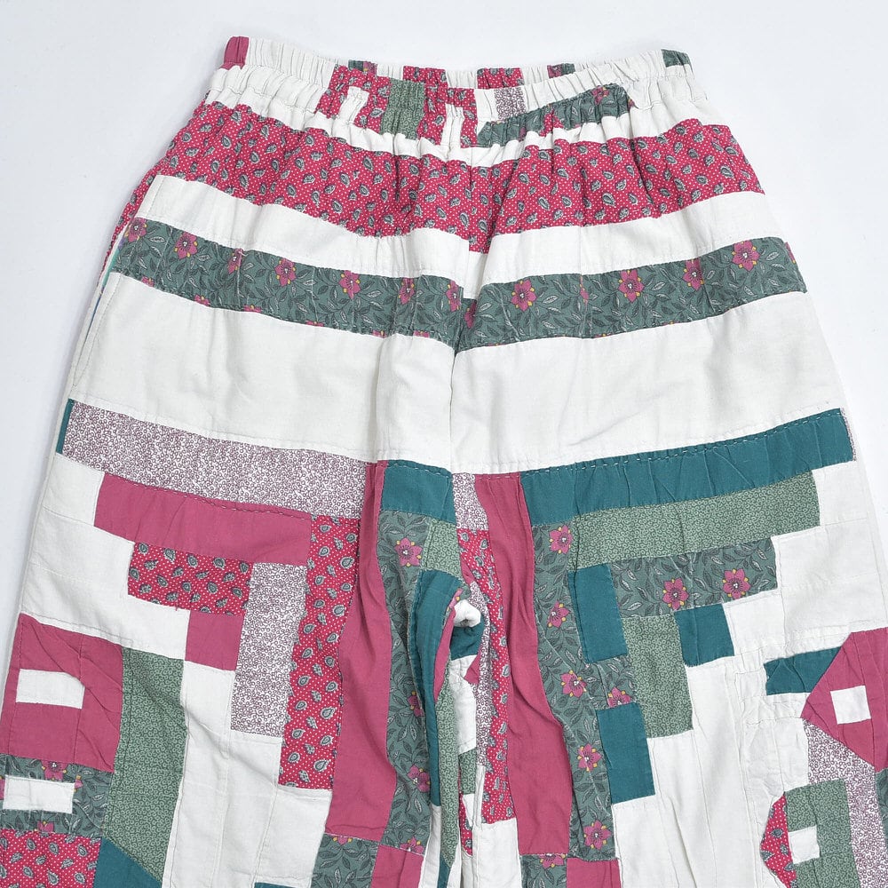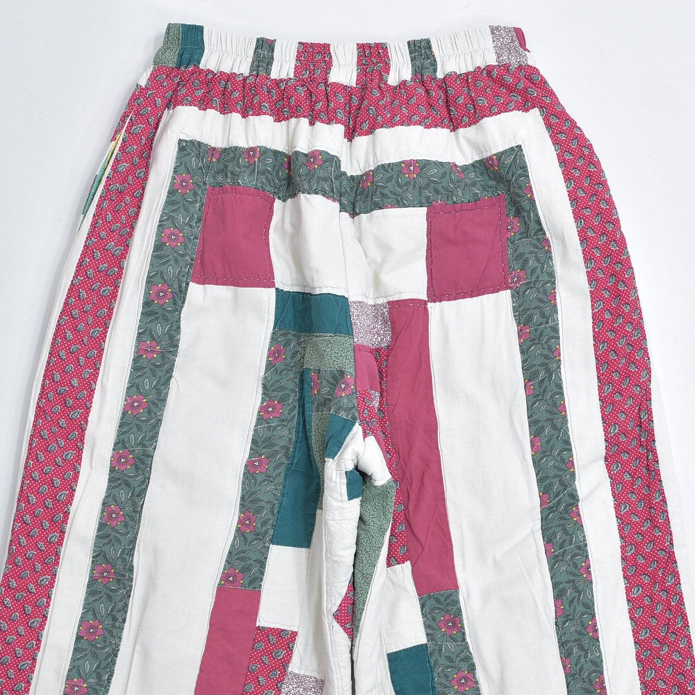 レトロな趣を感じる小さな花々が描かれたパッチワークのキルト生地をボトムスに再構築したリメイクパンツ