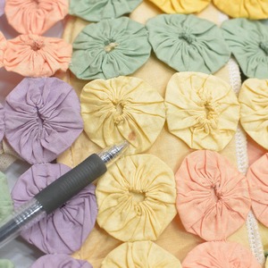 丸くカットした布を絞ってやっと一つ出来上がり