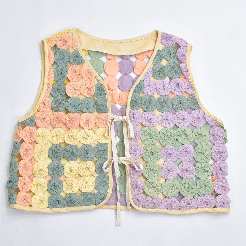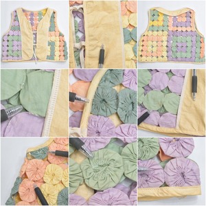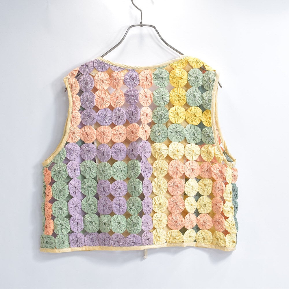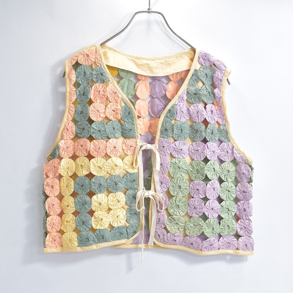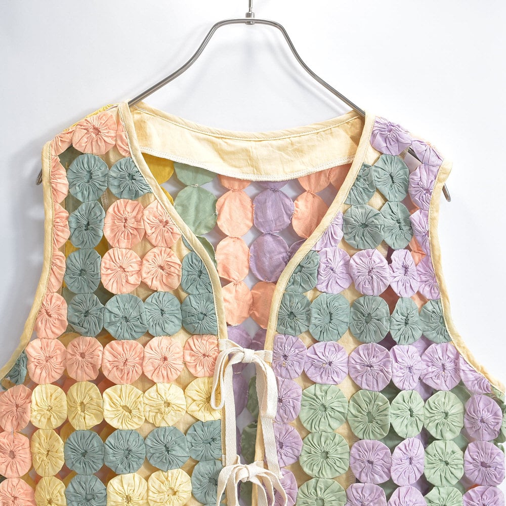 Remake ハンドメイド デザイン リメイク ヨーヨーキルト ベスト パッチワーク レース メッシュ 再構築 ツギハギ 幾何学模様 レトロ レディースL相当