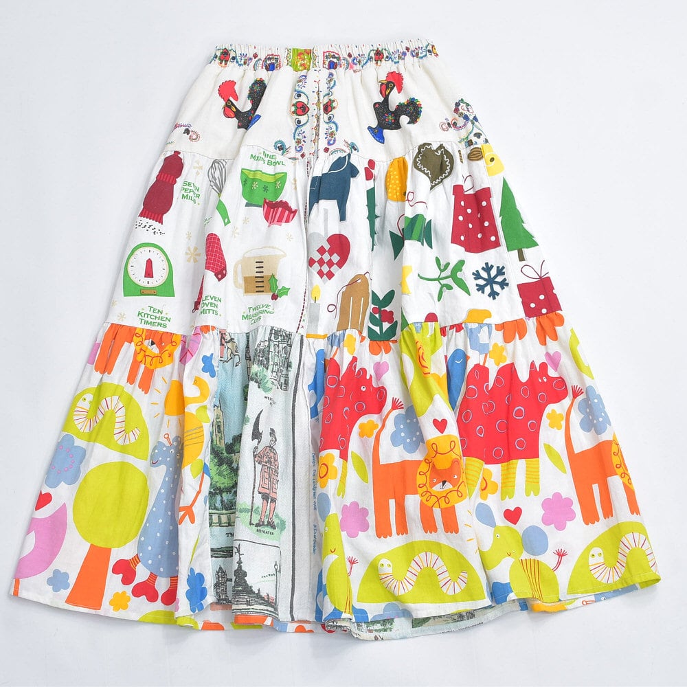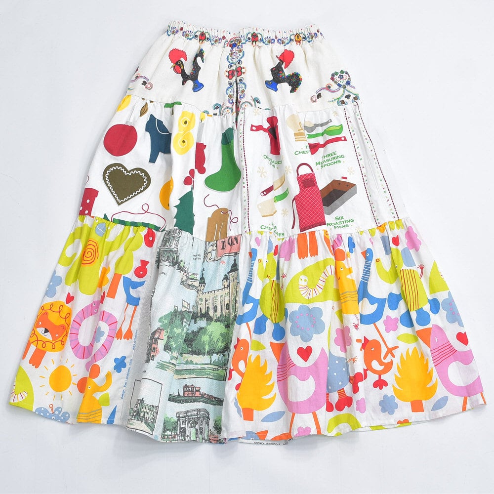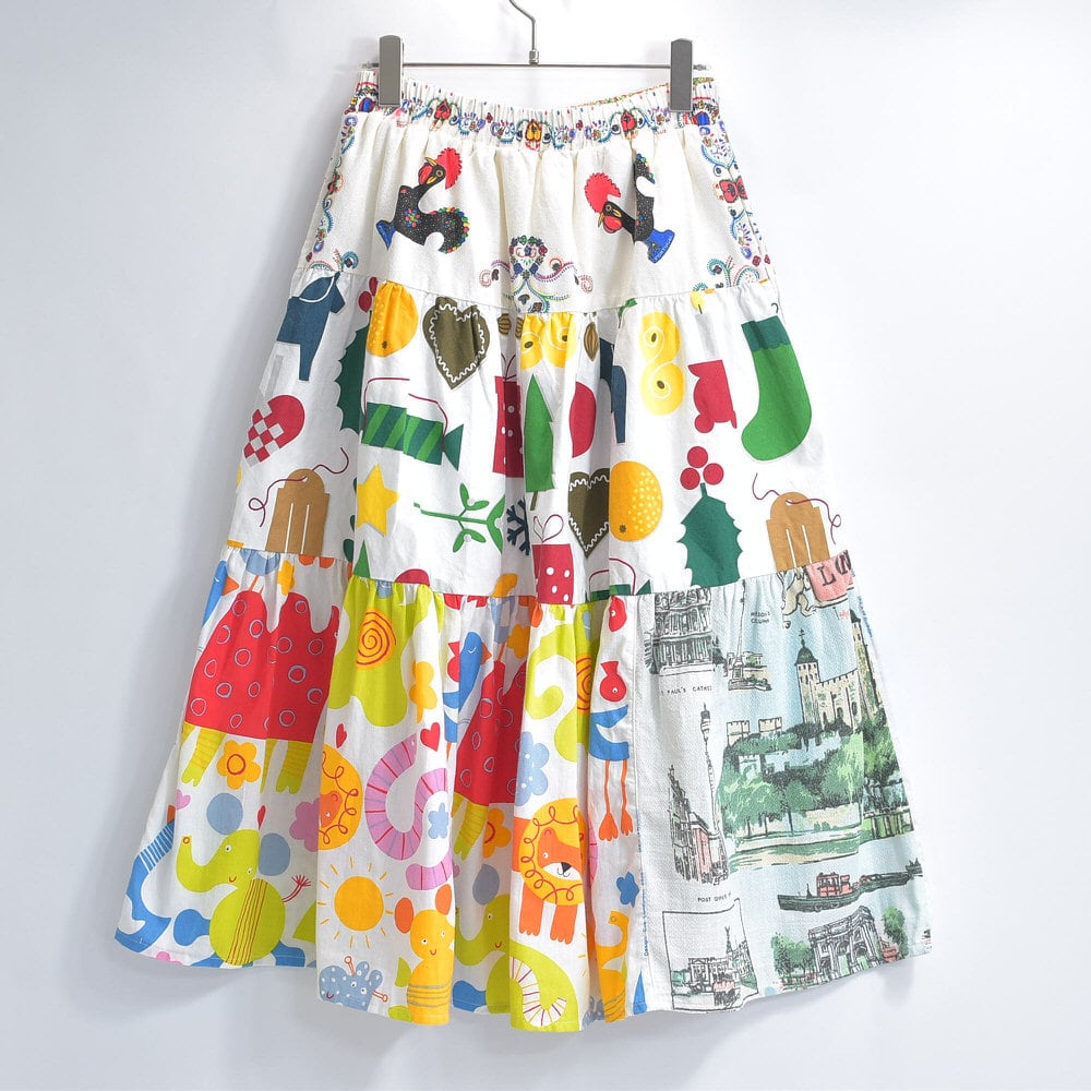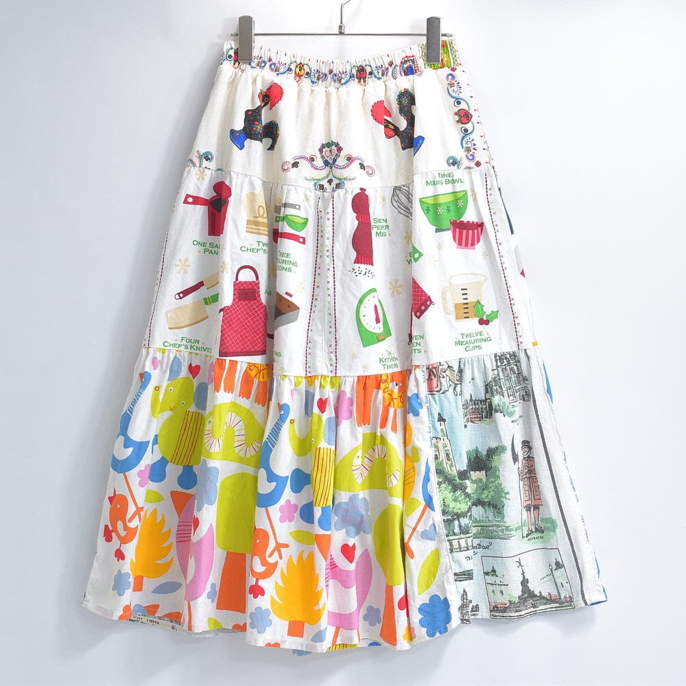 Remake リメイク ヴィンテージ テキスタイル パッチワーク デザイン ティアードスカート 裏地付き フレア 総柄 再構築 ツギハギ レディースW64〜96cm