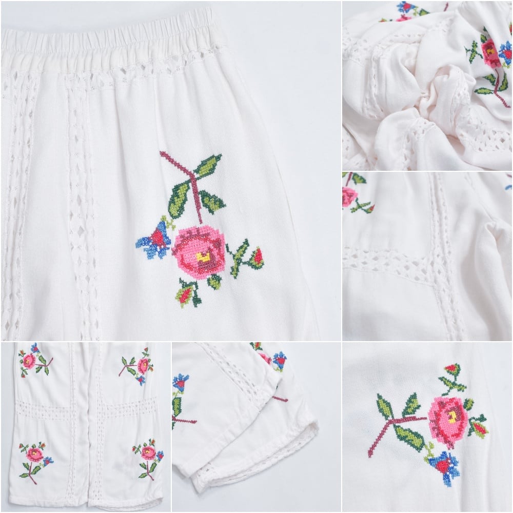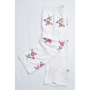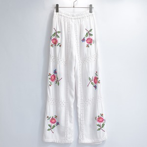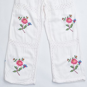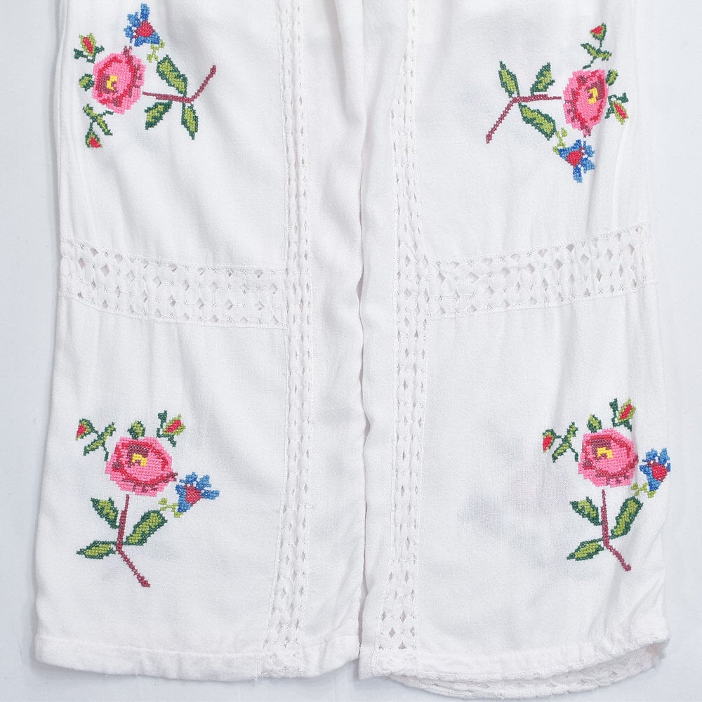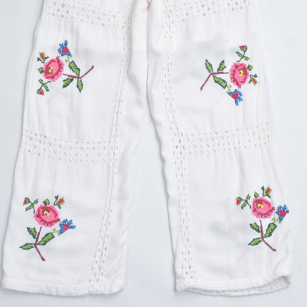 Remakeリメイク 再構築 パッチワーク&フラワー 刺繍 レース デザイン ルーズシルエット イージーパンツ トロミ ホワイト裏地付き ユニセックスサイズ W64〜98cm