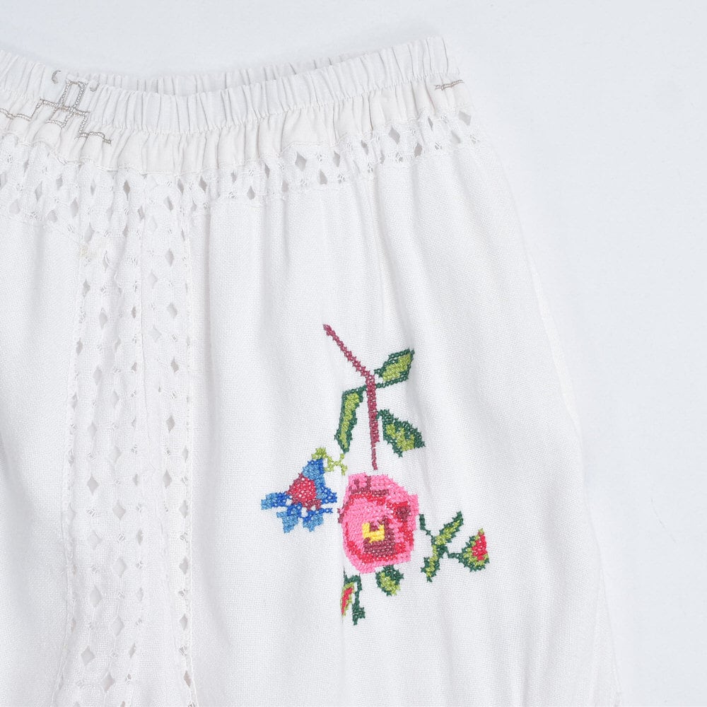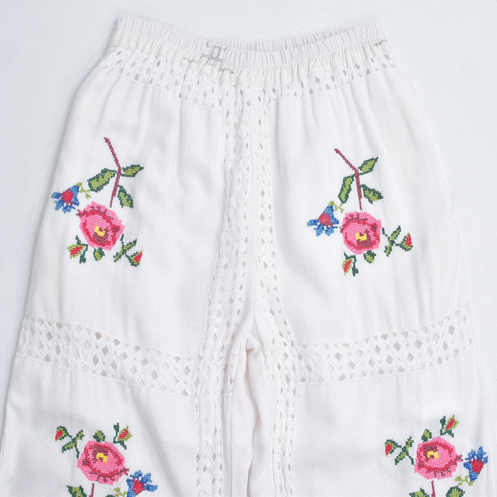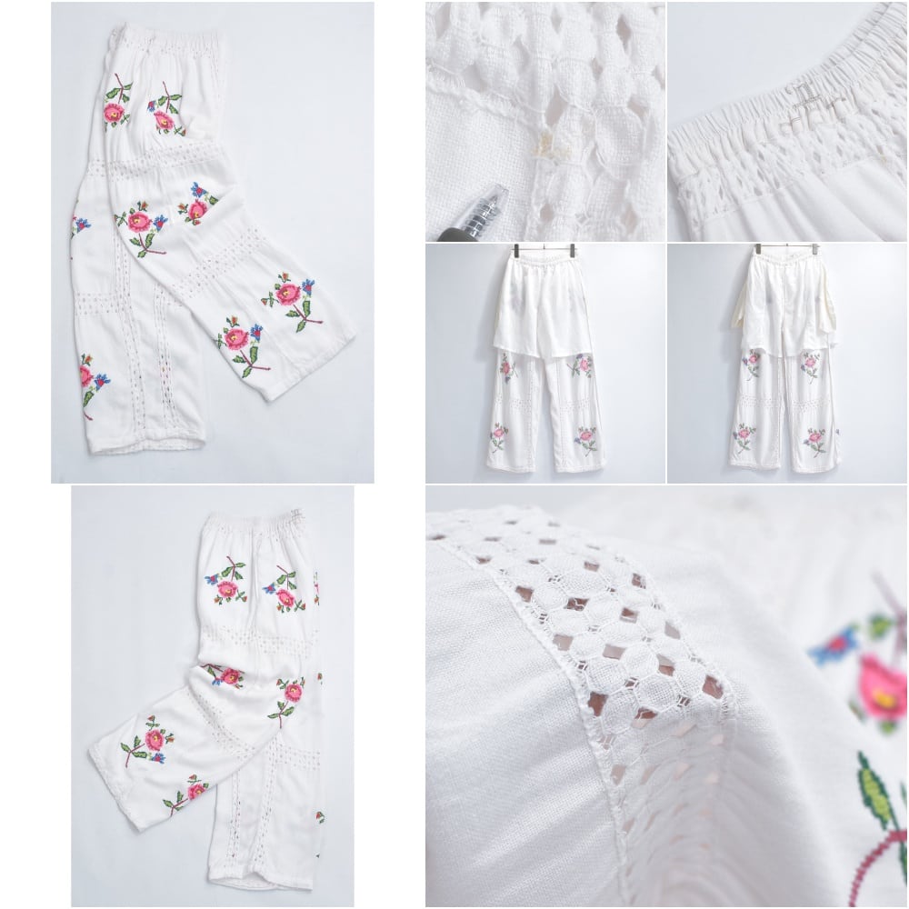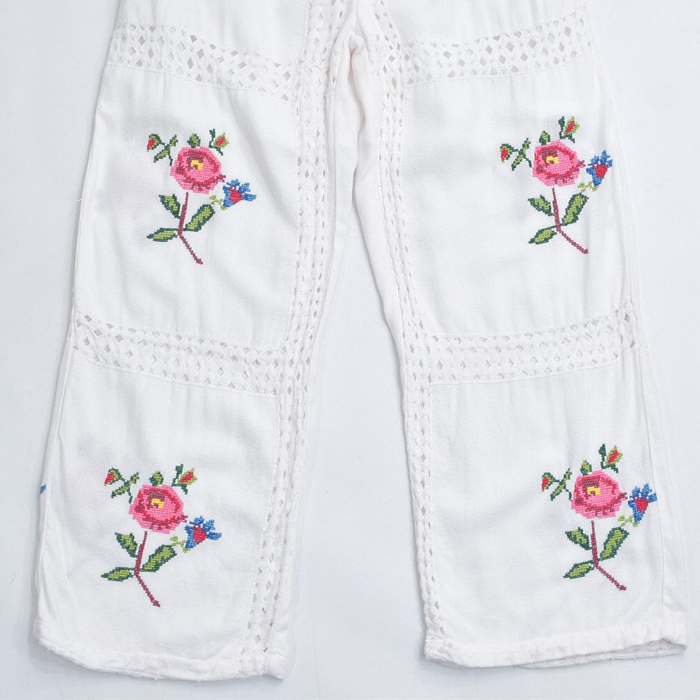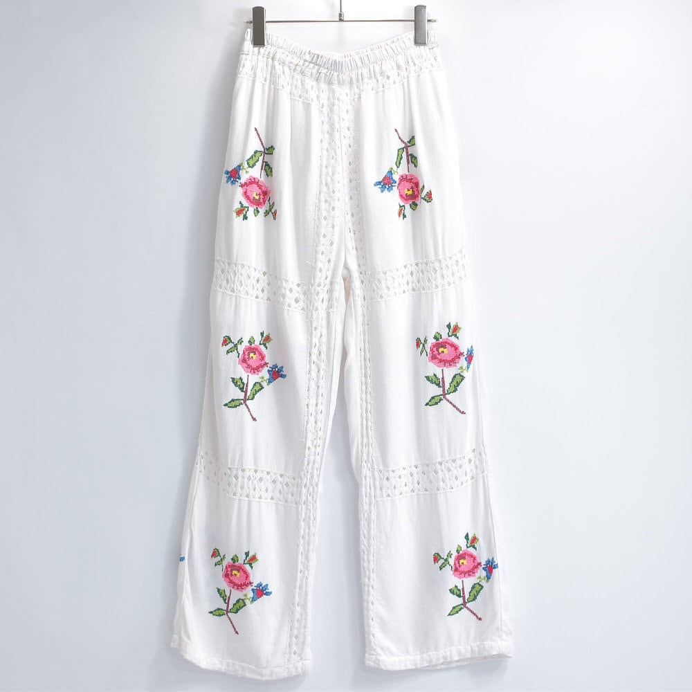 Remakeリメイク 再構築 パッチワーク&フラワー 刺繍 レース デザイン ルーズシルエット イージーパンツ トロミ ホワイト裏地付き ユニセックスサイズ W64~98cm
