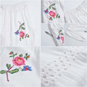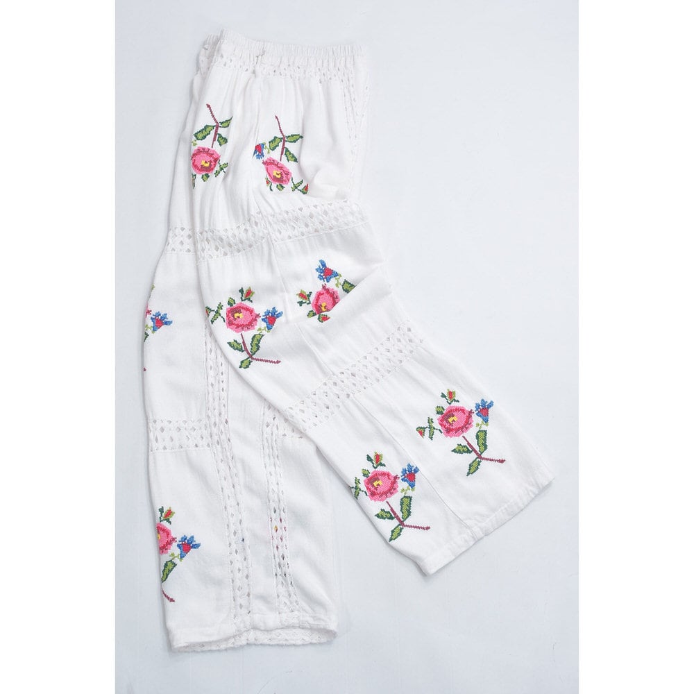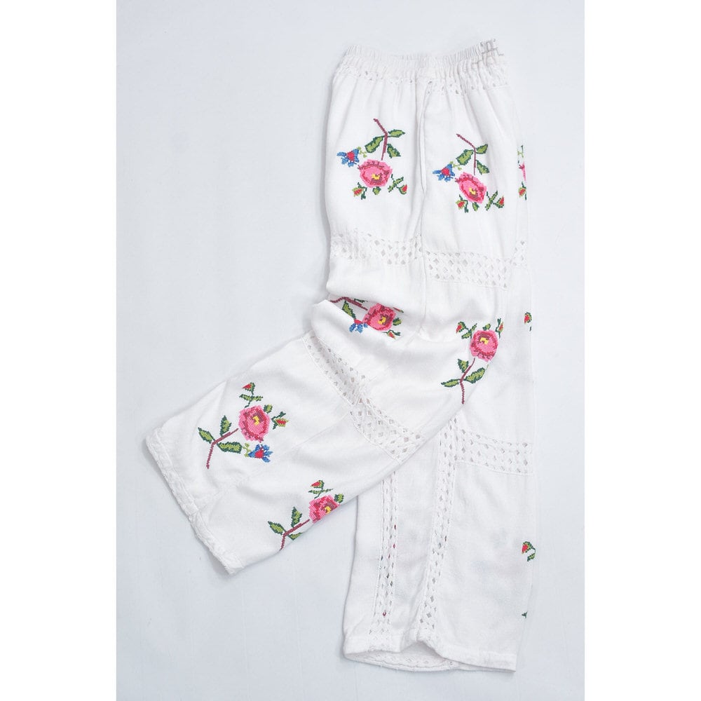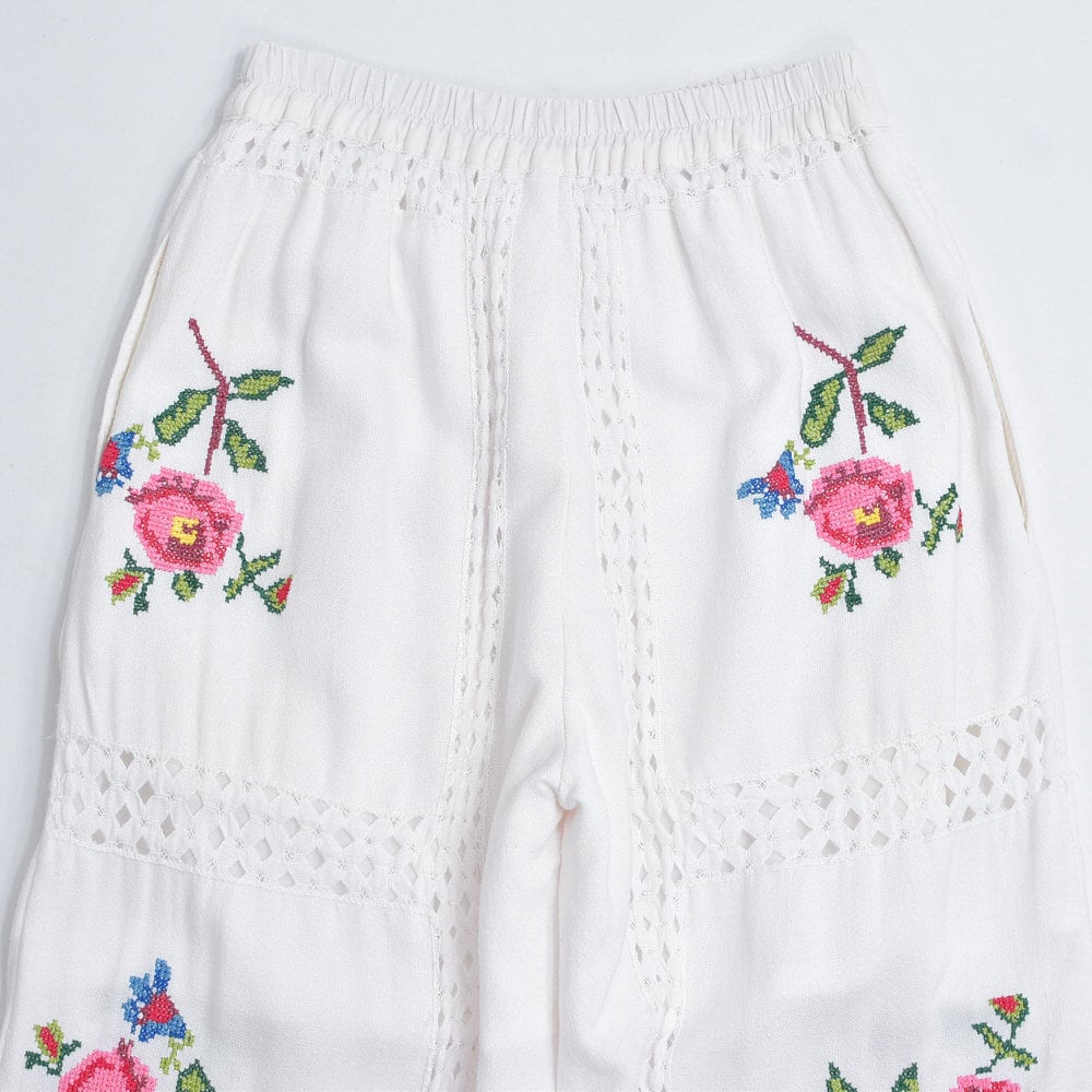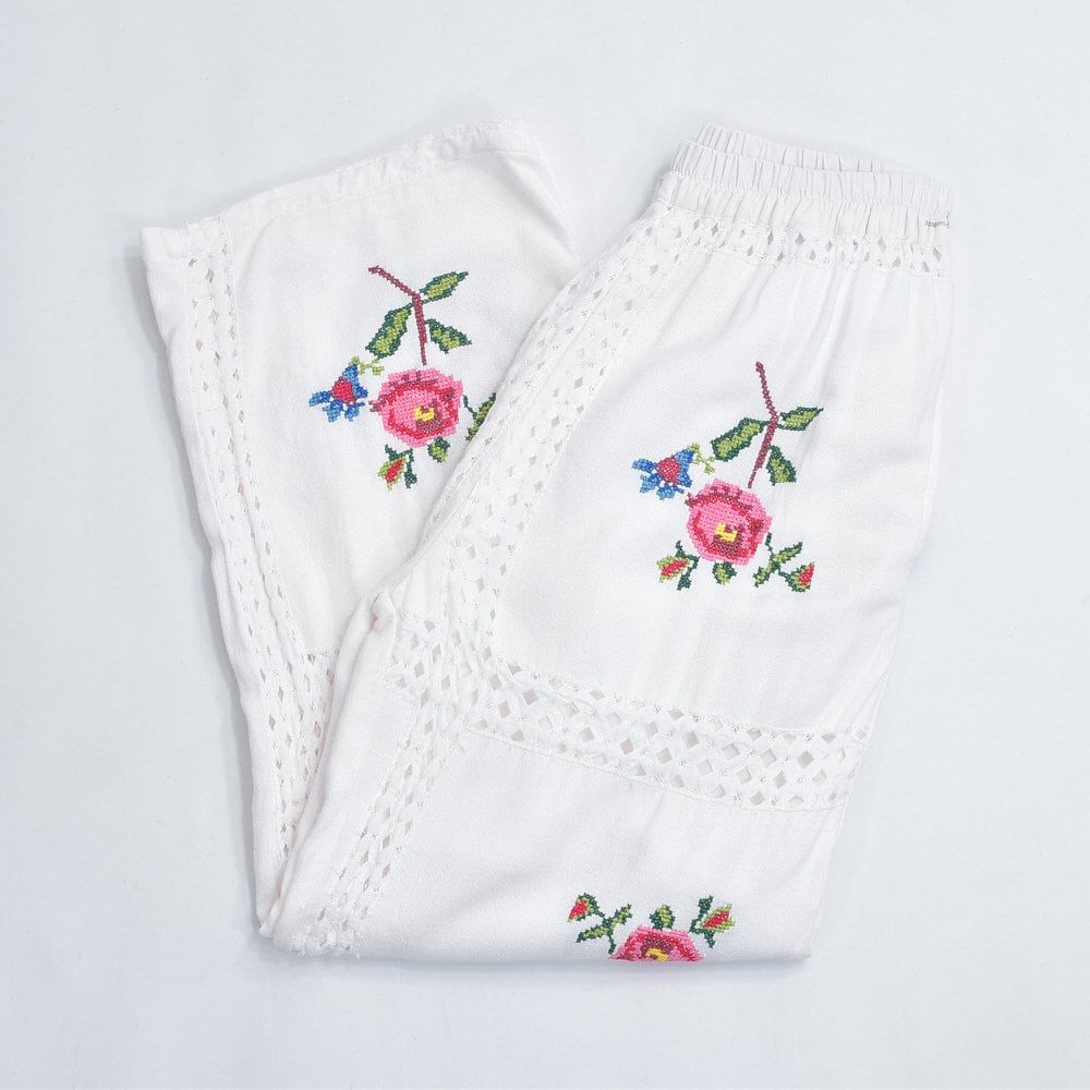 Remakeリメイク 再構築 パッチワーク&フラワー 刺繍 レース デザイン ルーズシルエット イージーパンツ トロミ ホワイト裏地付き ユニセックスサイズ W64~98cm