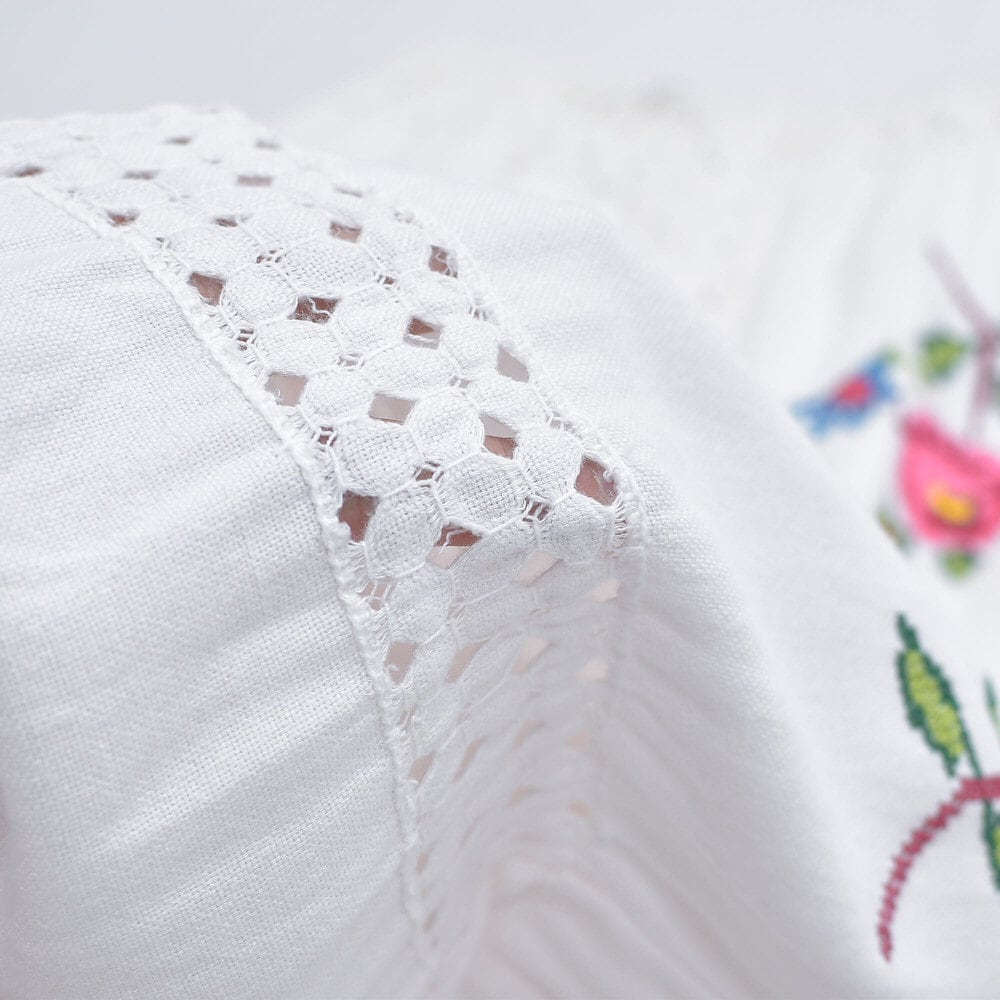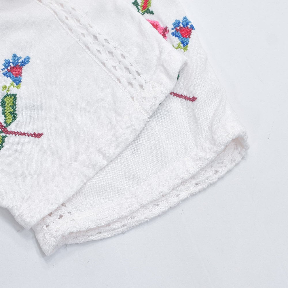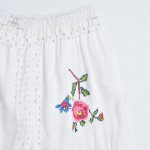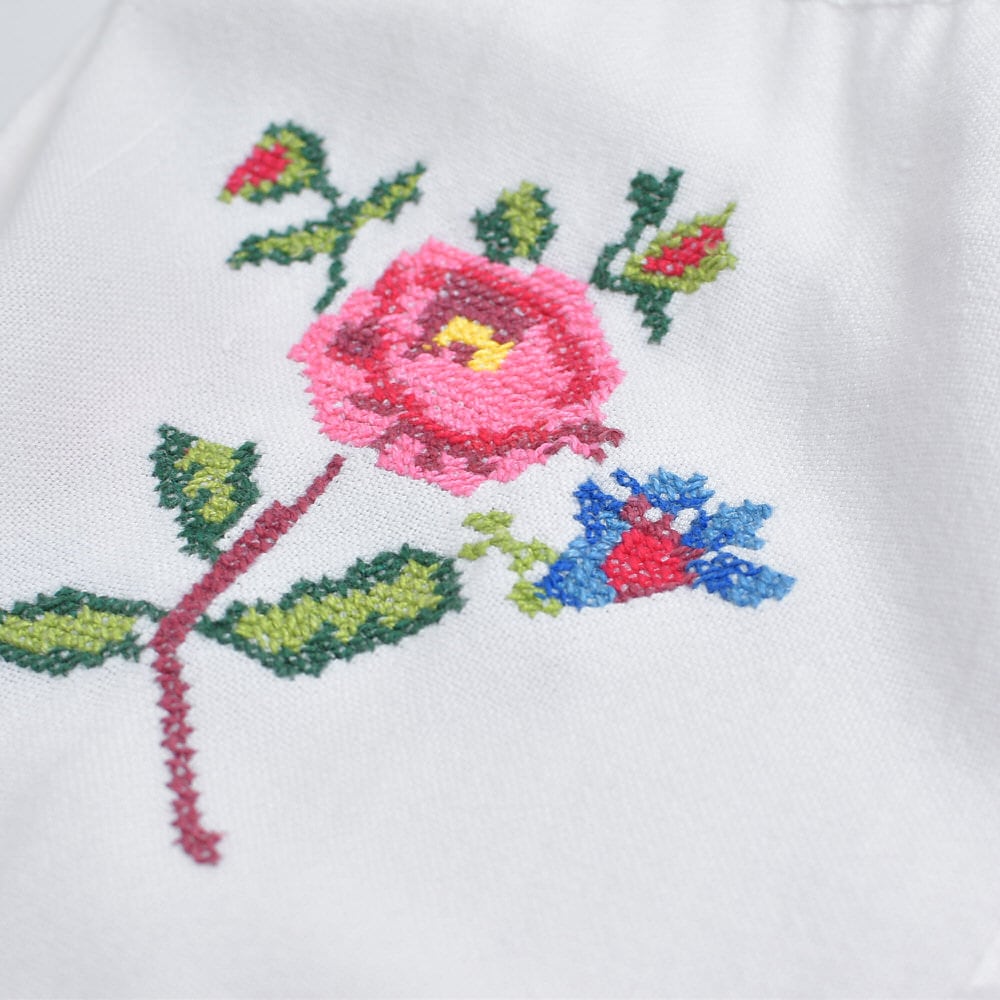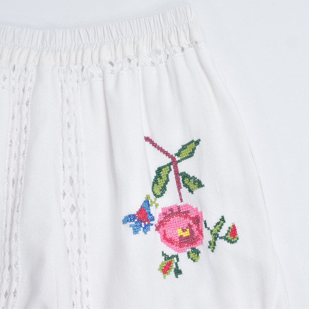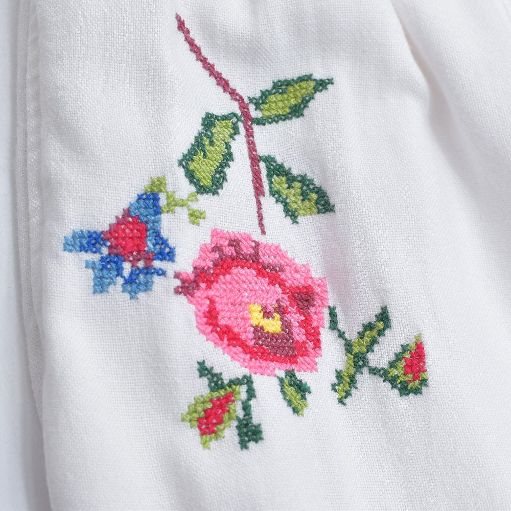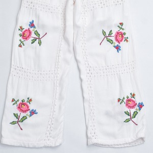 そこにそっと添えられた優しい気持ちになれるクロスステッチのお花が描かれたリメイクパンツ