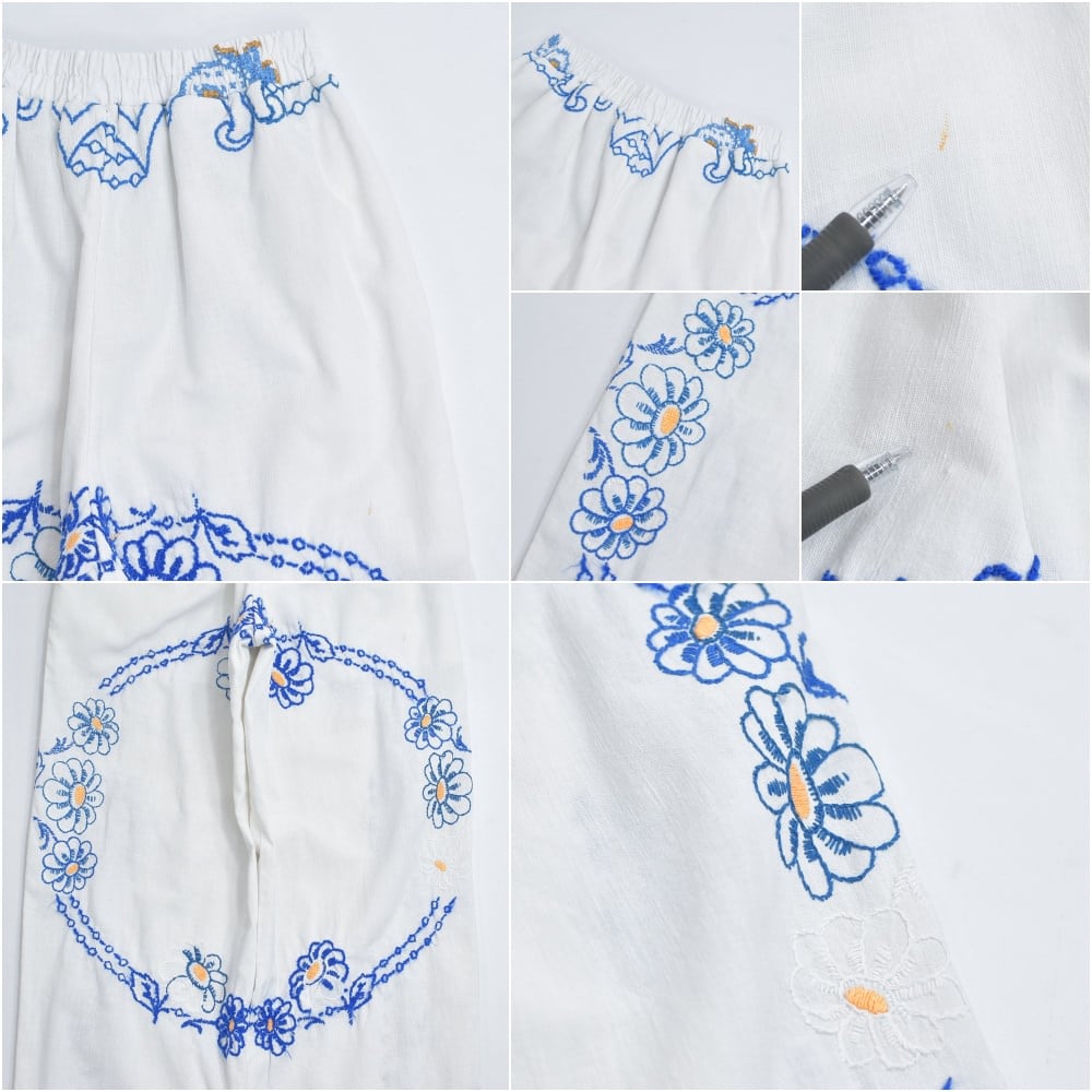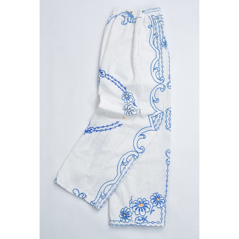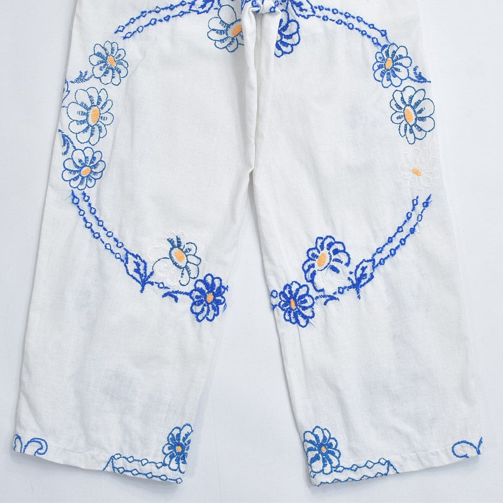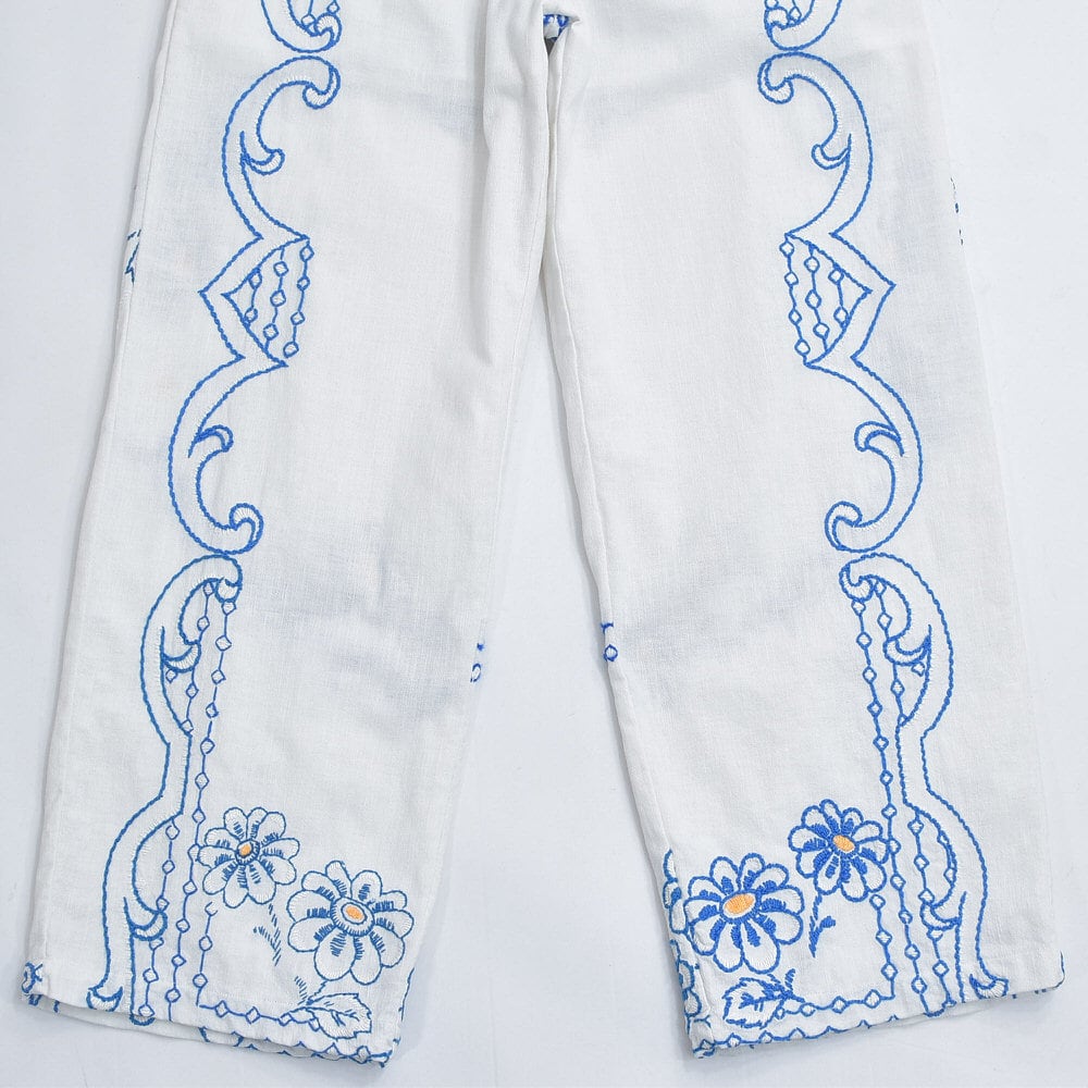 Remakeリメイク 再構築 パッチワーク&フラワー 刺繍 デザイン ルーズシルエット リネン コットン イージーパンツ ホワイト 裏地付き ユニセックスデザイン W60~96cm