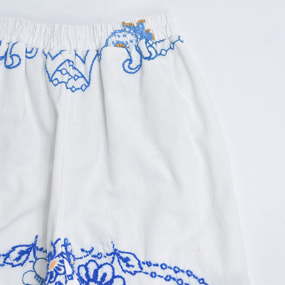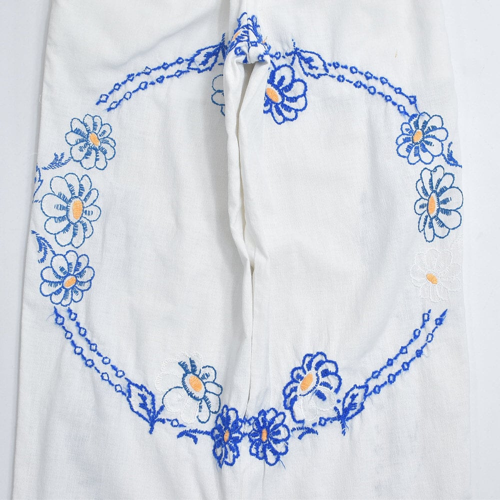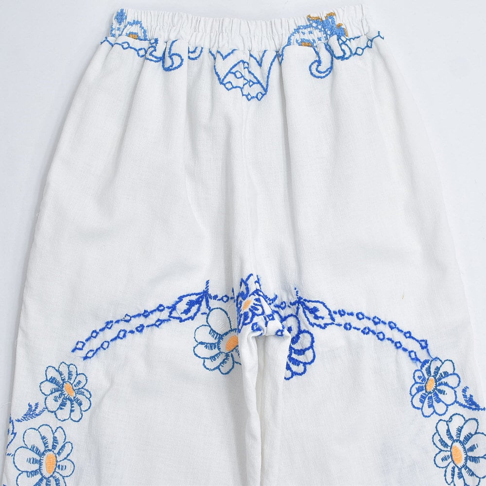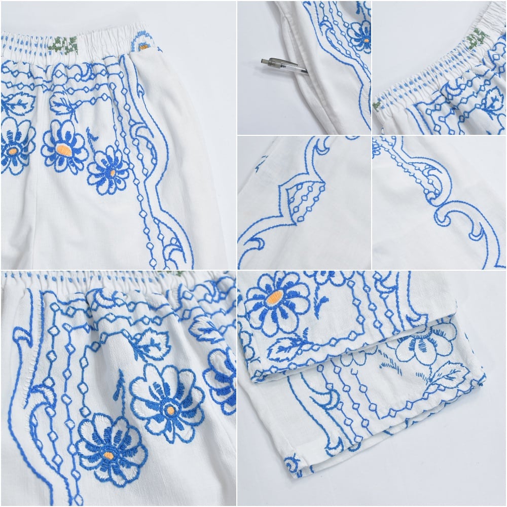 Remakeリメイク 再構築 パッチワーク&フラワー 刺繍 デザイン ルーズシルエット リネン コットン イージーパンツ ホワイト 裏地付き ユニセックスデザイン W60~96cm