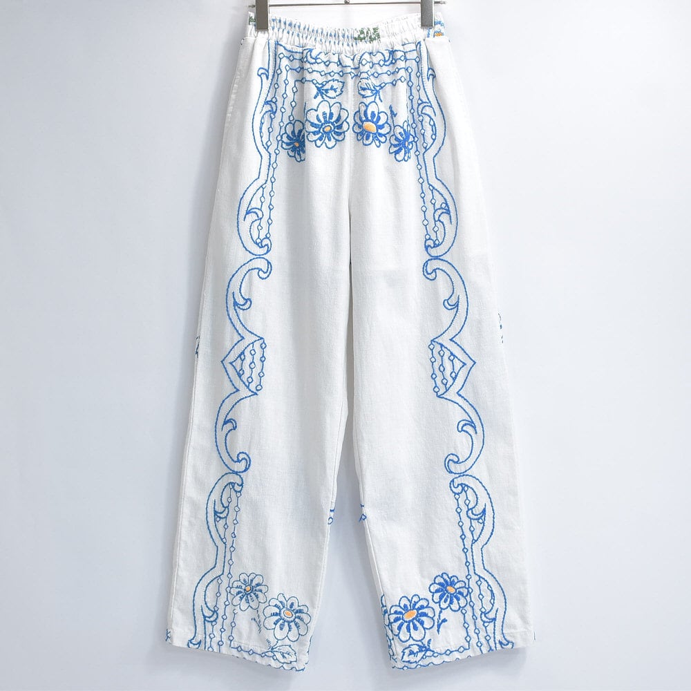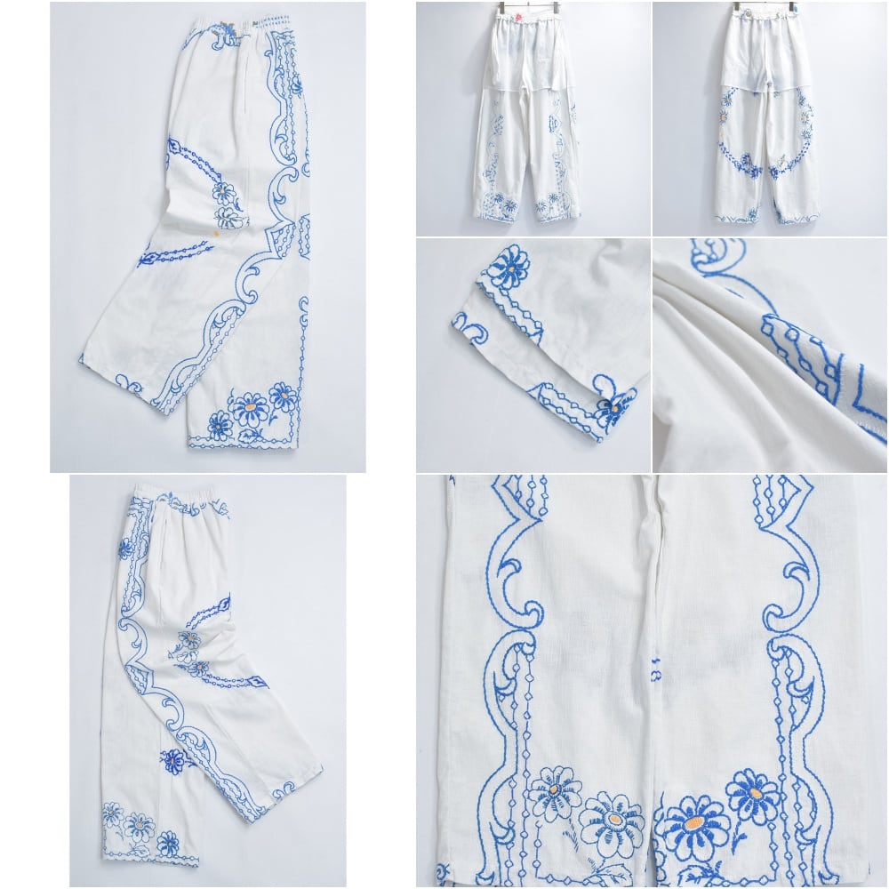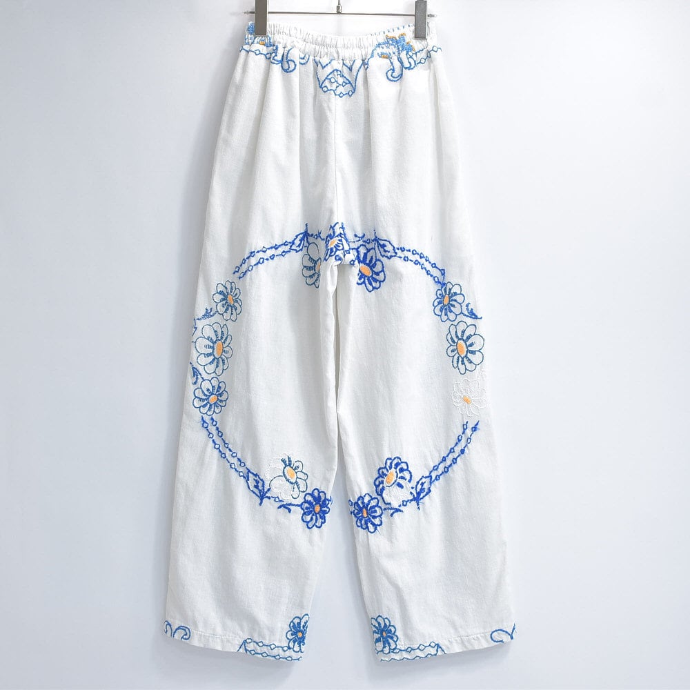Remakeリメイク 再構築 パッチワーク&フラワー 刺繍 デザイン ルーズシルエット リネン コットン イージーパンツ ホワイト 裏地付き ユニセックスデザイン W60〜96cm