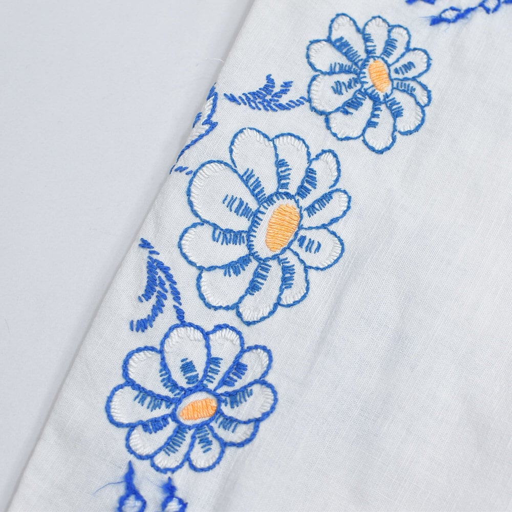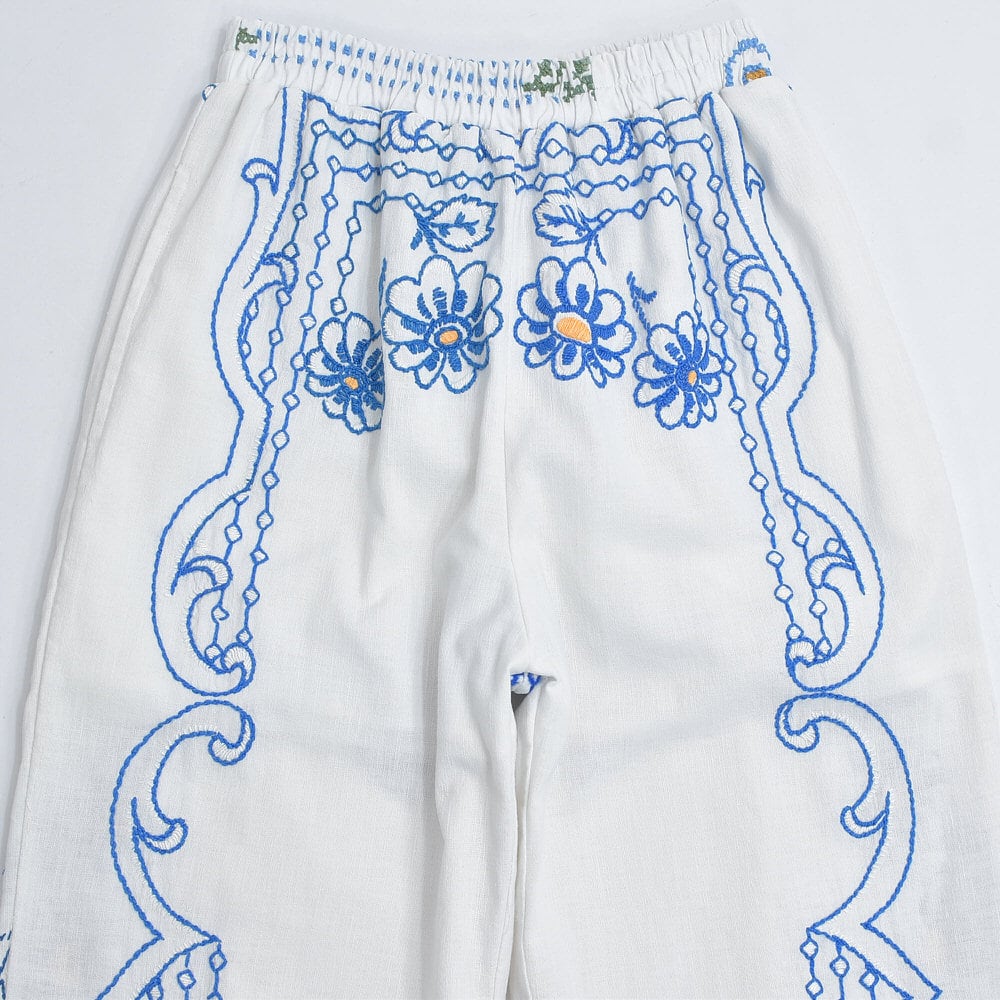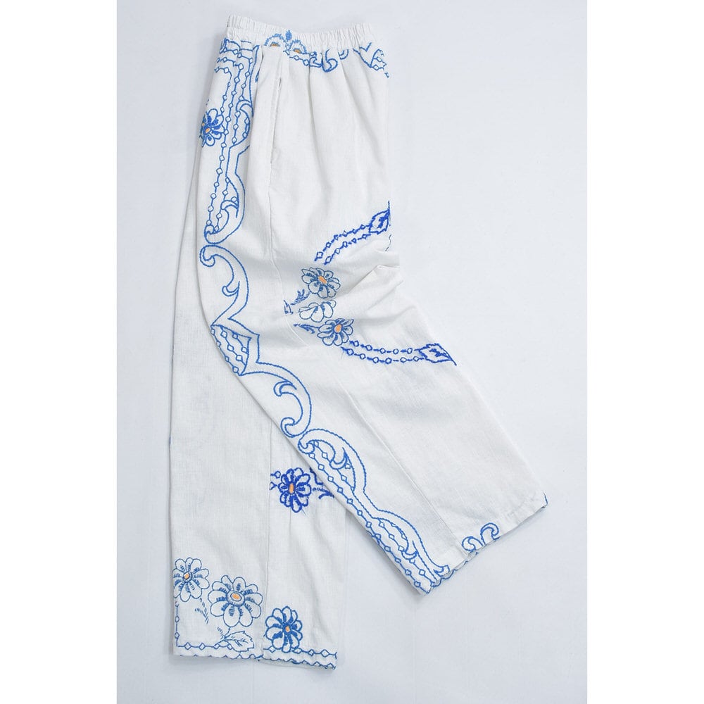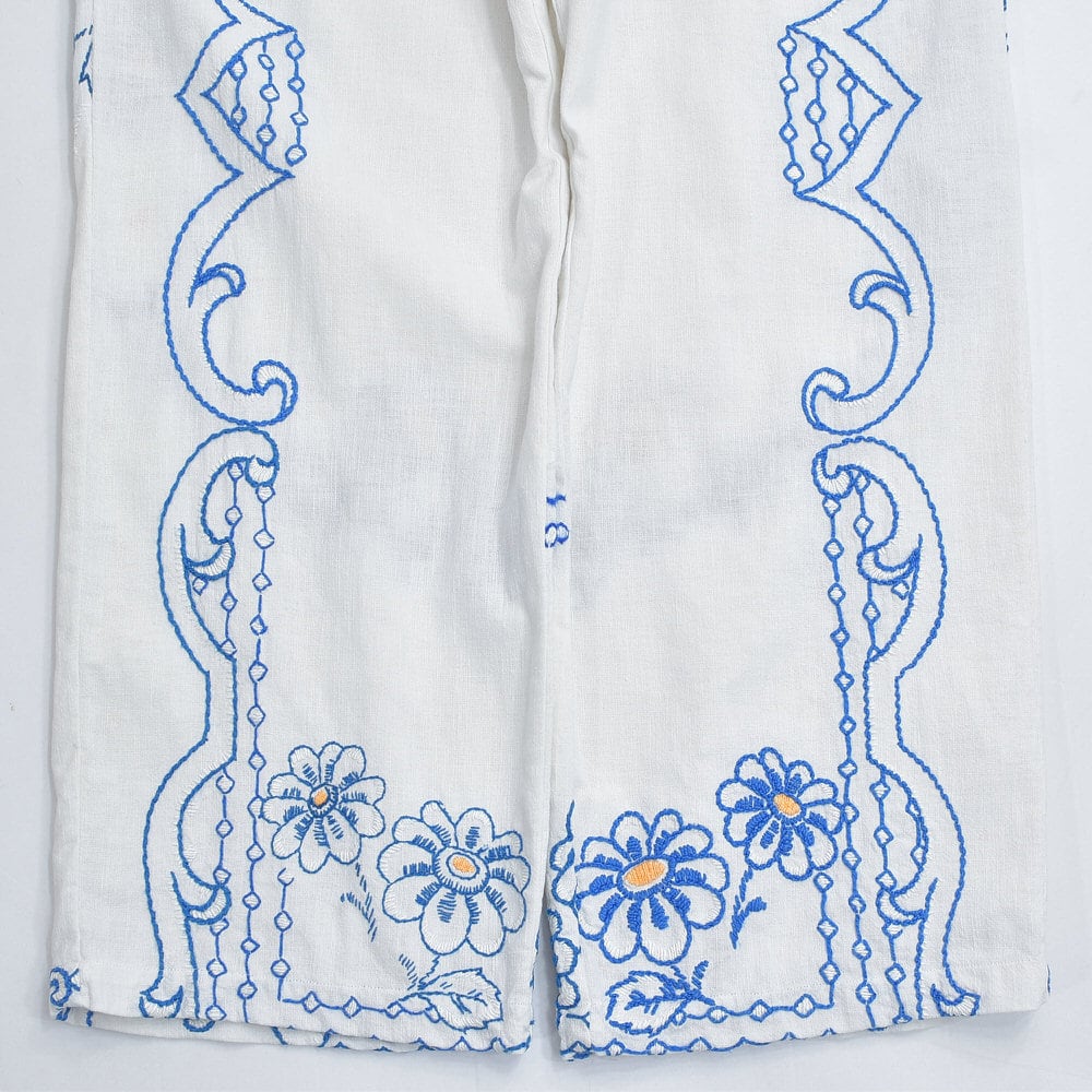 Remakeリメイク 再構築 パッチワーク&フラワー 刺繍 デザイン ルーズシルエット リネン コットン イージーパンツ ホワイト 裏地付き ユニセックスデザイン W60〜96cm