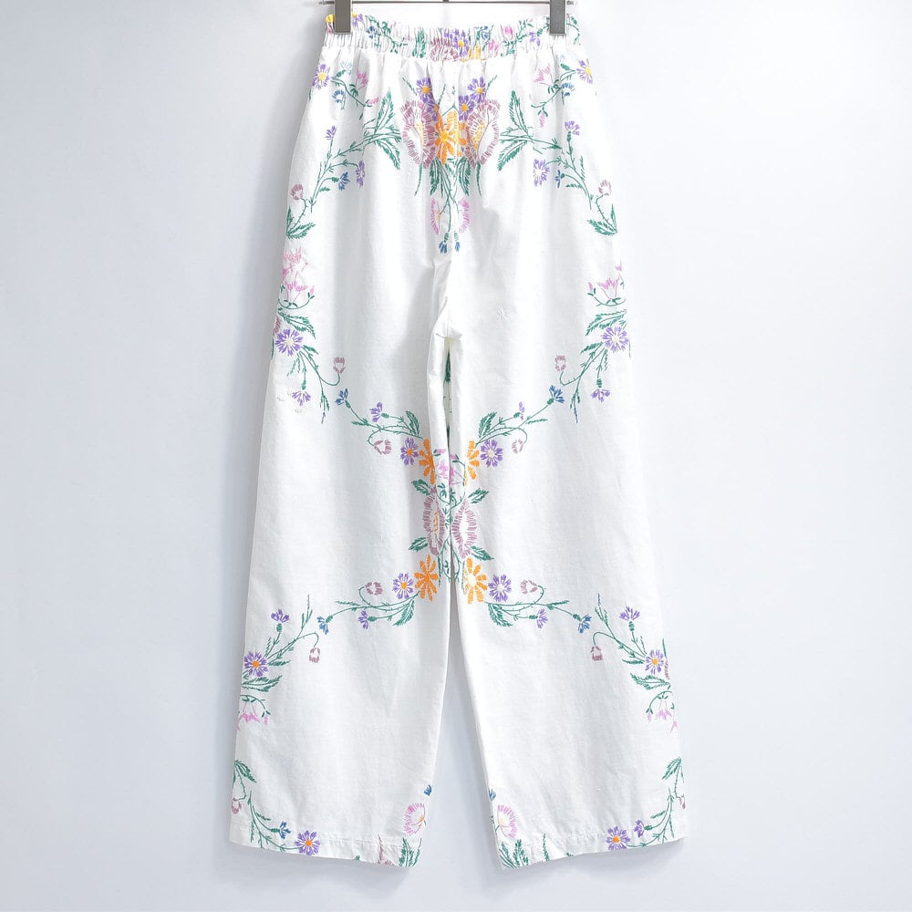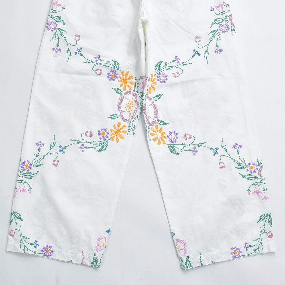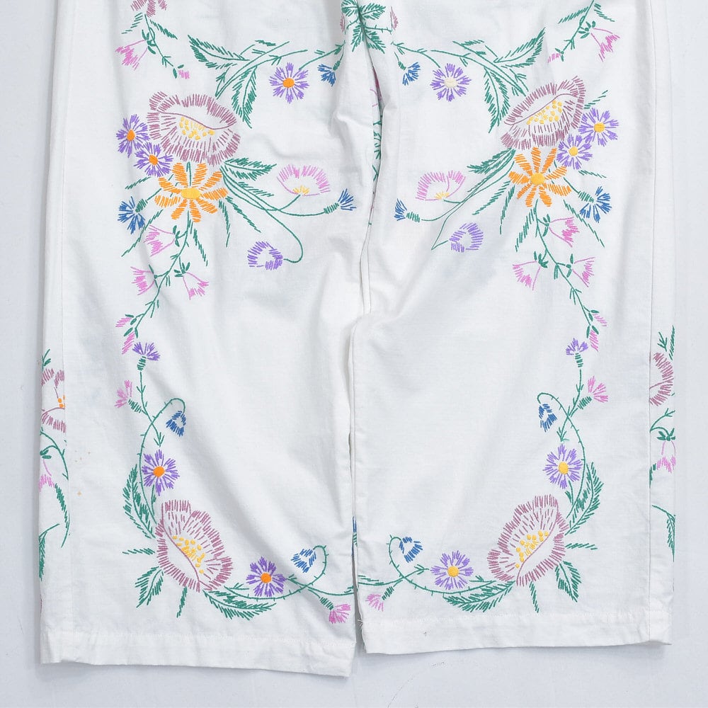 Remakeリメイク 再構築 パッチワーク&フラワー 刺繍 デザイン ルーズシルエット コットン イージーパンツ ホワイト 花柄 裏地付き ユニセックスデザイン W60〜92cm