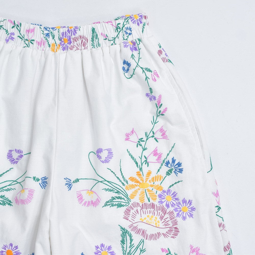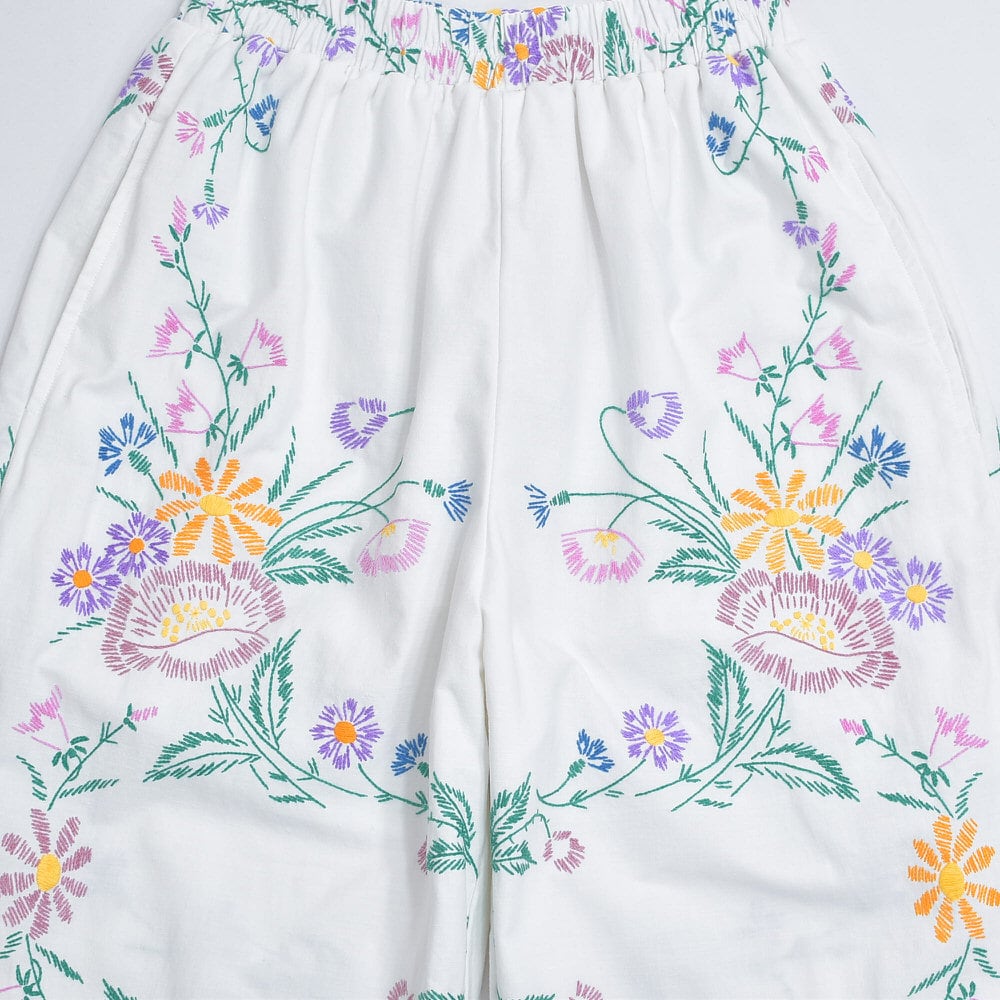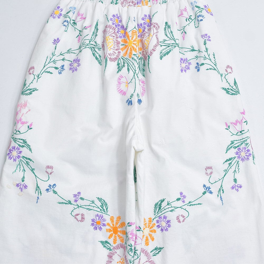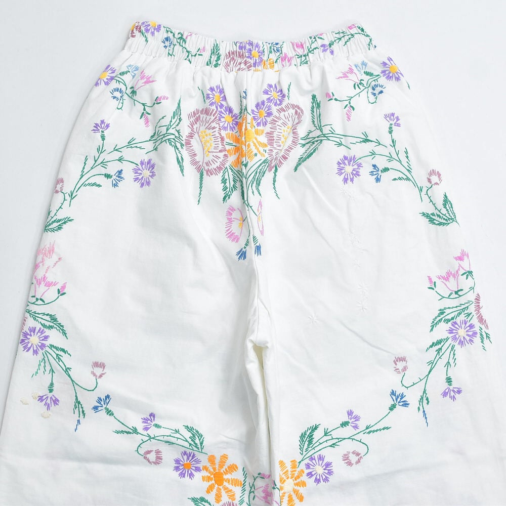 Remakeリメイク 再構築 パッチワーク&フラワー 刺繍 デザイン ルーズシルエット コットン イージーパンツ ホワイト 花柄 裏地付き ユニセックスデザイン W60〜92cm