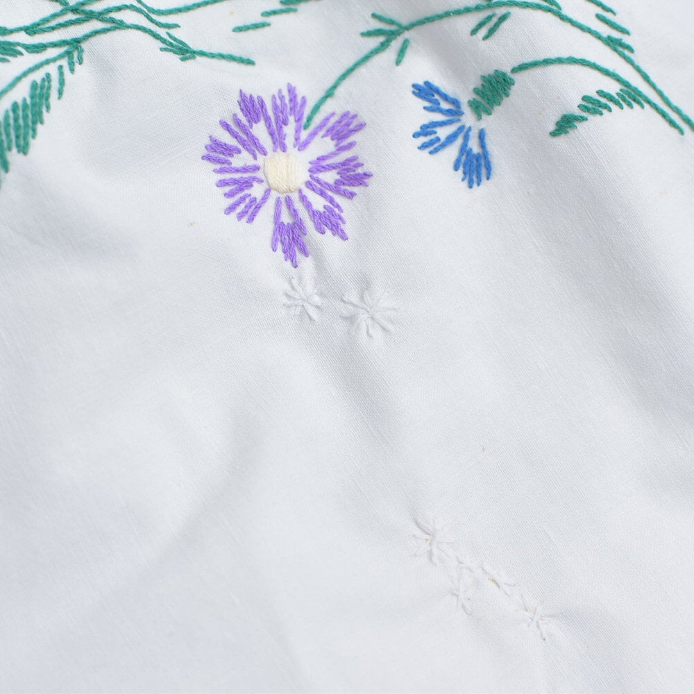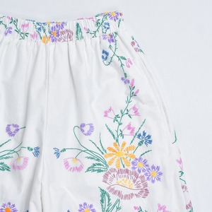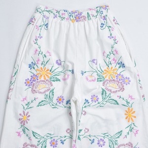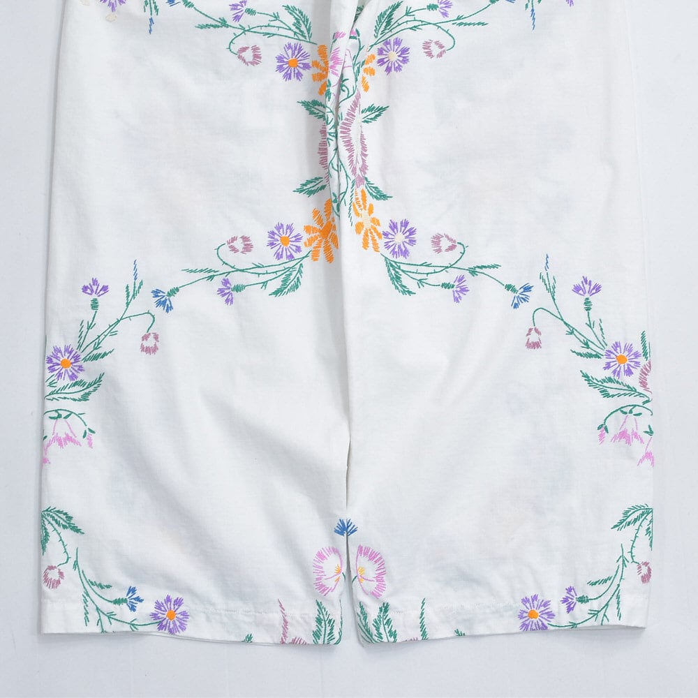 可愛らしいお花が描かれた刺繍クロスの生地をボトムスに再構築したパッチワークのリメイクパンツ
