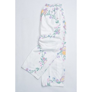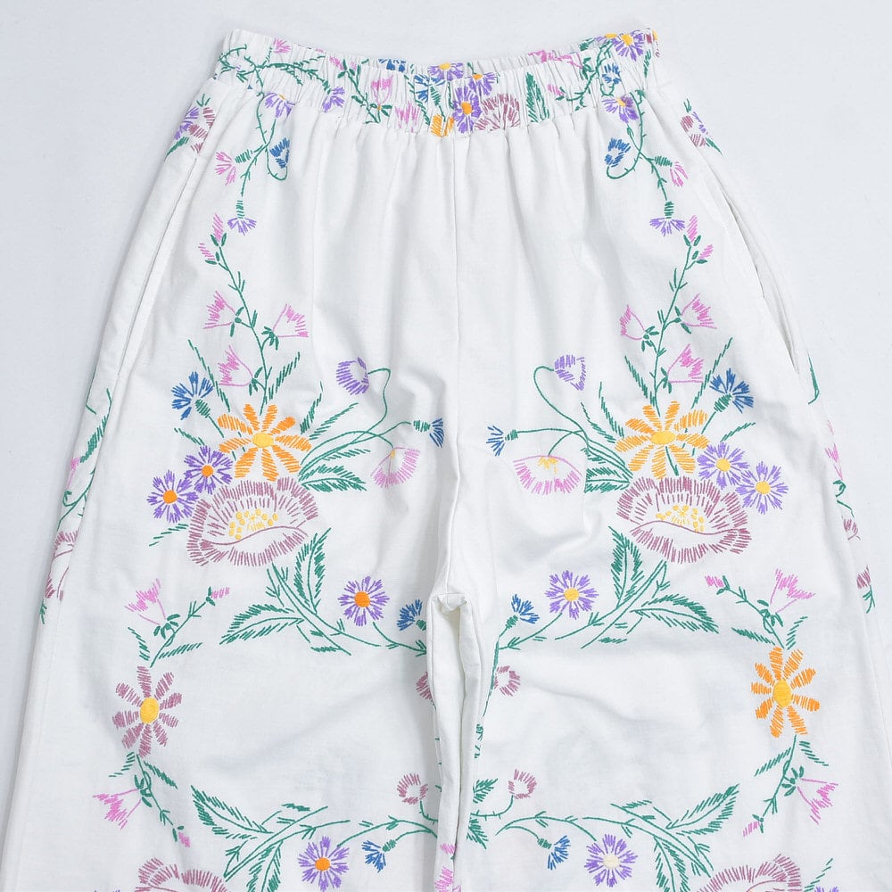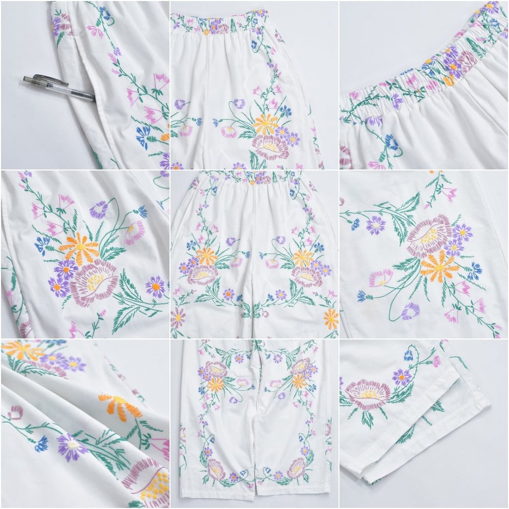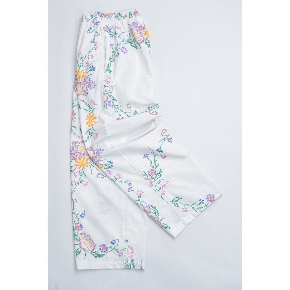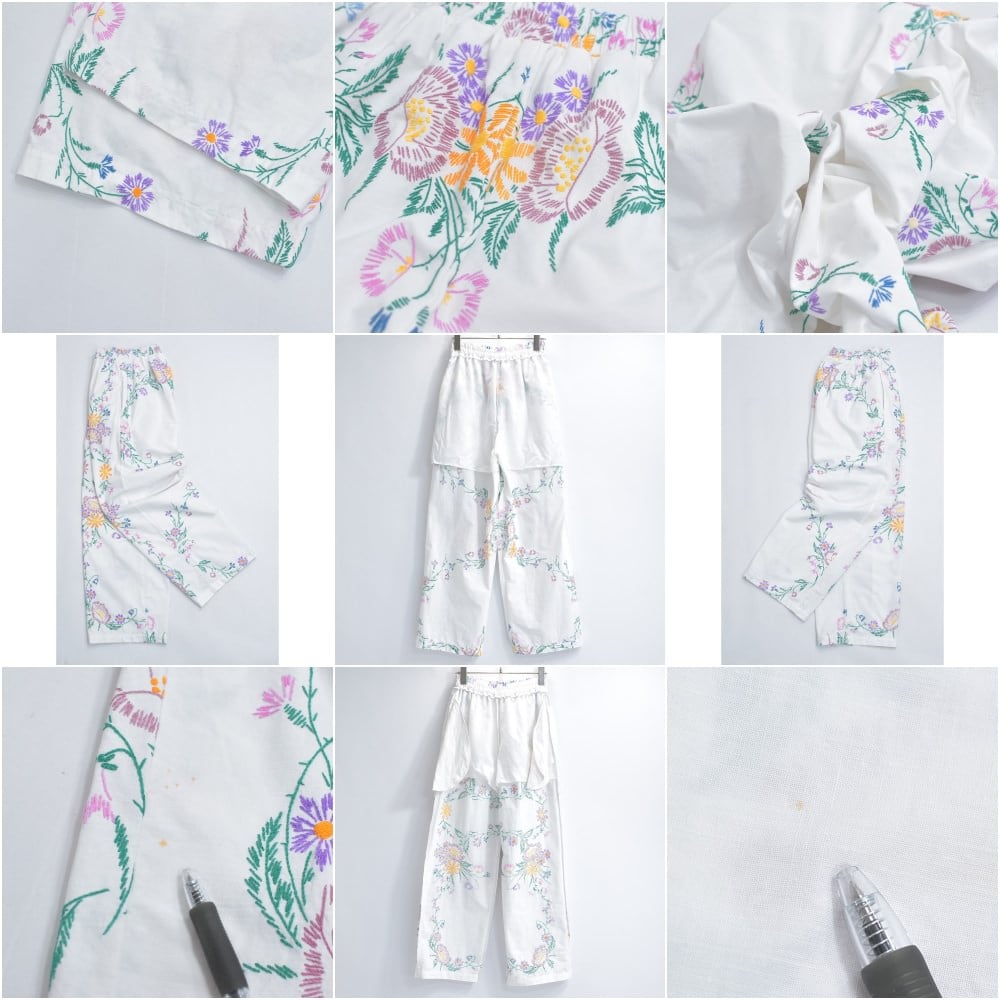 Remakeリメイク 再構築 パッチワーク&フラワー 刺繍 デザイン ルーズシルエット コットン イージーパンツ ホワイト 花柄 裏地付き ユニセックスデザイン W60~92cm