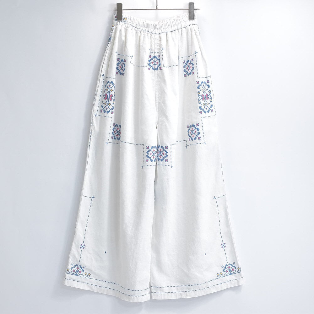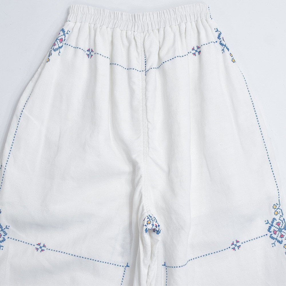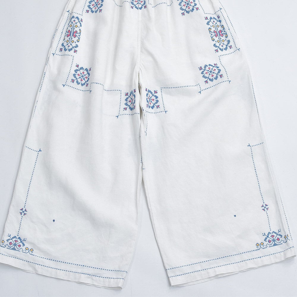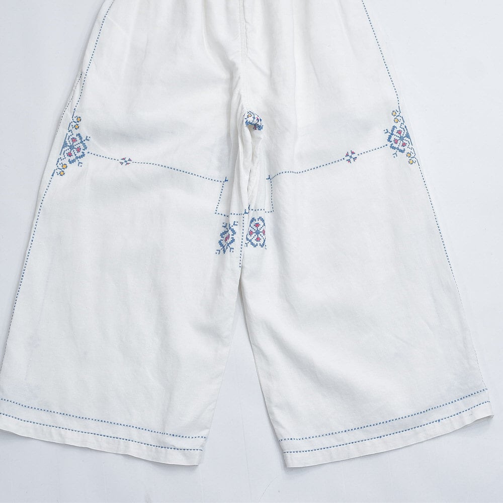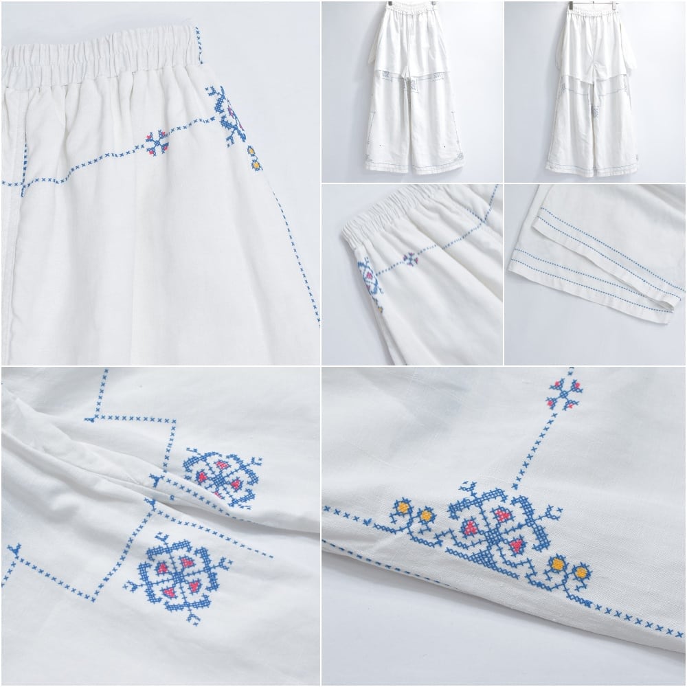 Remakeリメイク 再構築 パッチワーク&クロスステッチ フラワー刺繍 デザイン ワイドシルエット バギー パンツ リネン ホワイト 裏地付き ユニセックスデザイン W60~98cm
