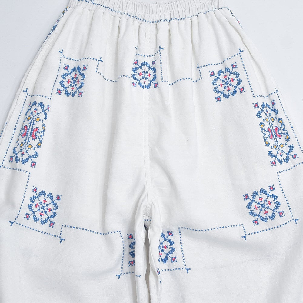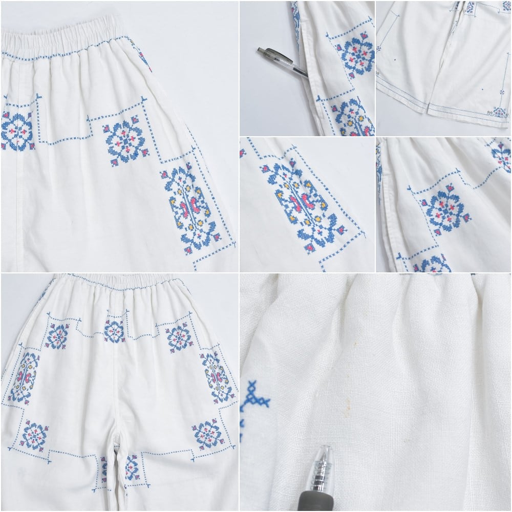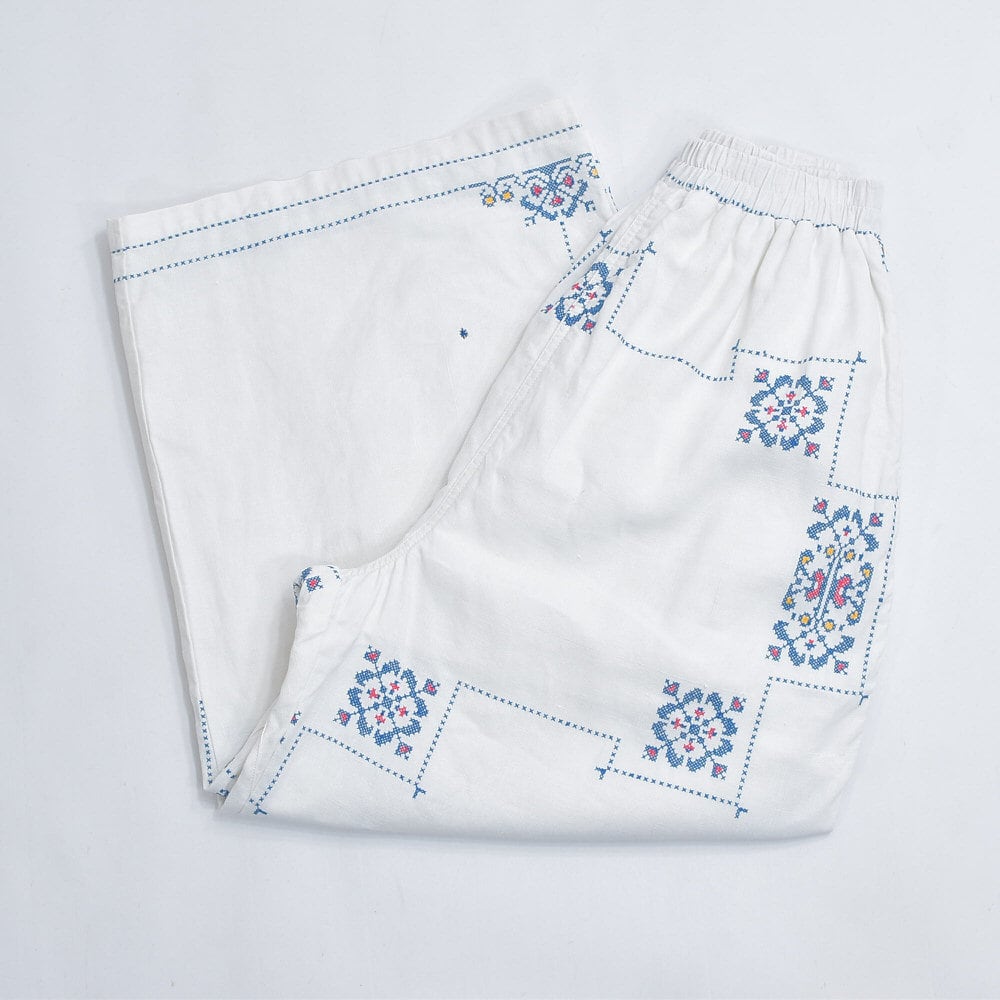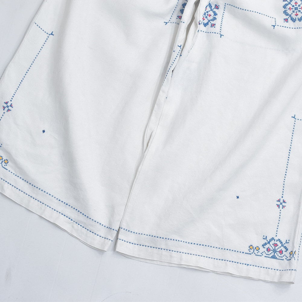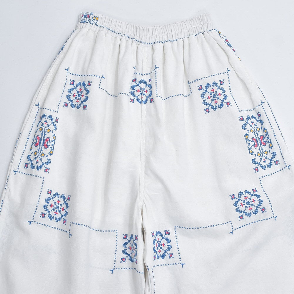 Remakeリメイク 再構築 パッチワーク&クロスステッチ フラワー刺繍 デザイン ワイドシルエット バギー パンツ リネン ホワイト 裏地付き ユニセックスデザイン W60~98cm