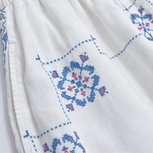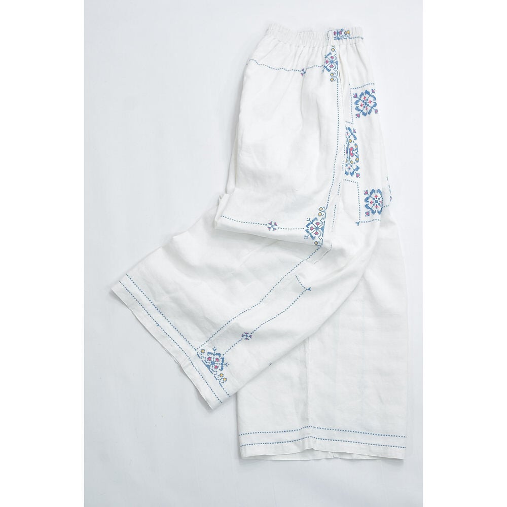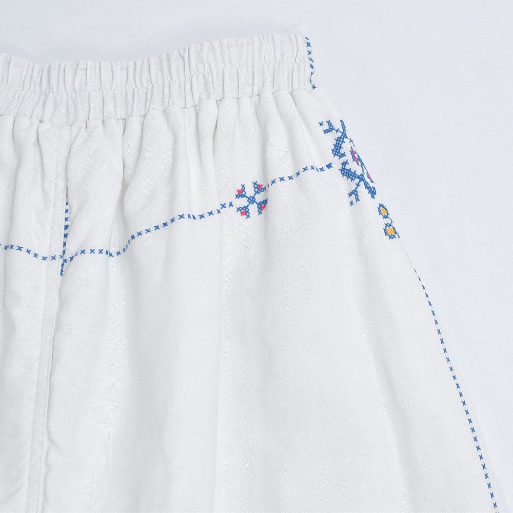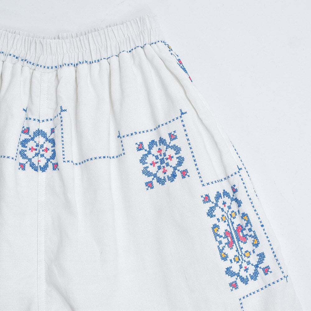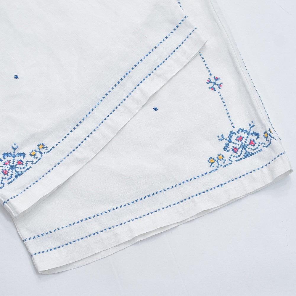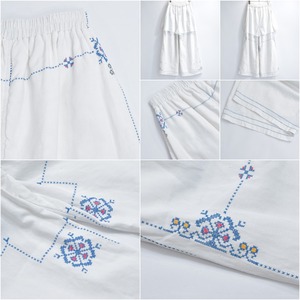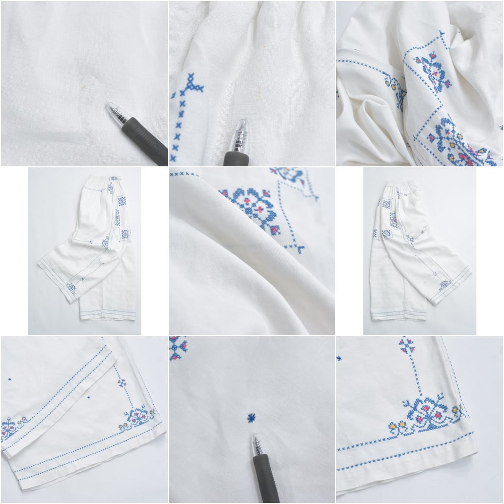 Remakeリメイク 再構築 パッチワーク&クロスステッチ フラワー刺繍 デザイン ワイドシルエット バギー パンツ リネン ホワイト 裏地付き ユニセックスデザイン W60~98cm