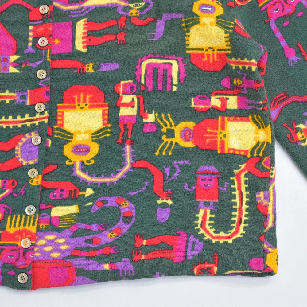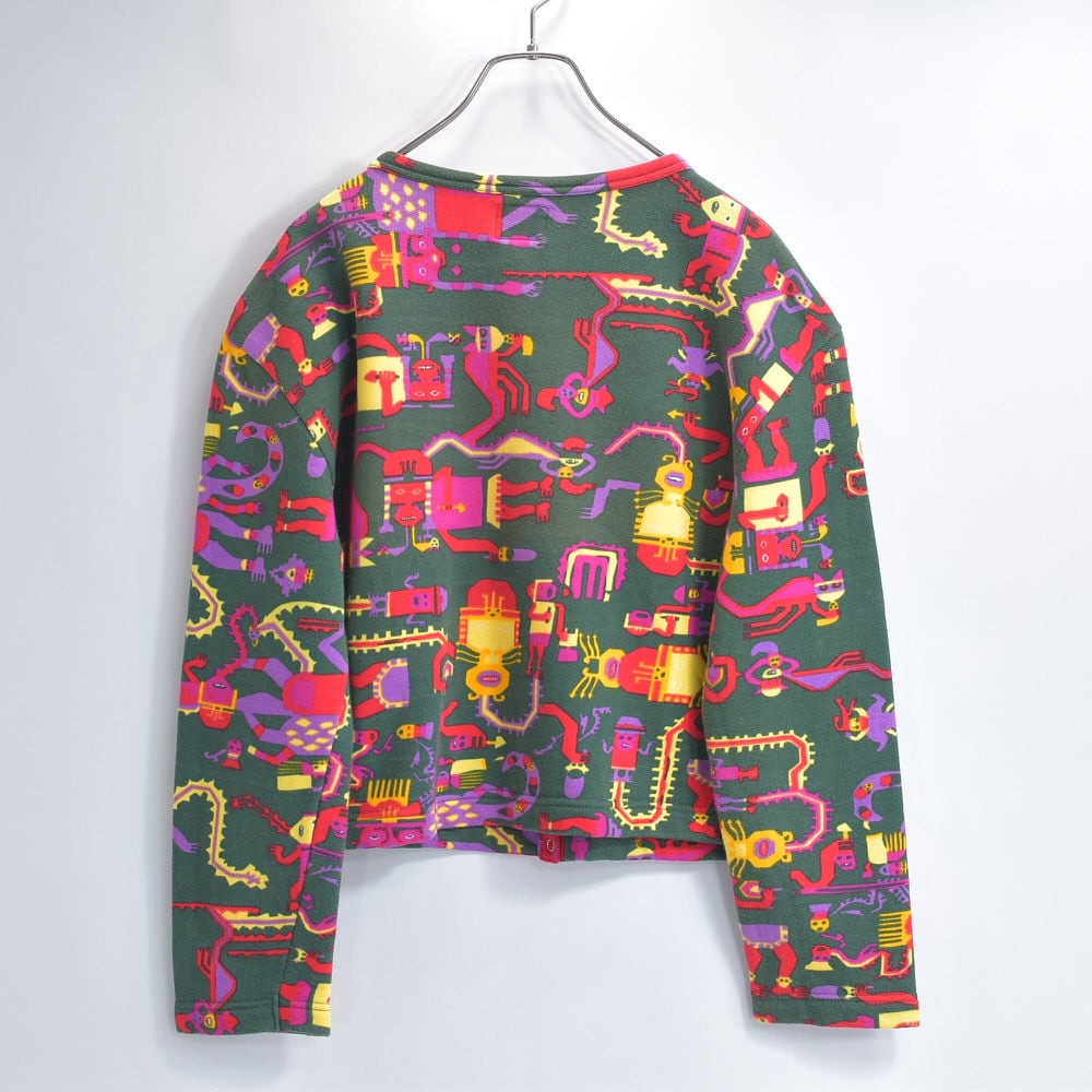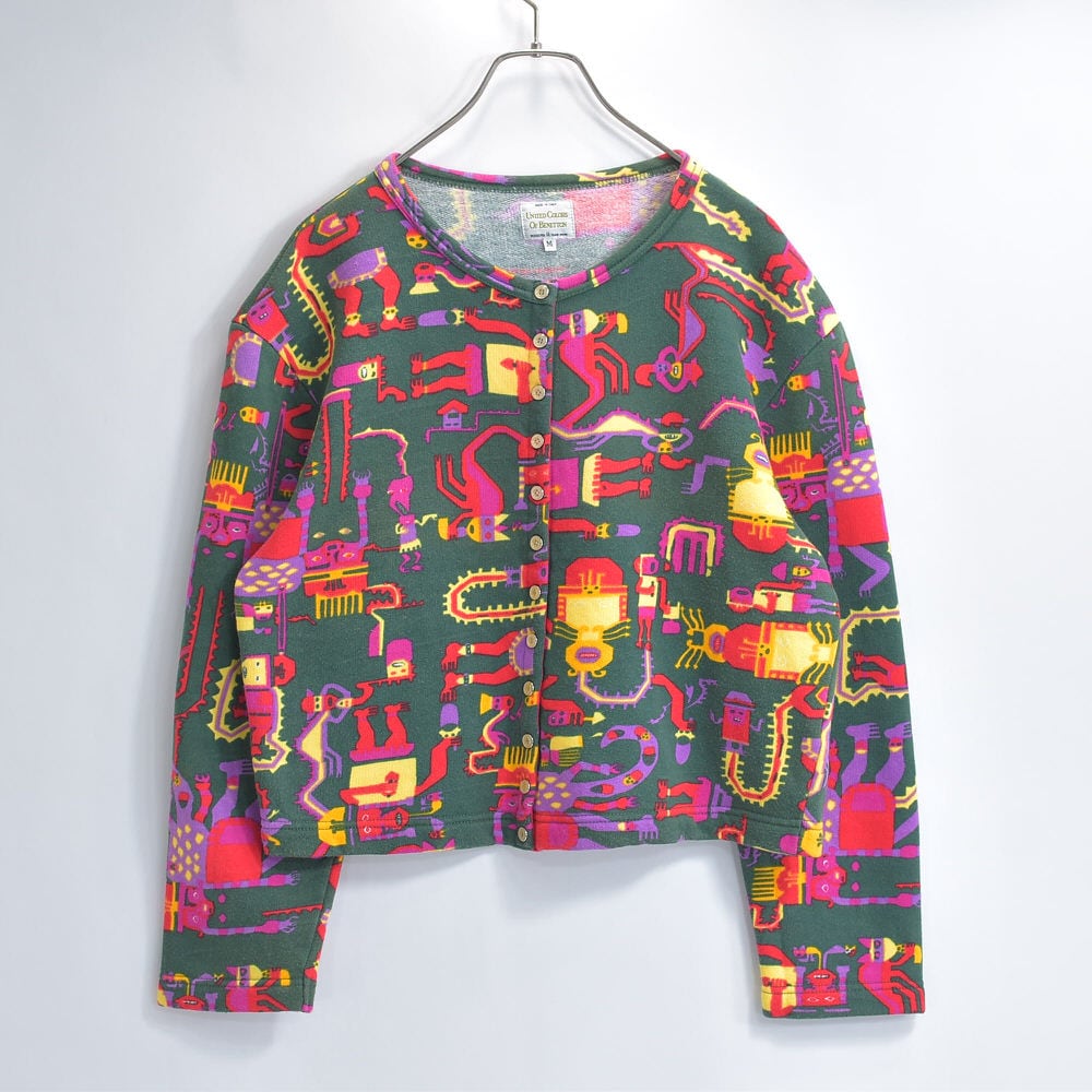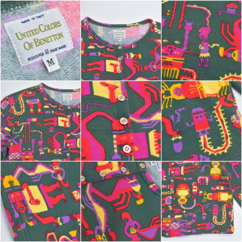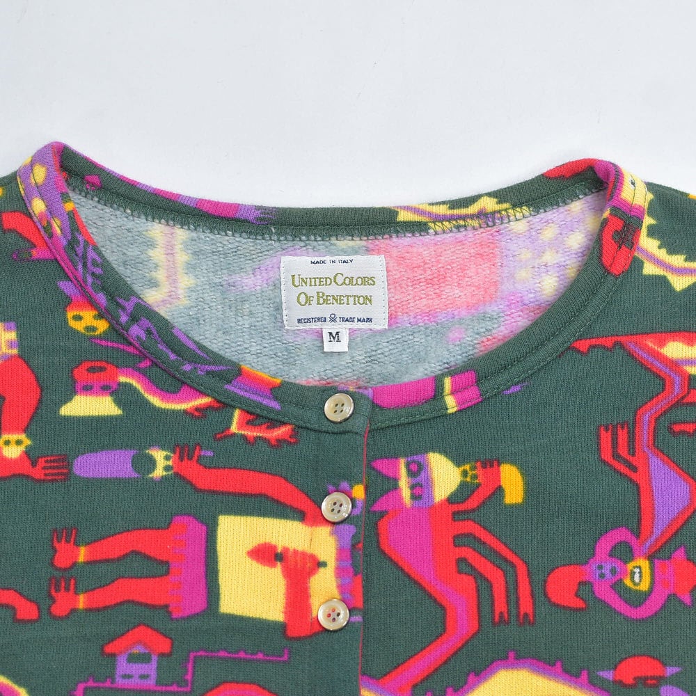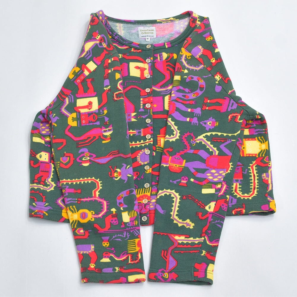 90s イタリア製 UNITED COLORS OF BENETTON ベネトン ネイティブ エスニック キャラクターデザイン スウェット カーディガン ヴィンテージ ビンテージ ヨーロッパ古着 レディースL相当