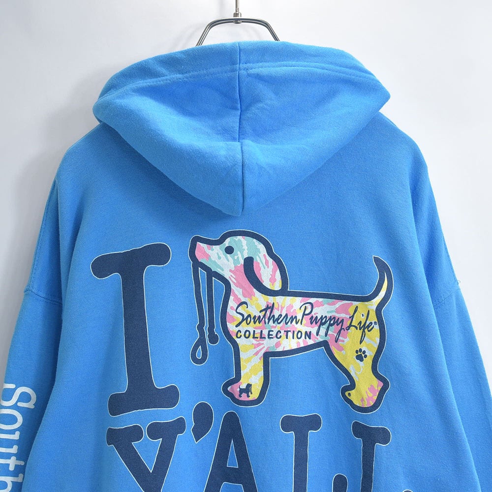 00s Pacific & Co パシフィック・アンド・コー I Y'ALL ドッグ アニマル メッセージ プリント スウェット パーカー 犬 ブルー ヴィンテージ ビンテージ 古着 メンズLサイズ