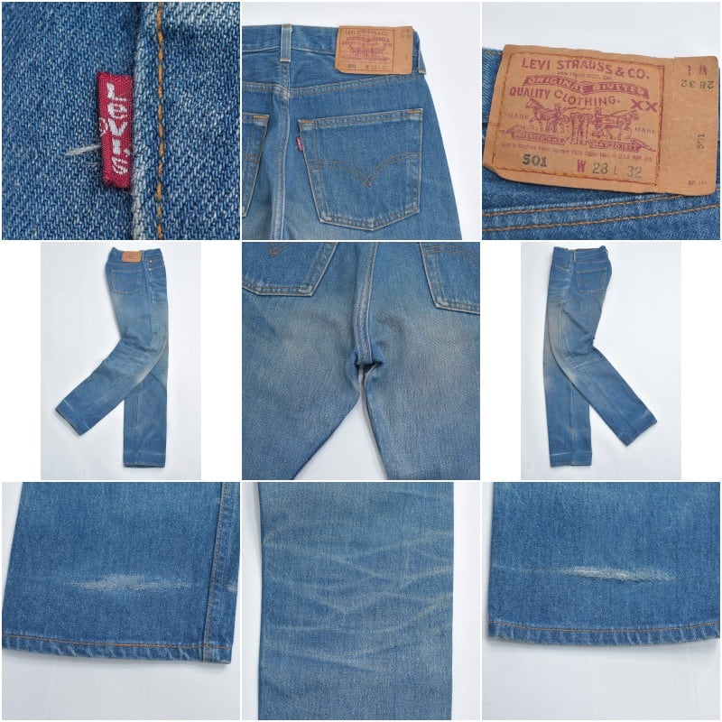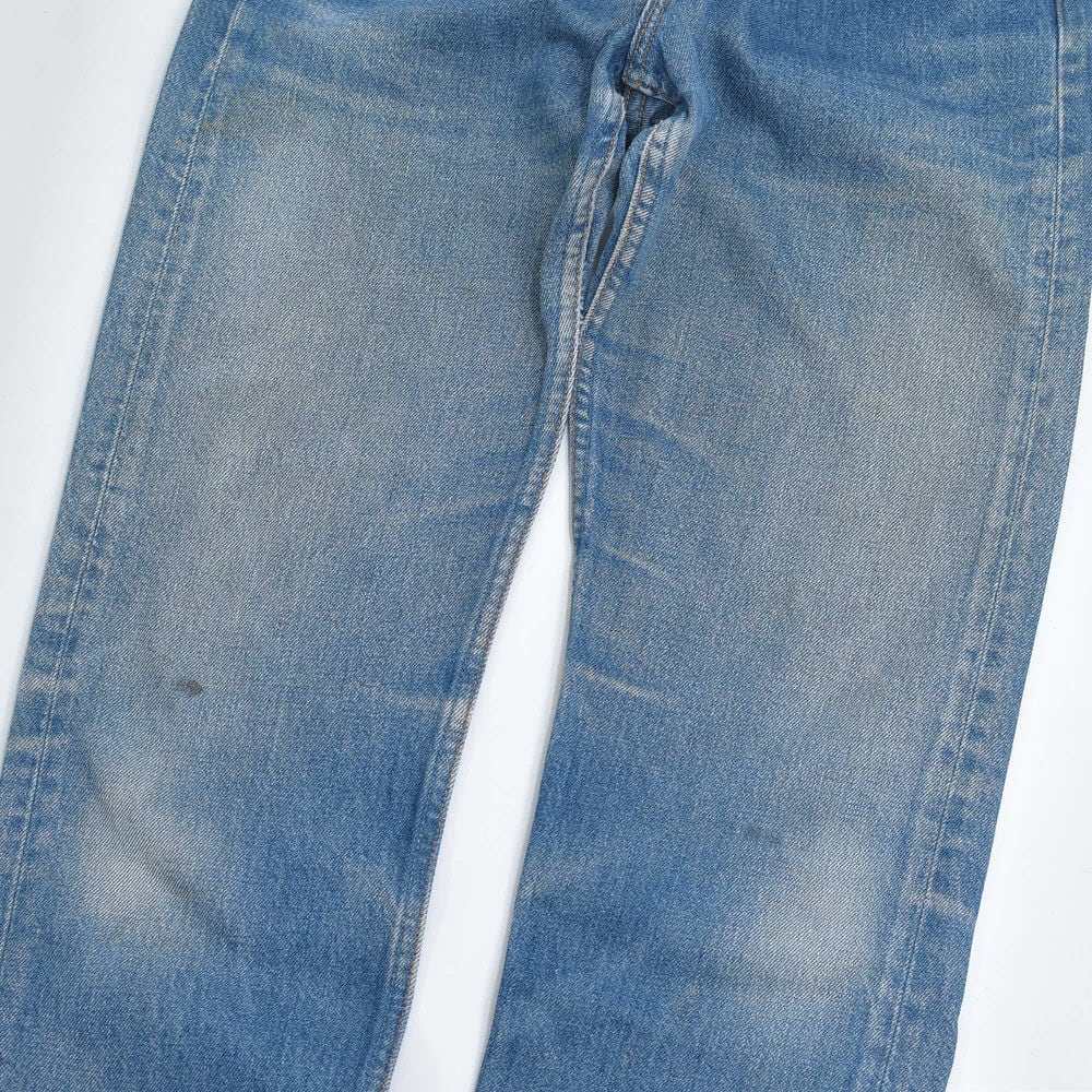 ・使用感やデニム特有の色褪せや、左太もも外側や、右太もも外側、右足首内側のシミ汚れや、両膝付近のインクのような汚れ、太ももやヒップ周りなどの薄汚れや、股下の擦れキズ、両足首周りの前後の擦れダメージなどありますが、その他目立つ汚れ、ダメージは見当たらず、日常的に古着を着用されている方であれば、問題無く着用して頂けると思います