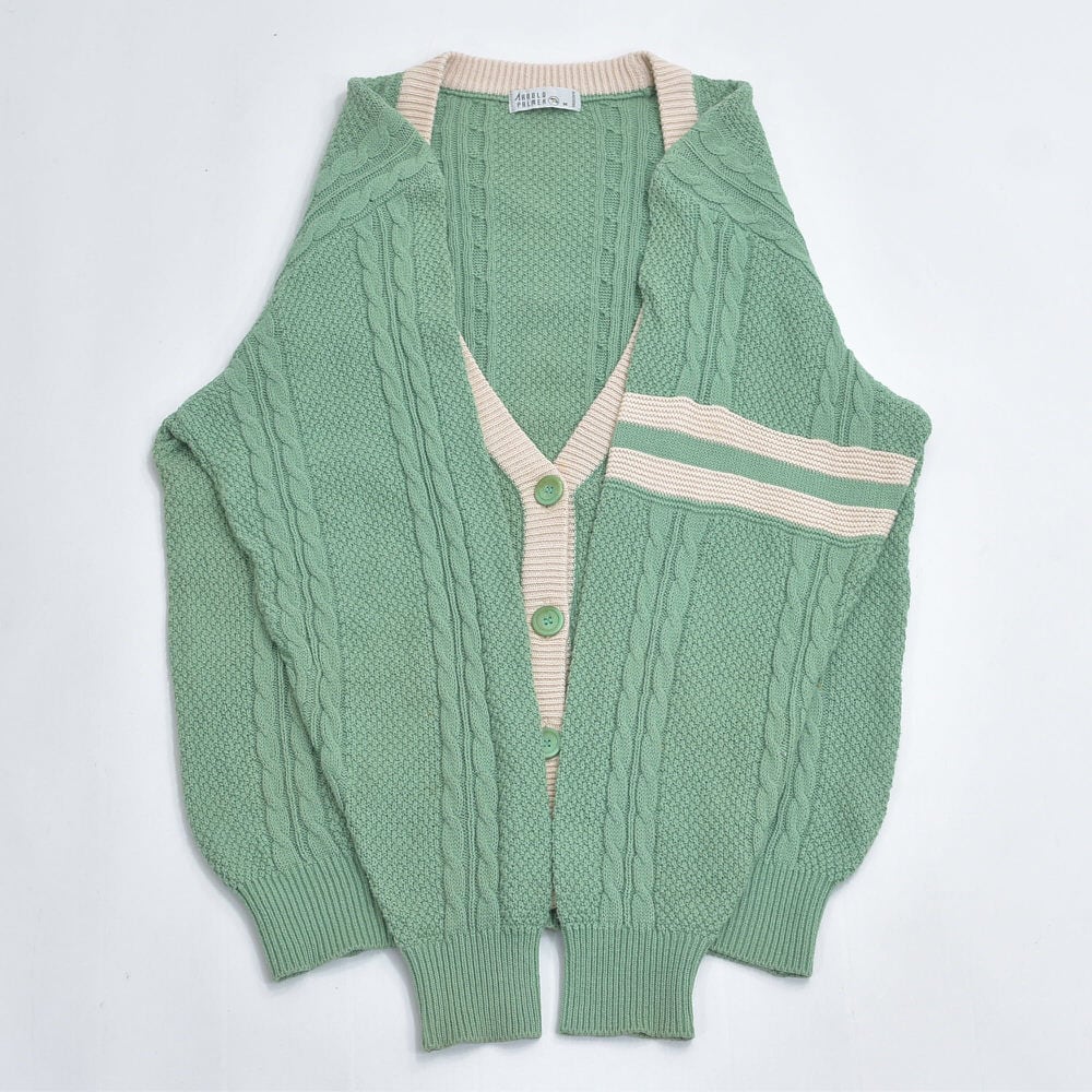 90s〜 Arnold Palmer アーノルドパーマー コットン ケーブル編み ライン 切替 デザイン ニット カーディガン ミントグリーン ジャパンヴィンテージ ビンテージ 古着 レディースMサイズ
