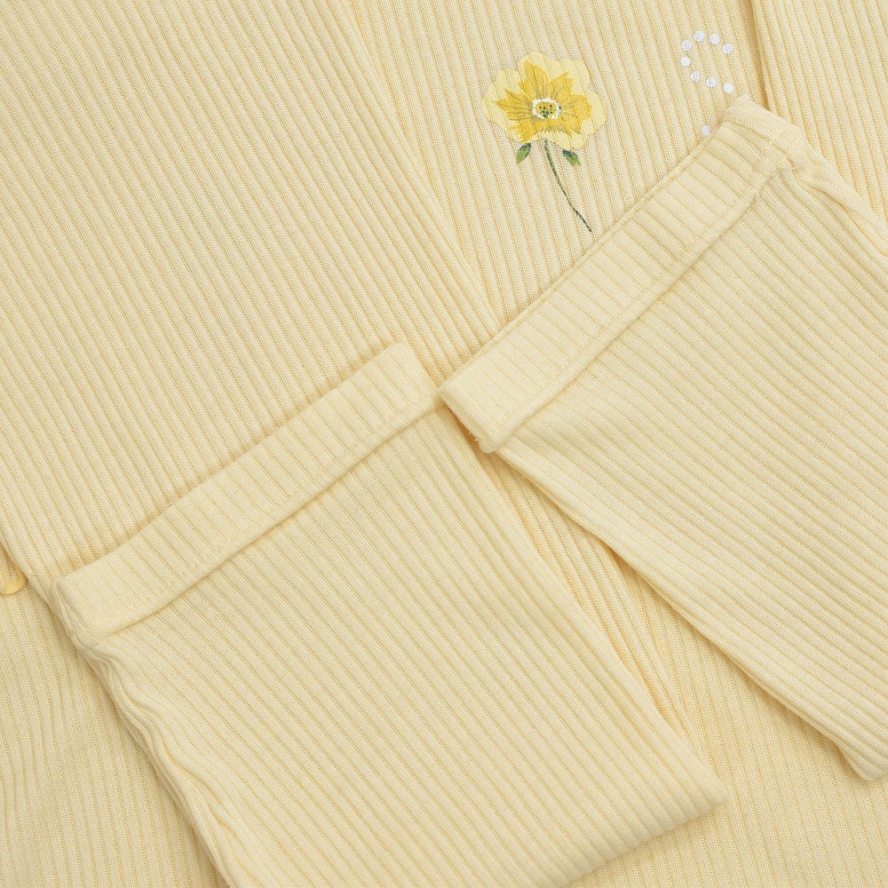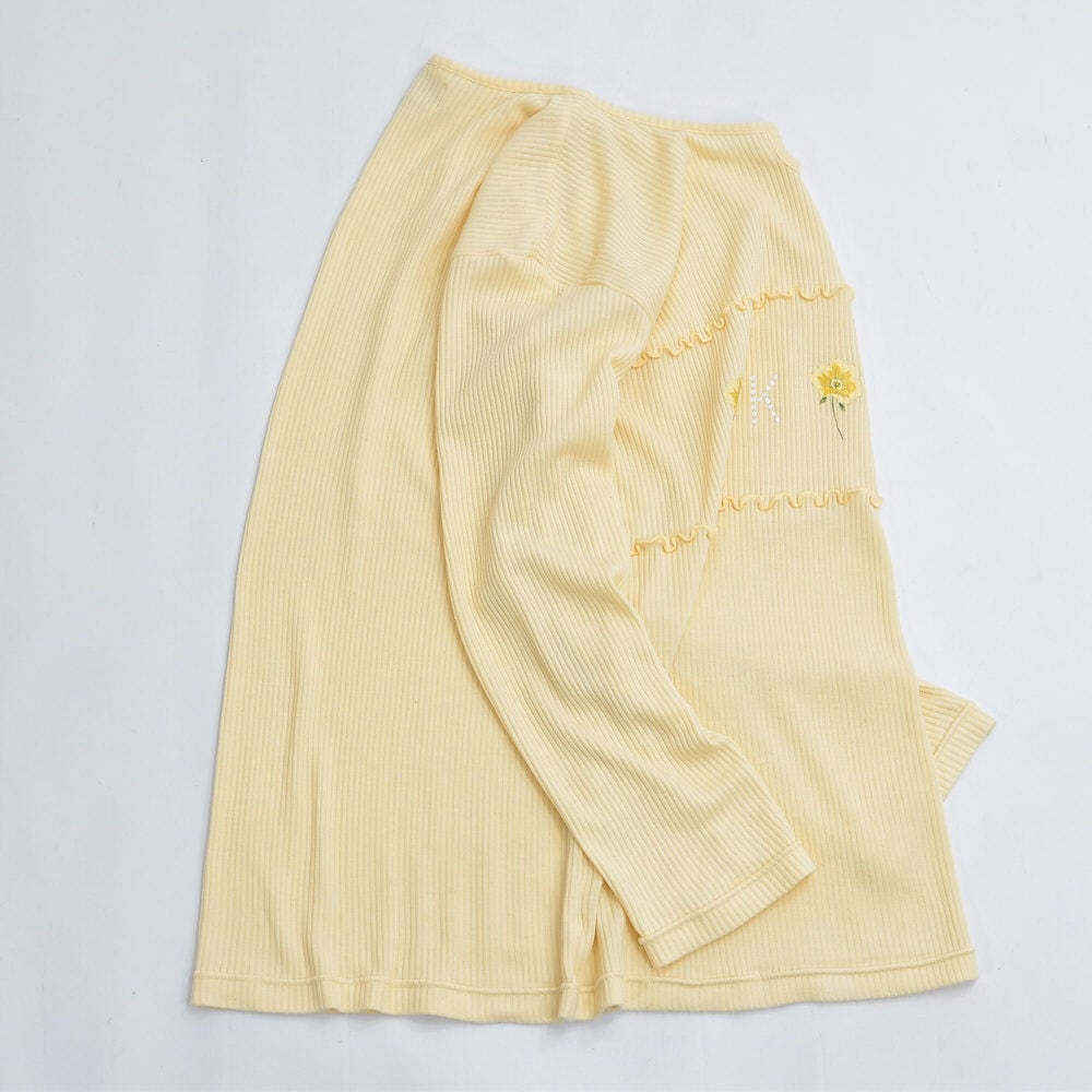 90~00s K'si ケイシ メローステッチ フラワープリントデザイン ペールイエロー リブカットソー 薄手 パステルカラー レトロ ジャパンヴィンテージ ビンテージ 古着 レディースXL相当