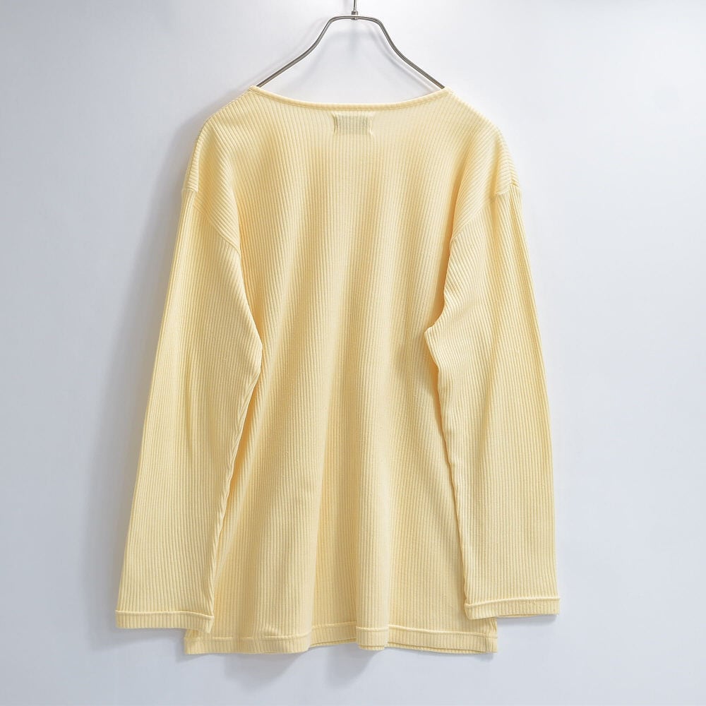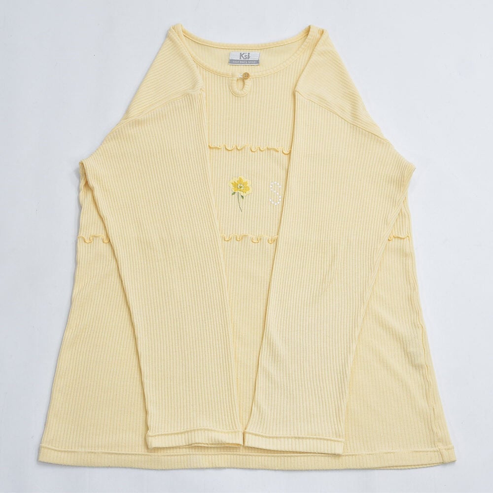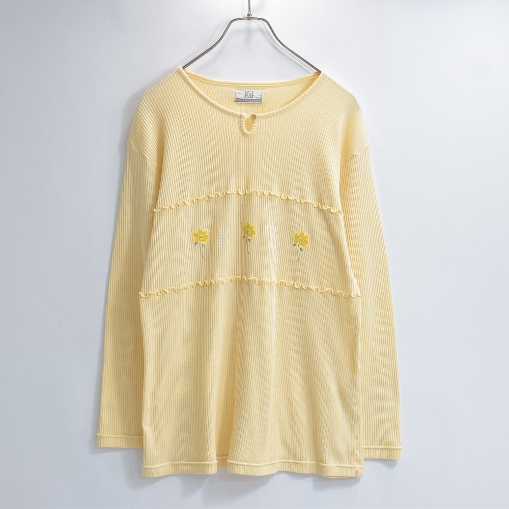 90〜00s K'si ケイシ メローステッチ フラワープリントデザイン ペールイエロー リブカットソー 薄手 パステルカラー レトロ ジャパンヴィンテージ ビンテージ 古着 レディースXL相当