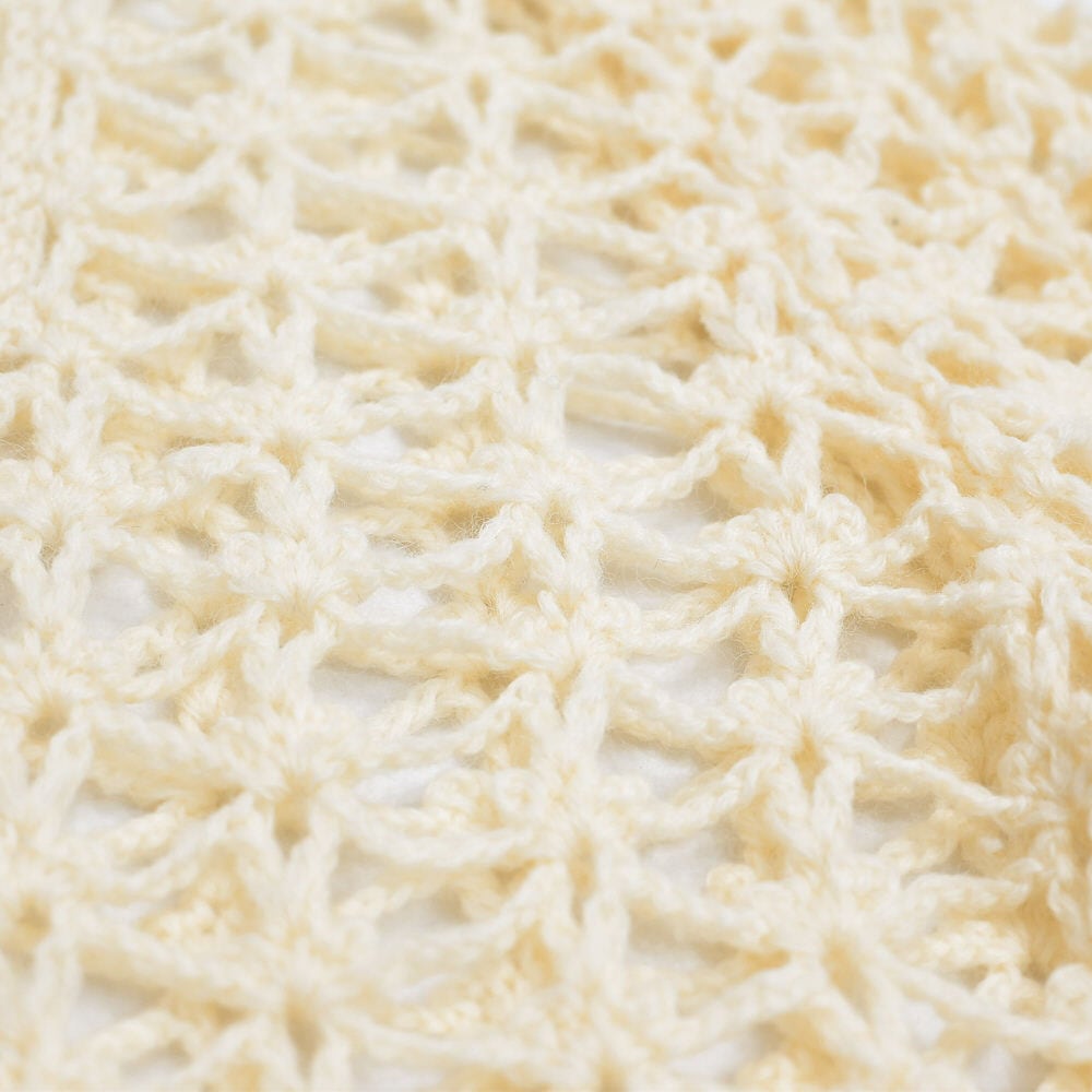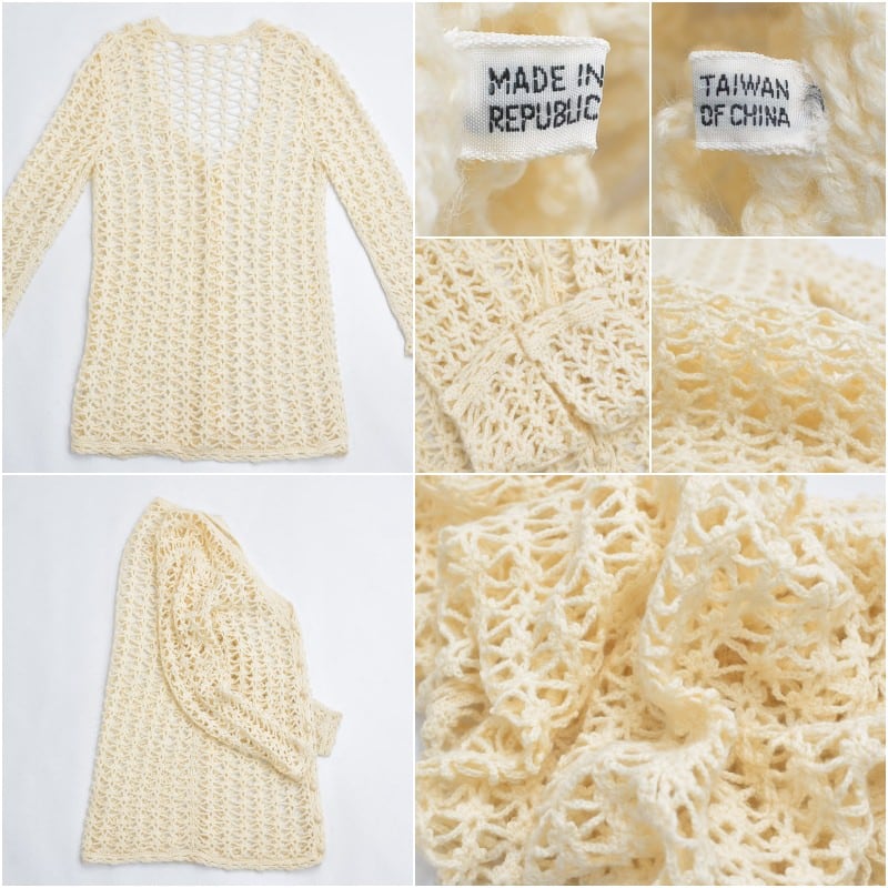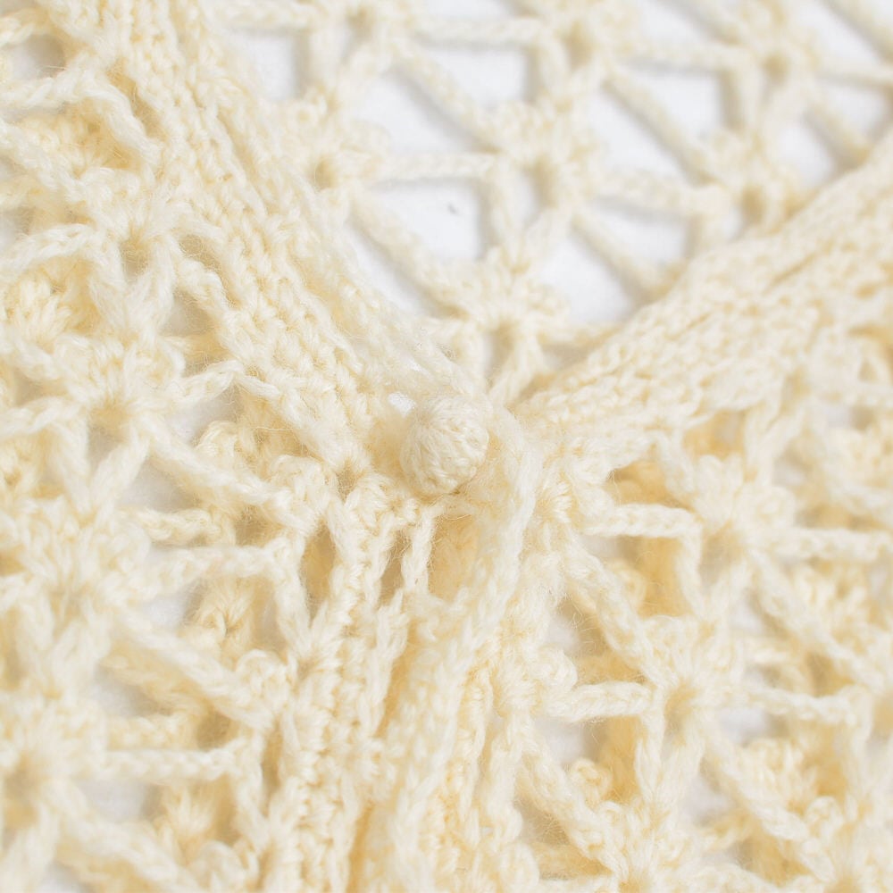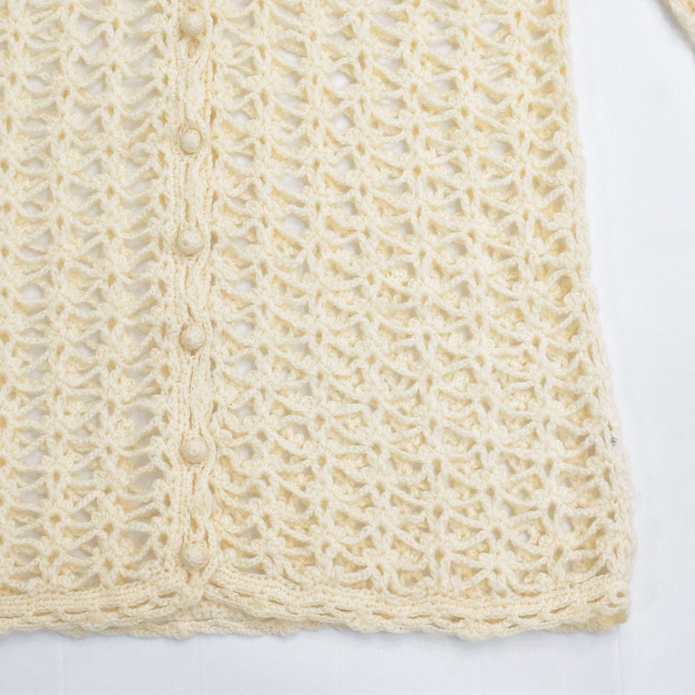 70〜80s Crochet Knit Cardigan クロシェニット 透かし編み Vネック ロングカーディガン ヴィンテージ ビンテージ アイボリー 古着 レディースL相当